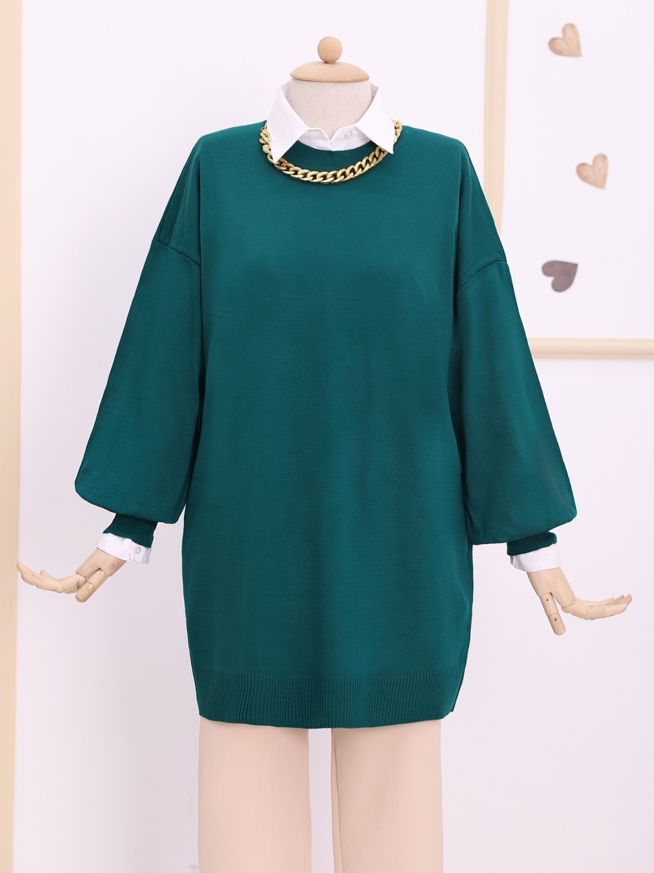 من بين أكثر موديلات الموسم الجديد رواجًا من بين الموديلات الأكثر شهرة في الموسم الجديد ، بياقة الطاقم ، وأكمام بالون ، وتونيك تريكو منخفض الكتف.