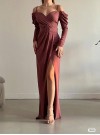 Omuzu Taşlı Yırtmaçlı Elbise -Taba
