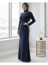 Yakası Taş Detaylı Omuzu Kat Drapeli Abiye -Laci