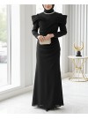 Broşlu Düşük Omuz Uzun Elbise -Siyah