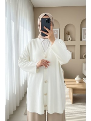V Yaka Düğmeli Oversize Triko Hırka -Ekru