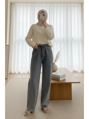 Beli Lastikli Cepli Bol Paça Kot Pantolon -Füme