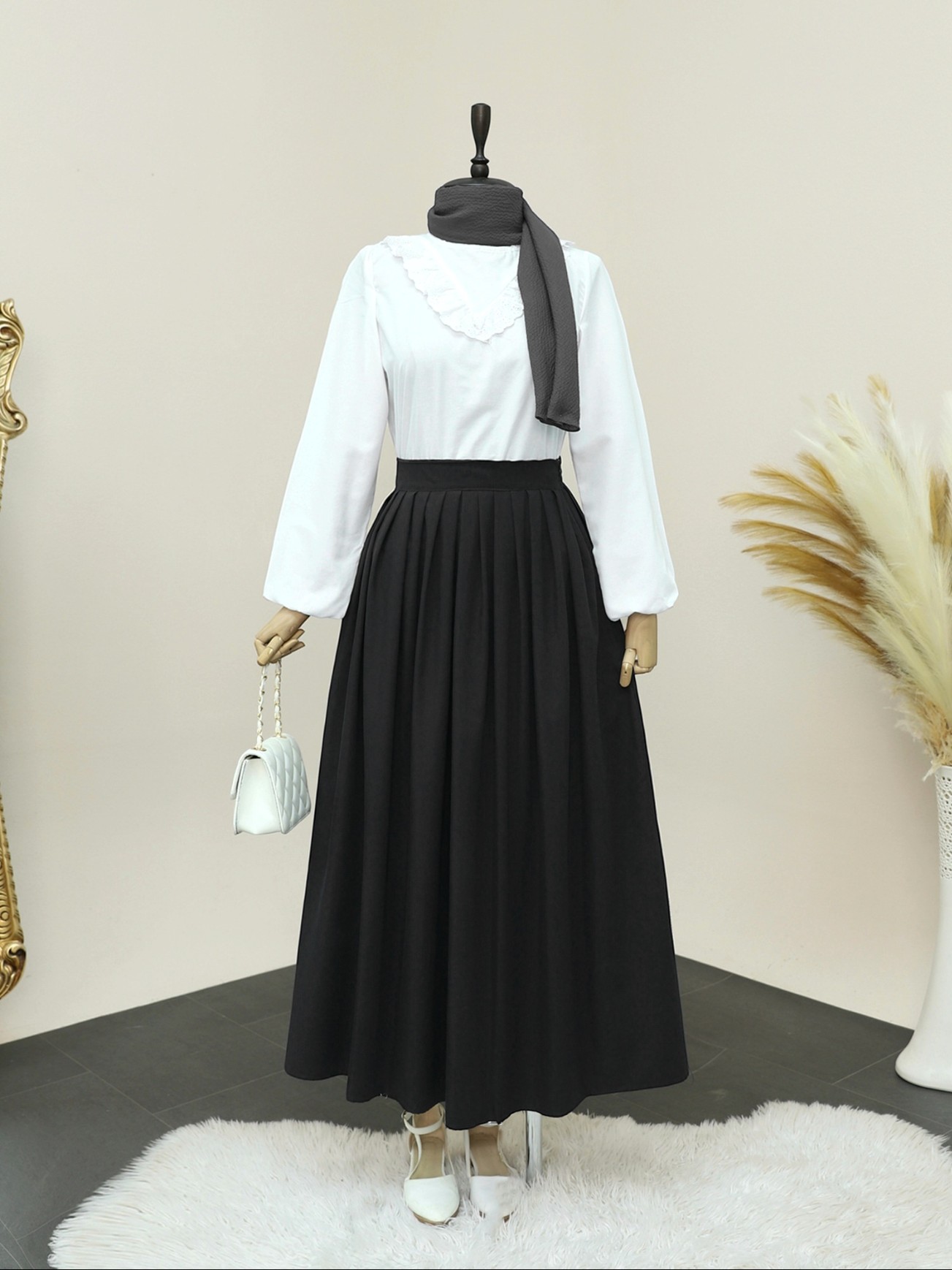 Belden Büzgülü Kloş İthal Paraşüt Etek -Siyah