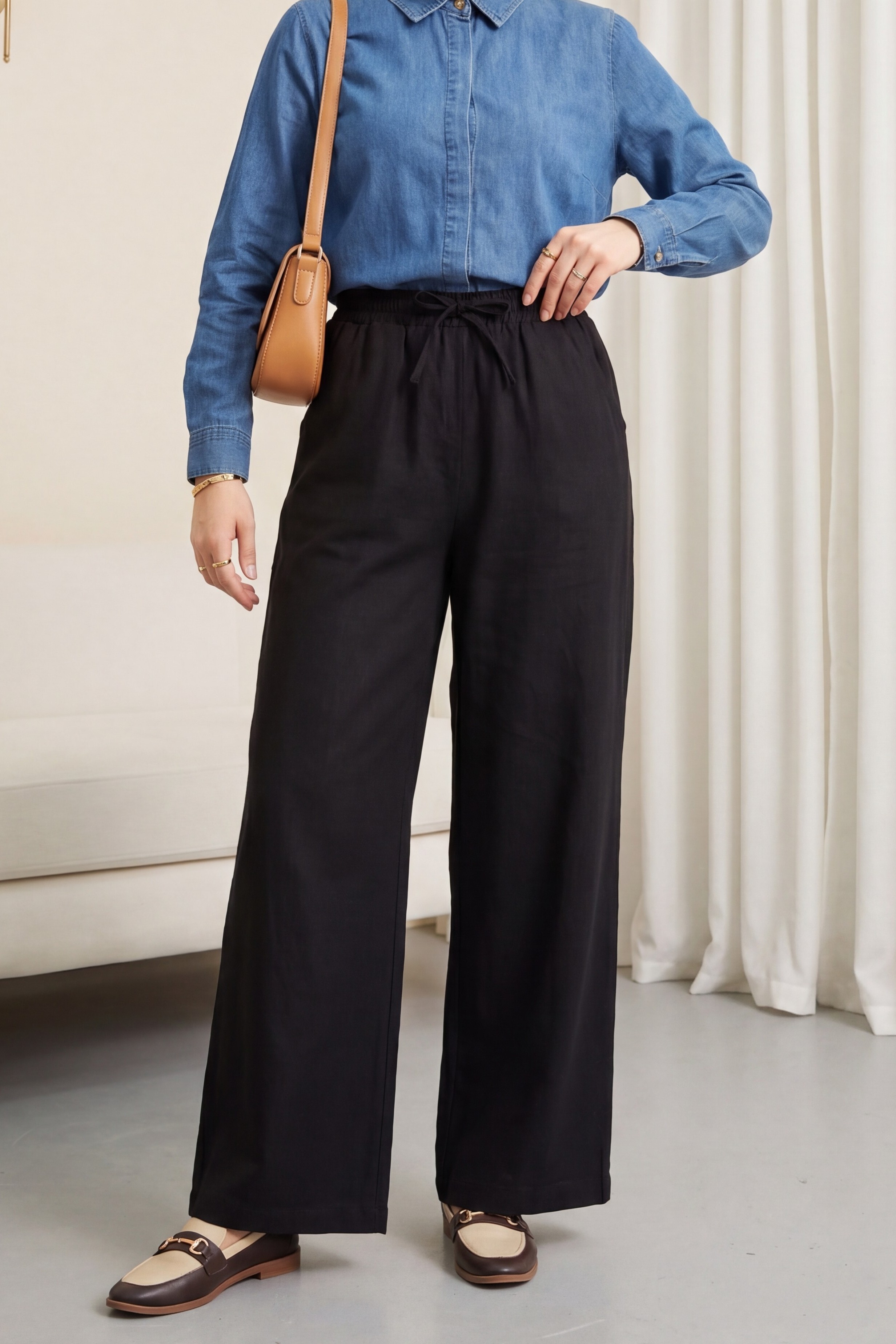 Beli Lastikli Bağcık Detaylı Cepli Bol Paça Tensel Pantolon, hafif tensel kumaşı ve bol paça kesimiyle gün boyu konfor sunar. Şık bağcık detayı ve cepleriyle hem pratik hem stil sahibi bir görünüm sağlar.
