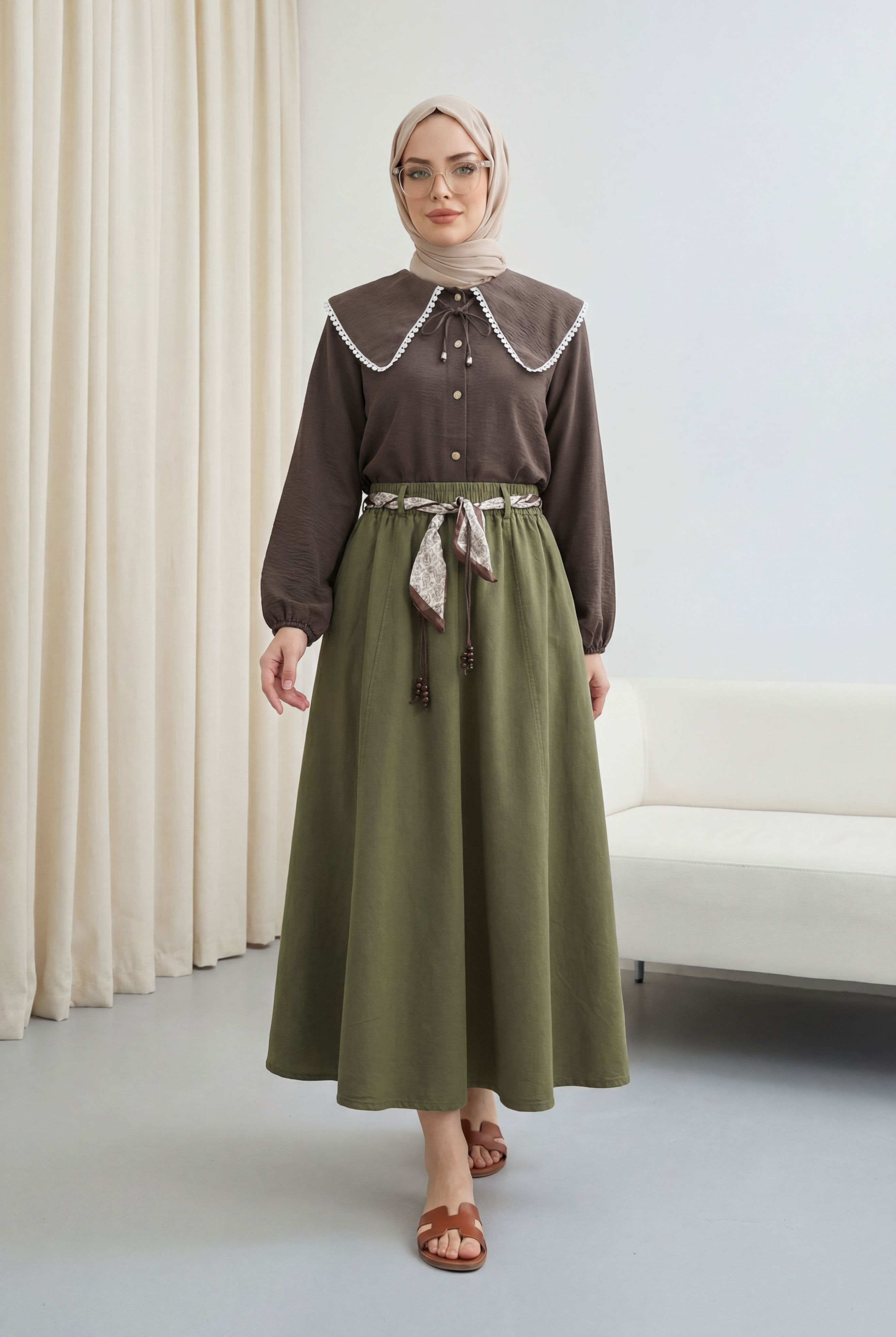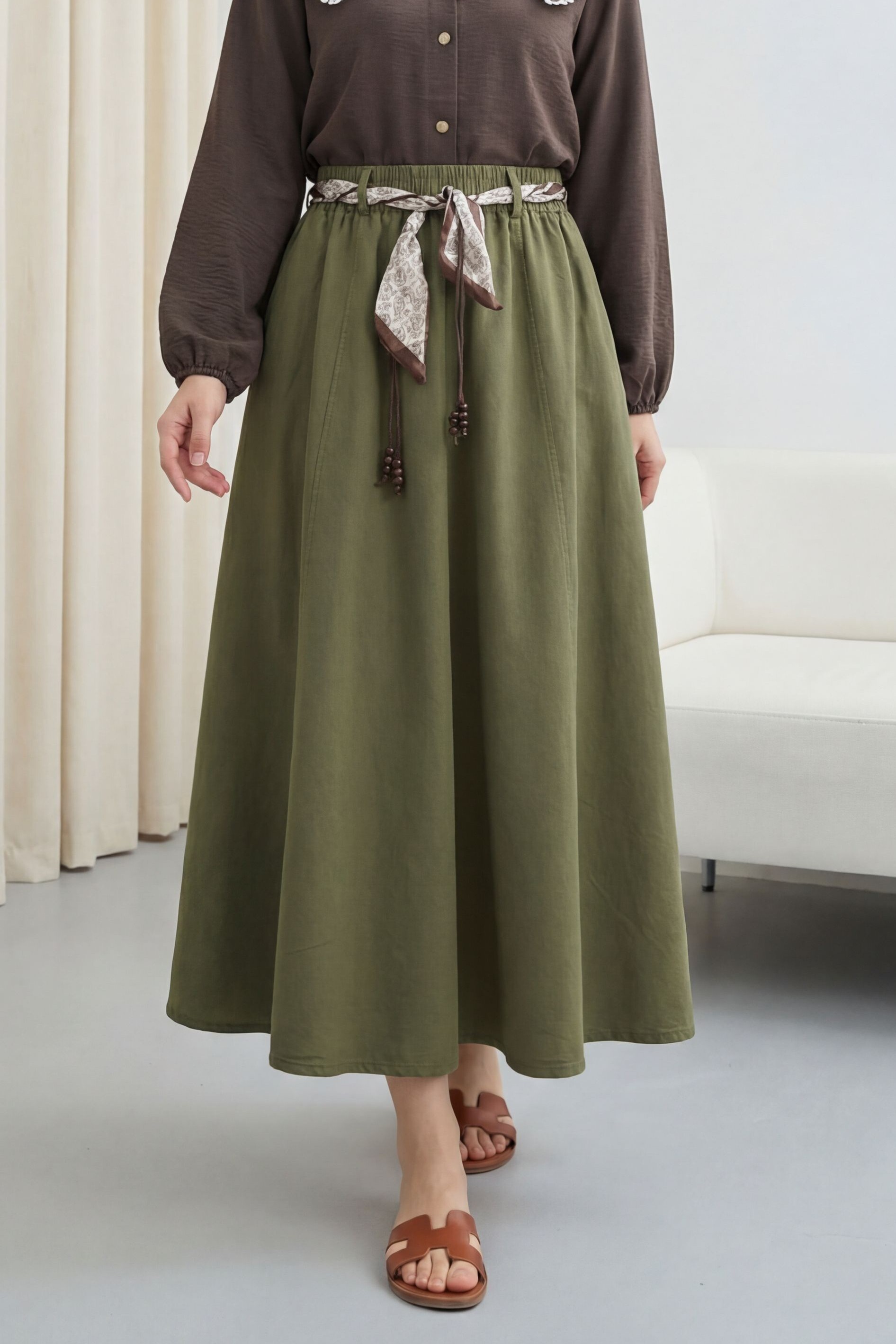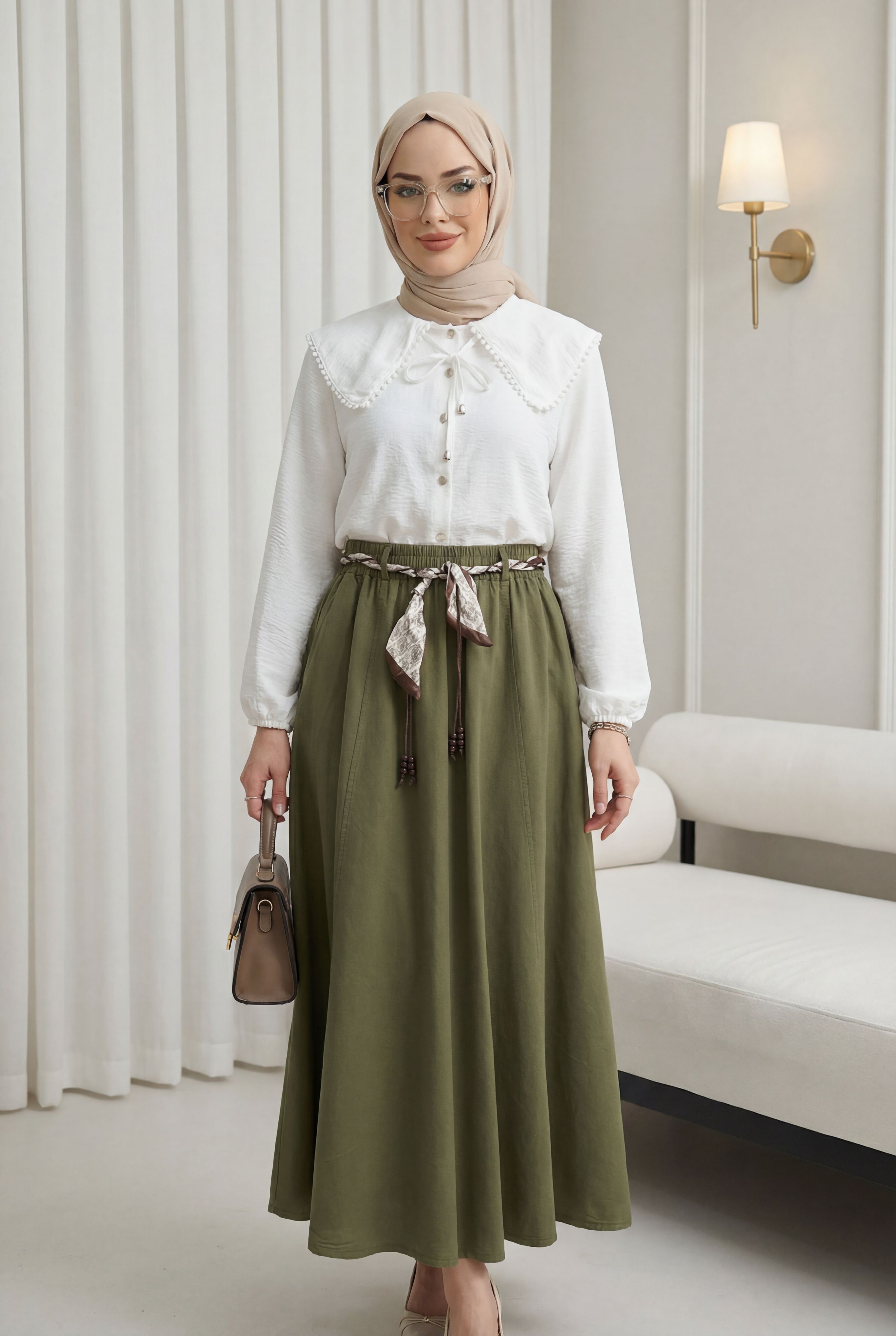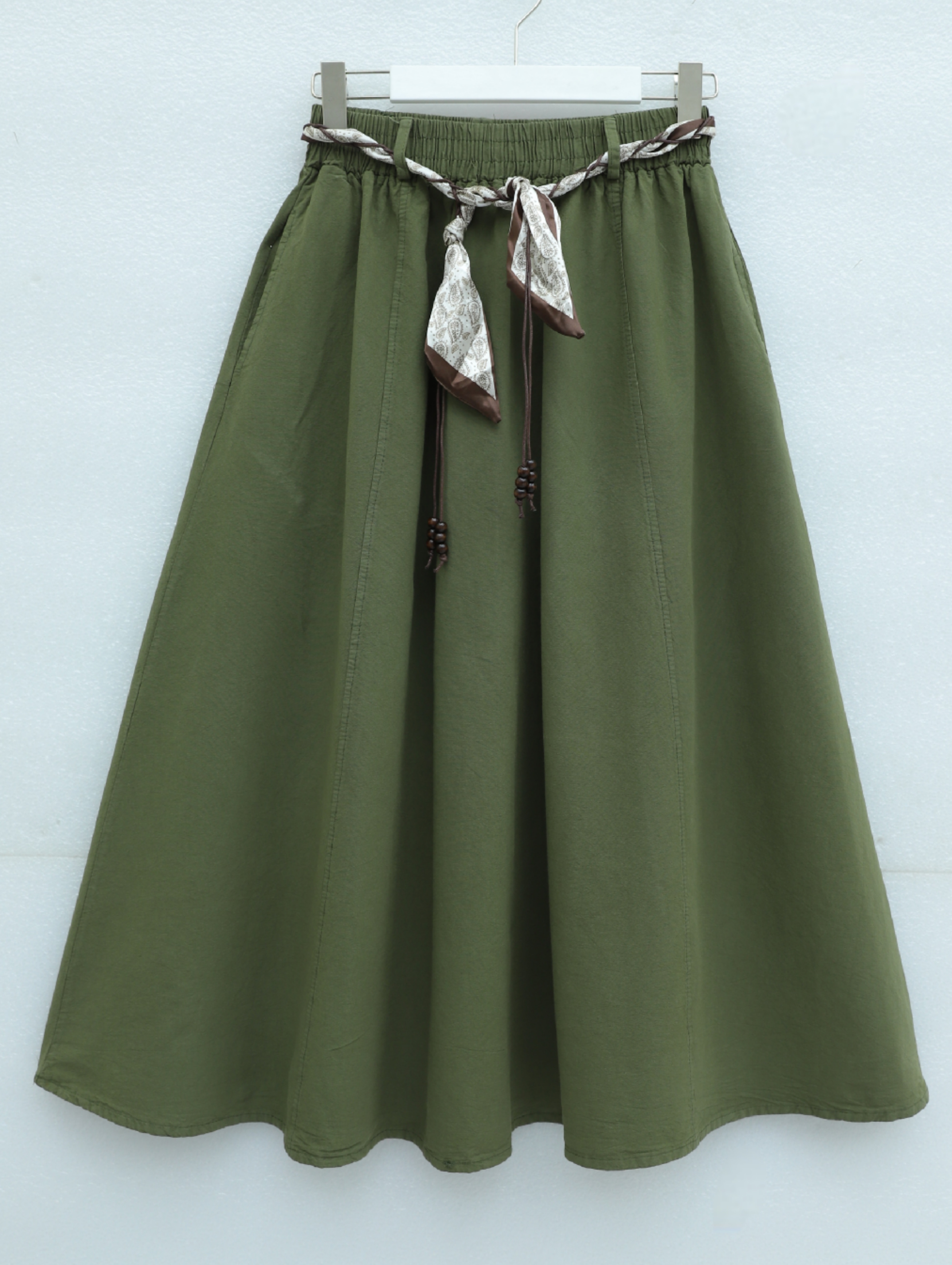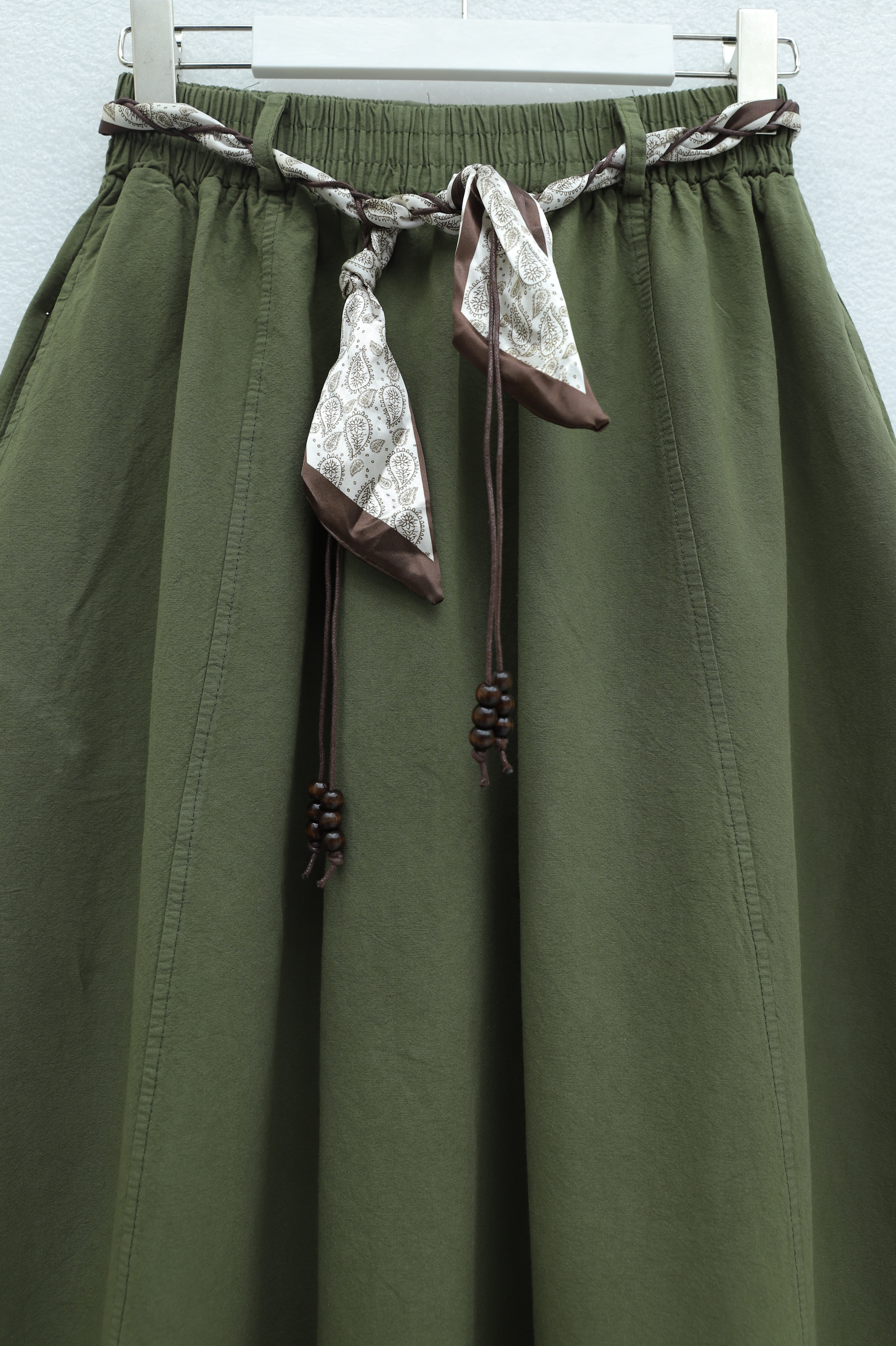 Beli Lastikli Kemerli Cepli Keten Etek -Haki