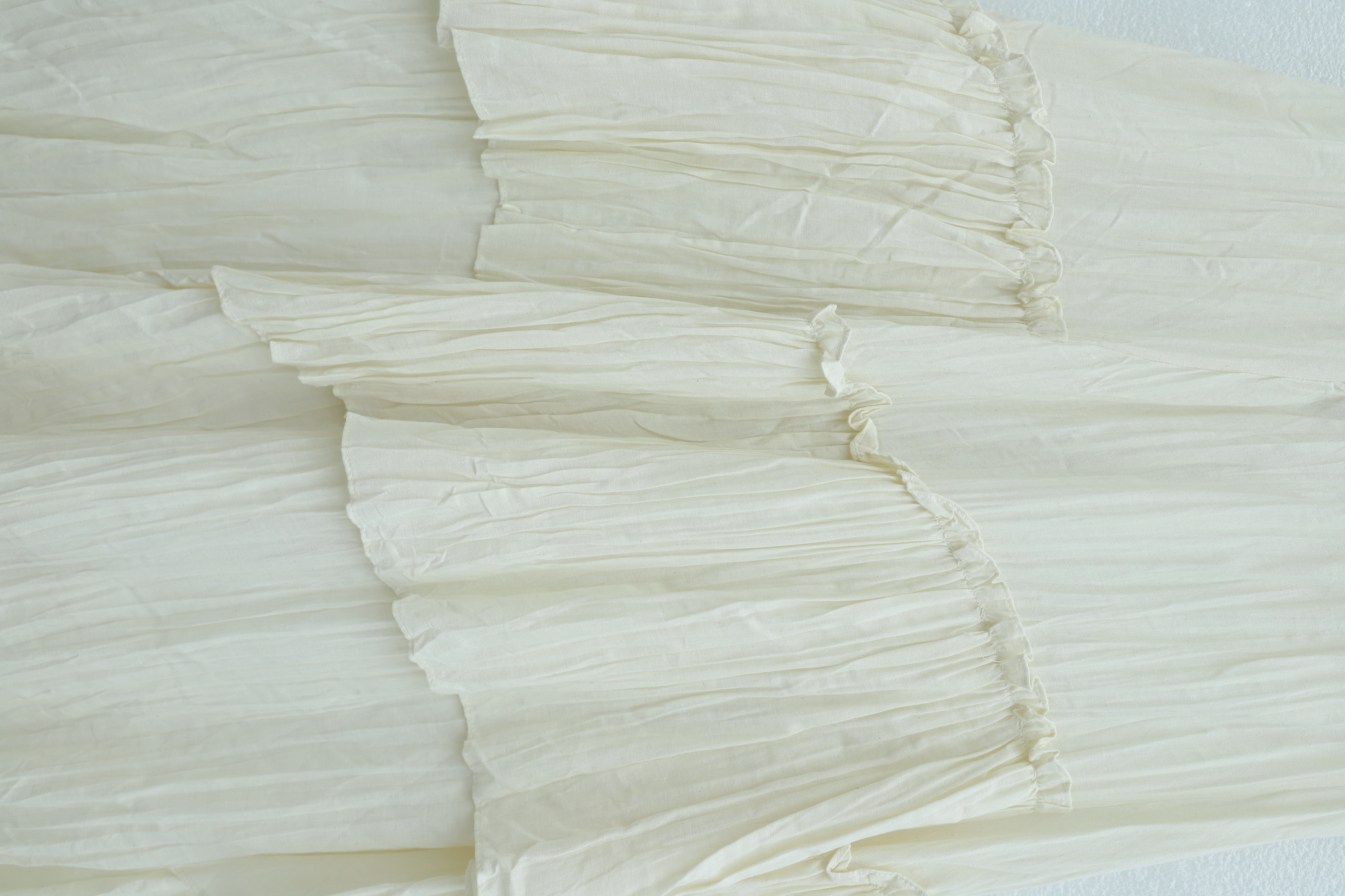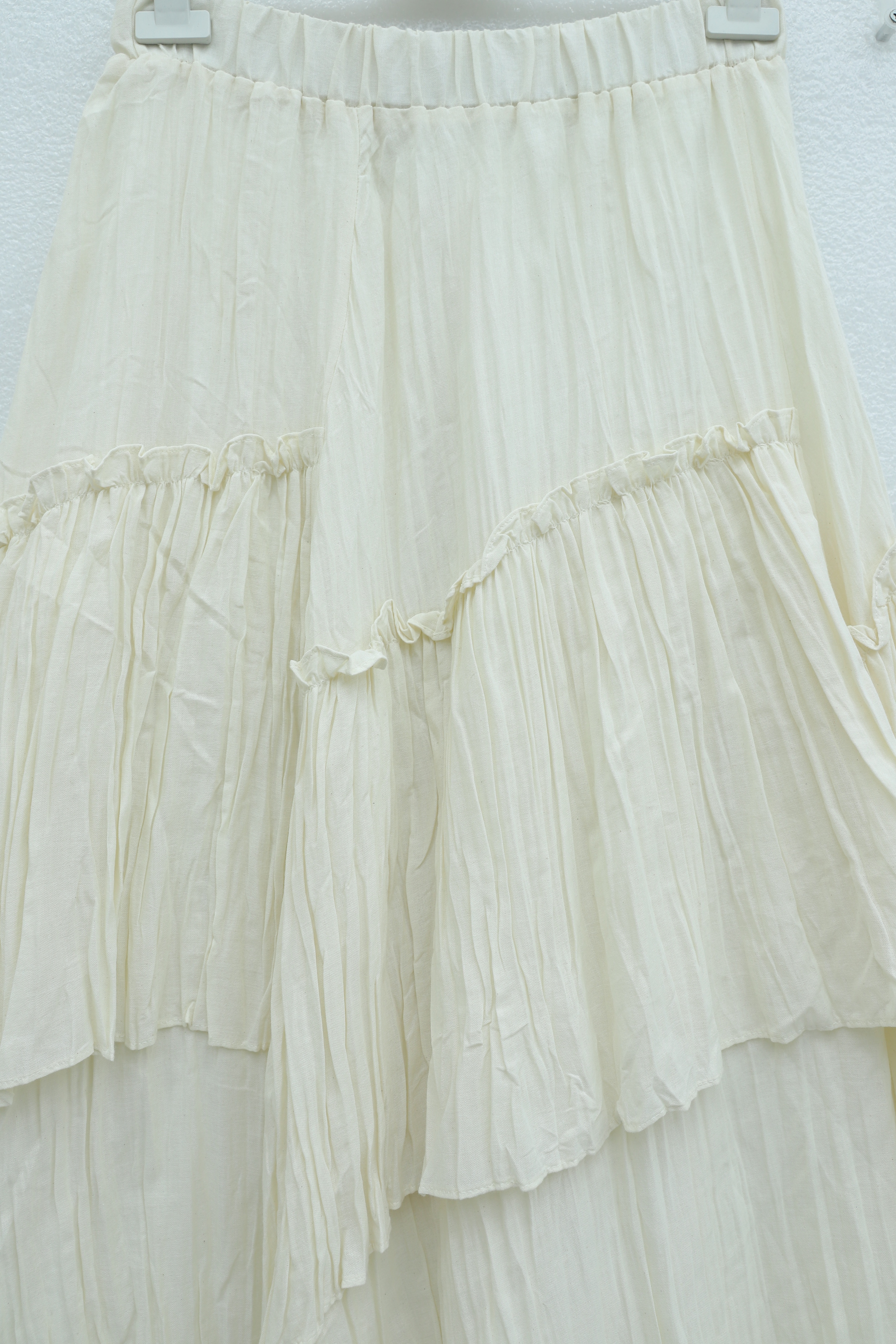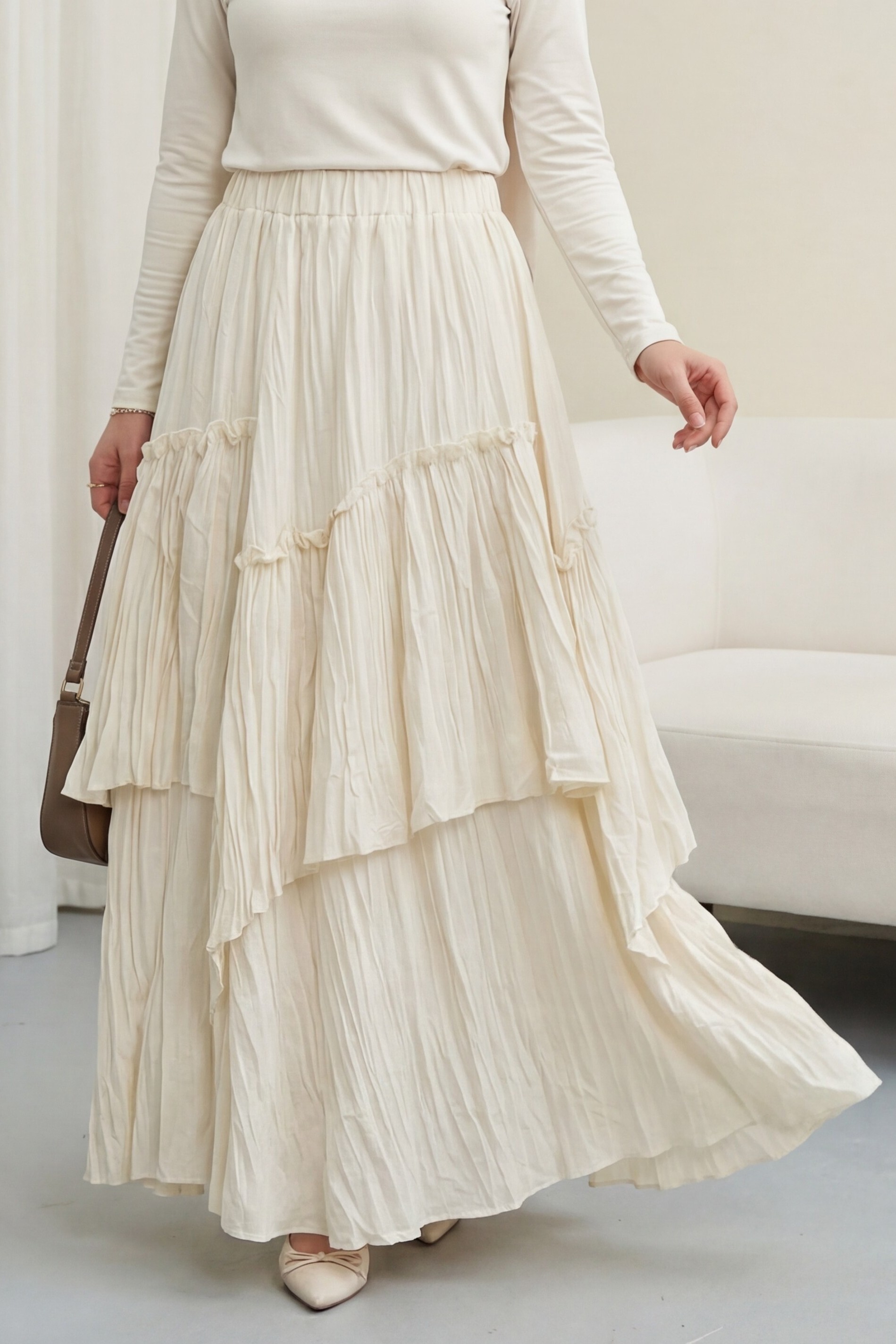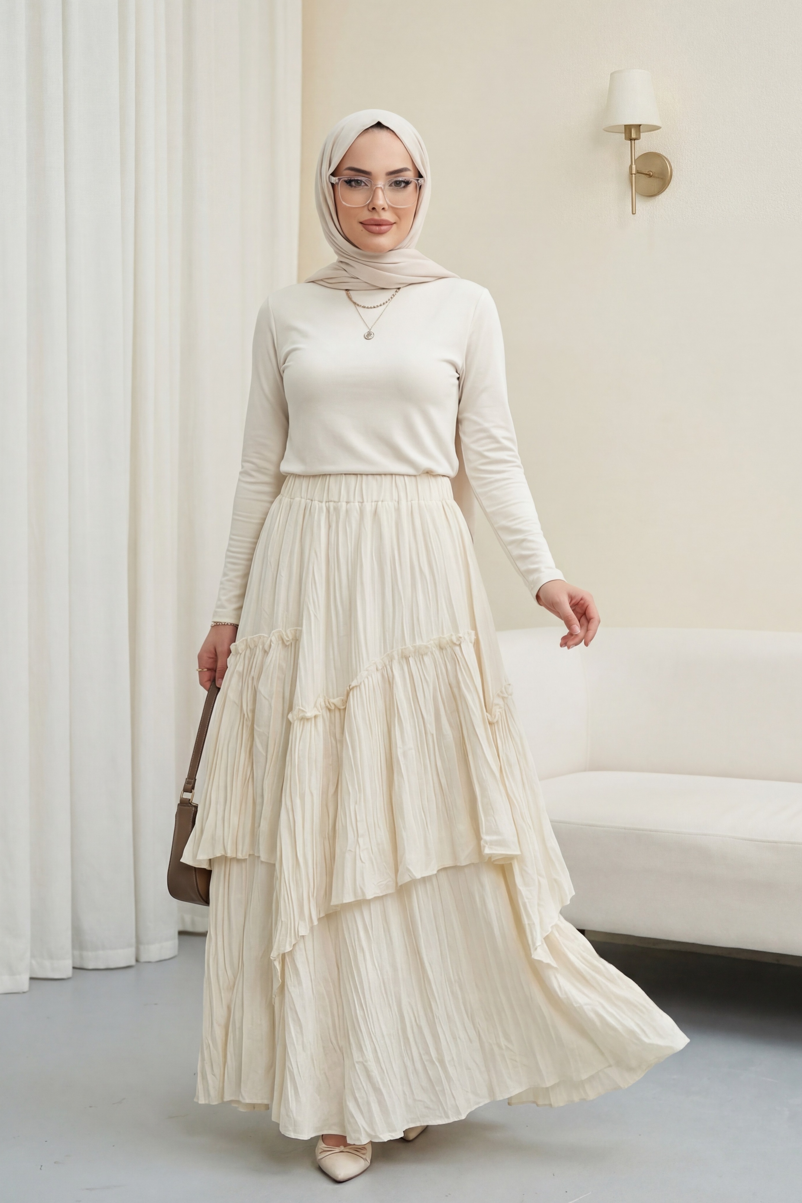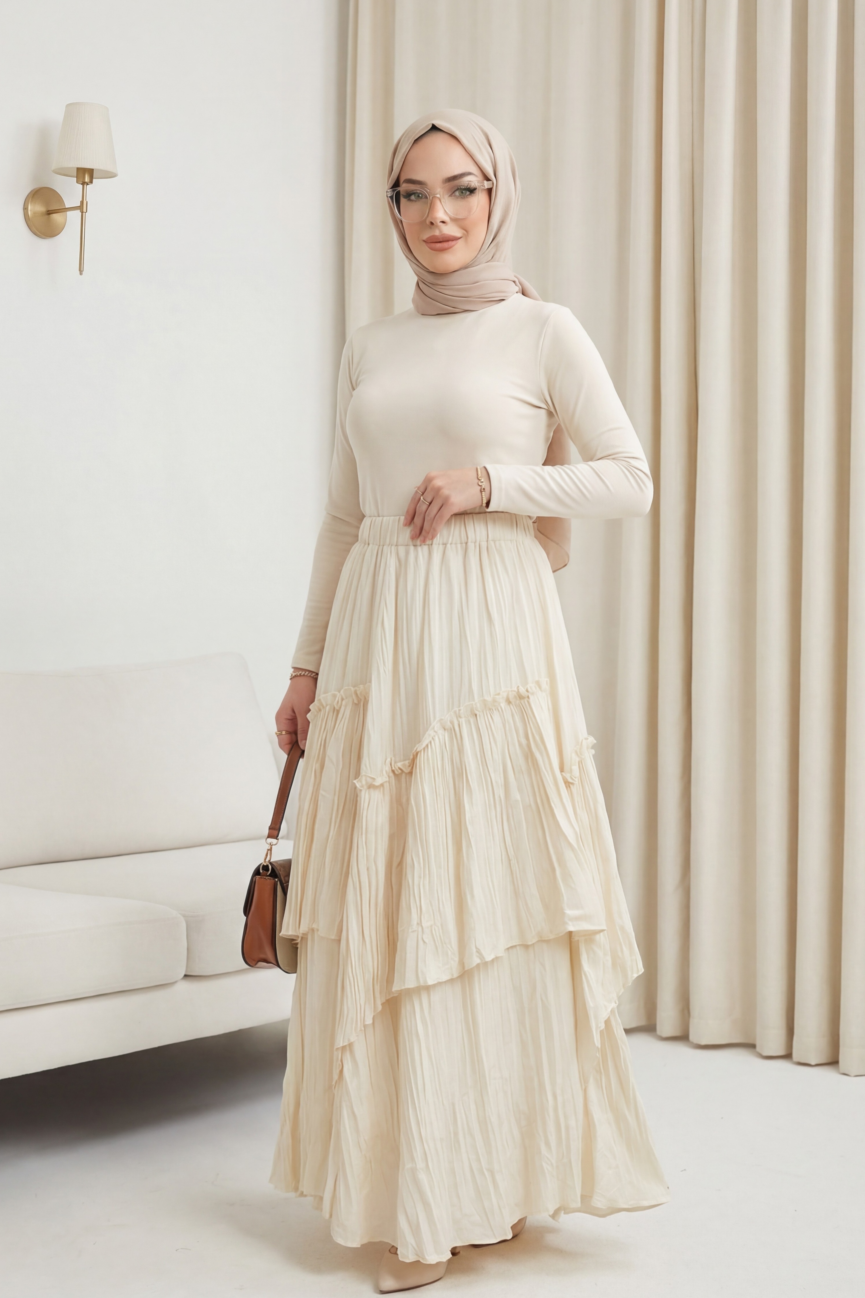 Beli Lastikli Keten Vual Katlı Etek -Ekru