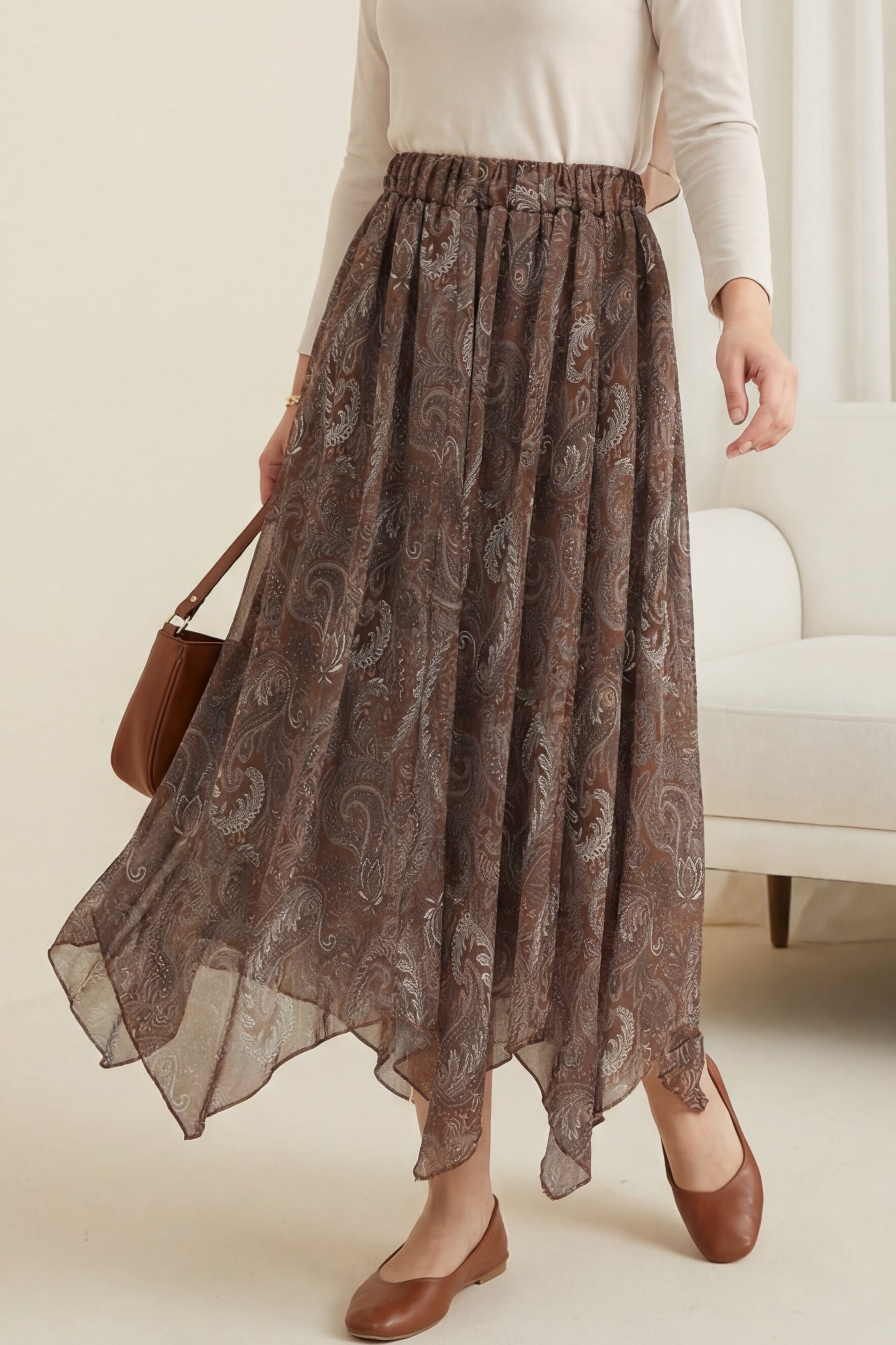 “Etnik desenli şifon etek”, “asimetrik kesim etek”, “beli lastikli kadın etek”, “astarlı şık etek modeli” gibi adlandırılabilir.