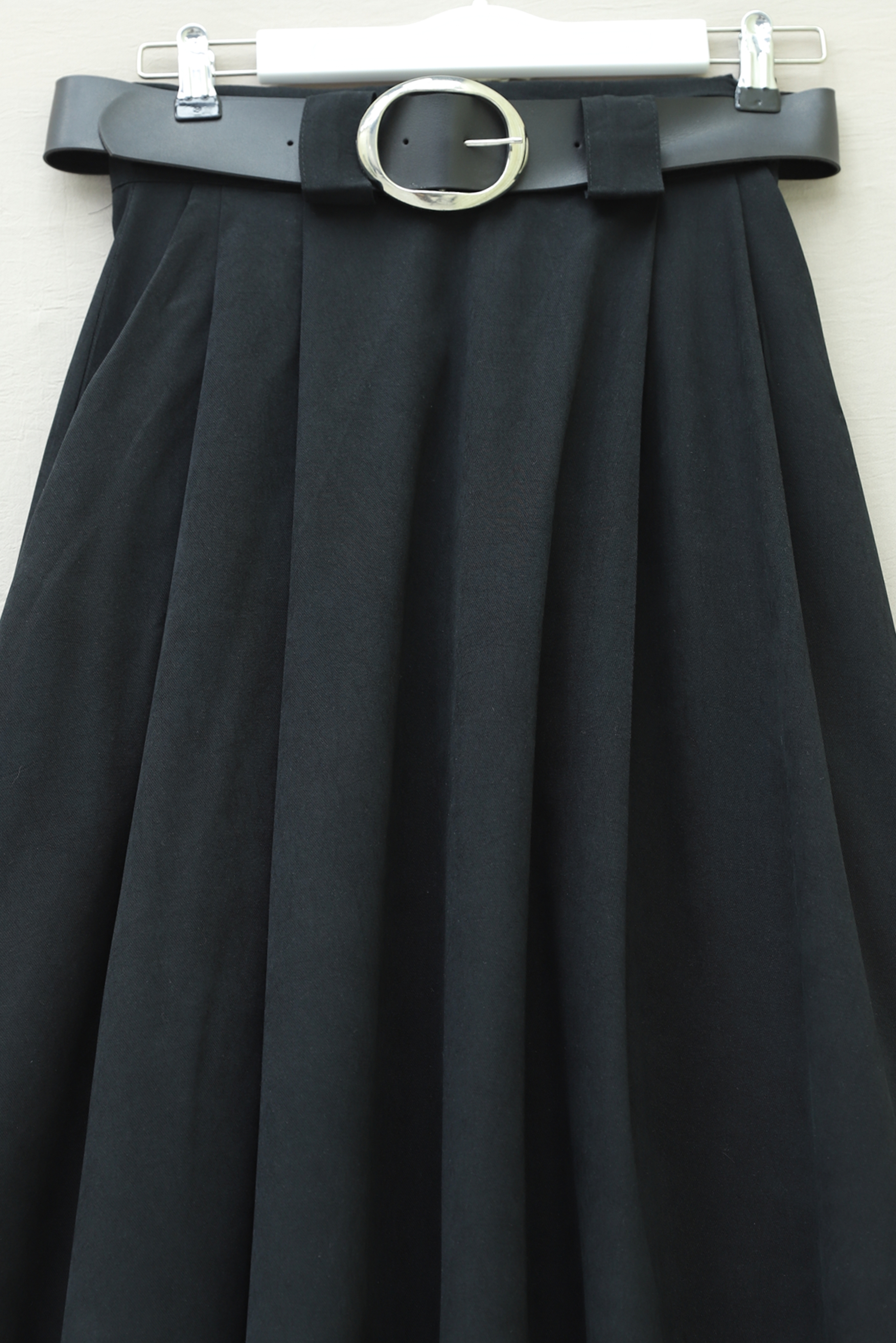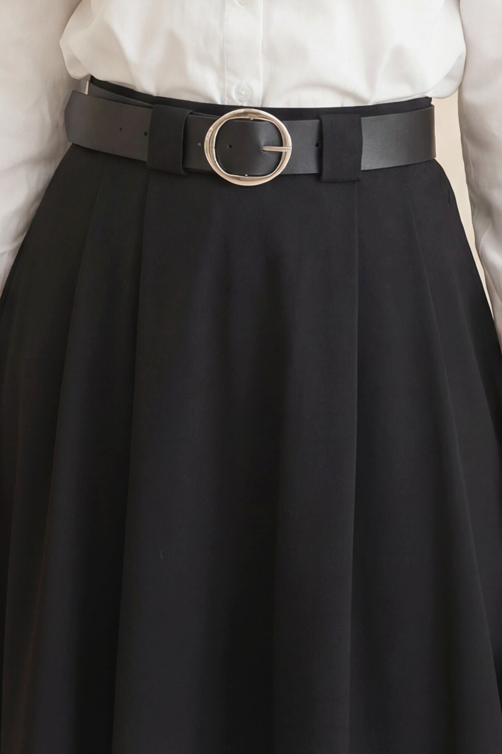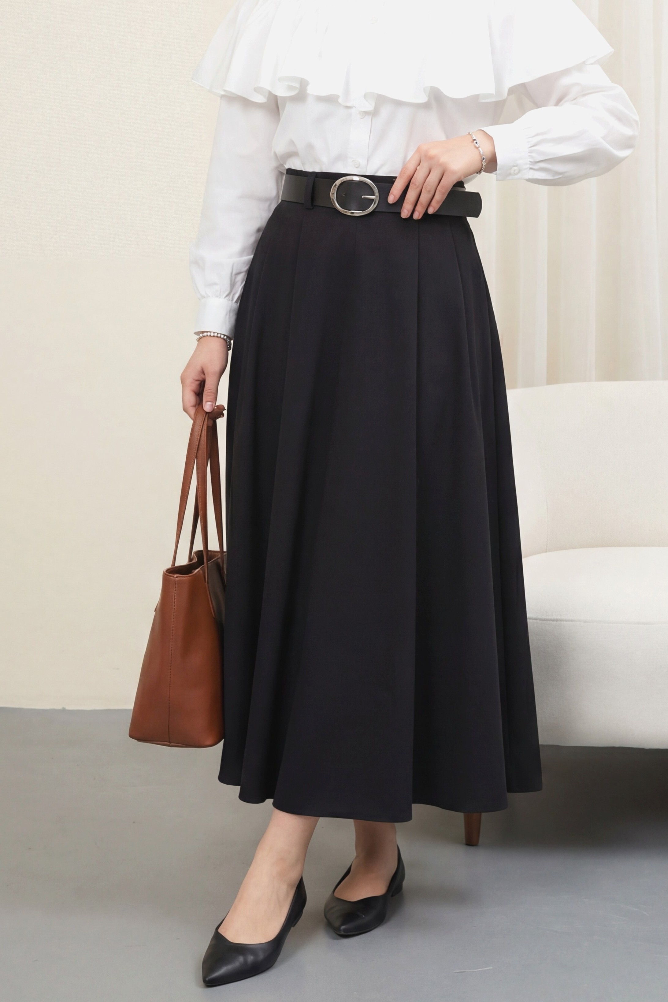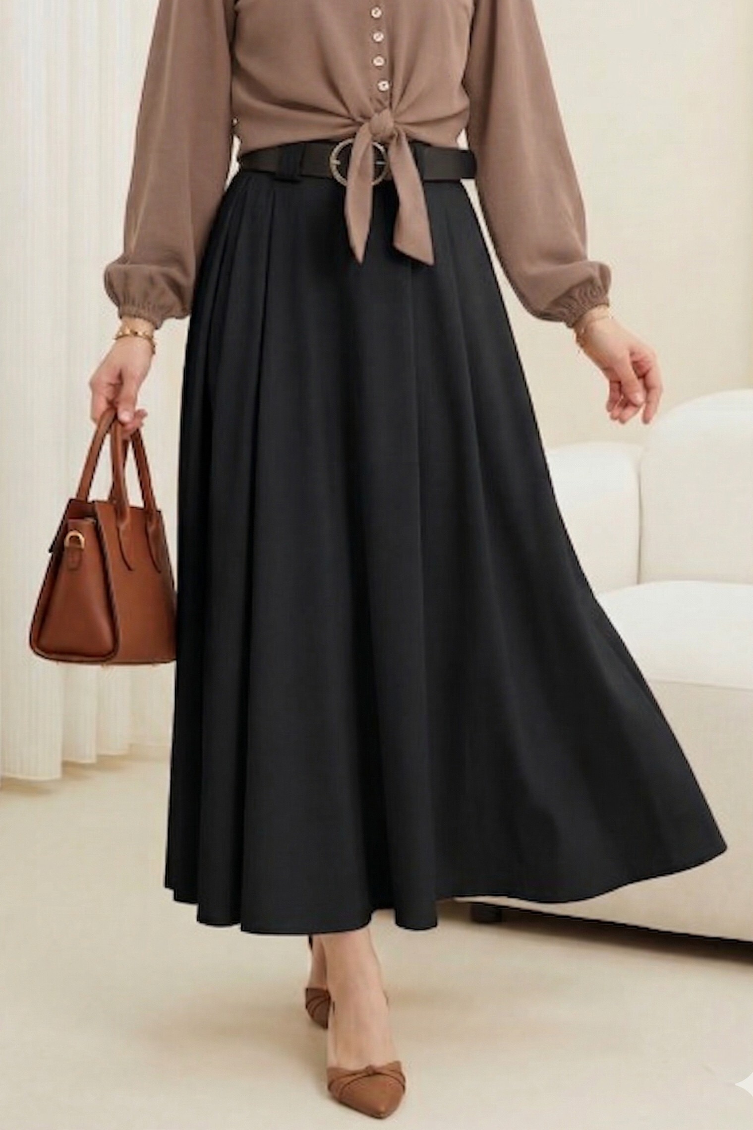 Kalın Kemerli Önü Pileli Yan Cepli Fermuarlı Tivil Etek, modern ve güçlü bir stil sunar. Ön pile detayı hareketli bir görünüm kazandırırken, kalın kemer formu beli vurgular. Yan cepleri pratik kullanım sağlar, fermuar detayı şık bir tamamlayıcıdır. Tivil kumaşı tok ve rahattır. Vücuda oturan fakat sıkmayan ideal kalıbı ile dengeli bir duruş sunar.