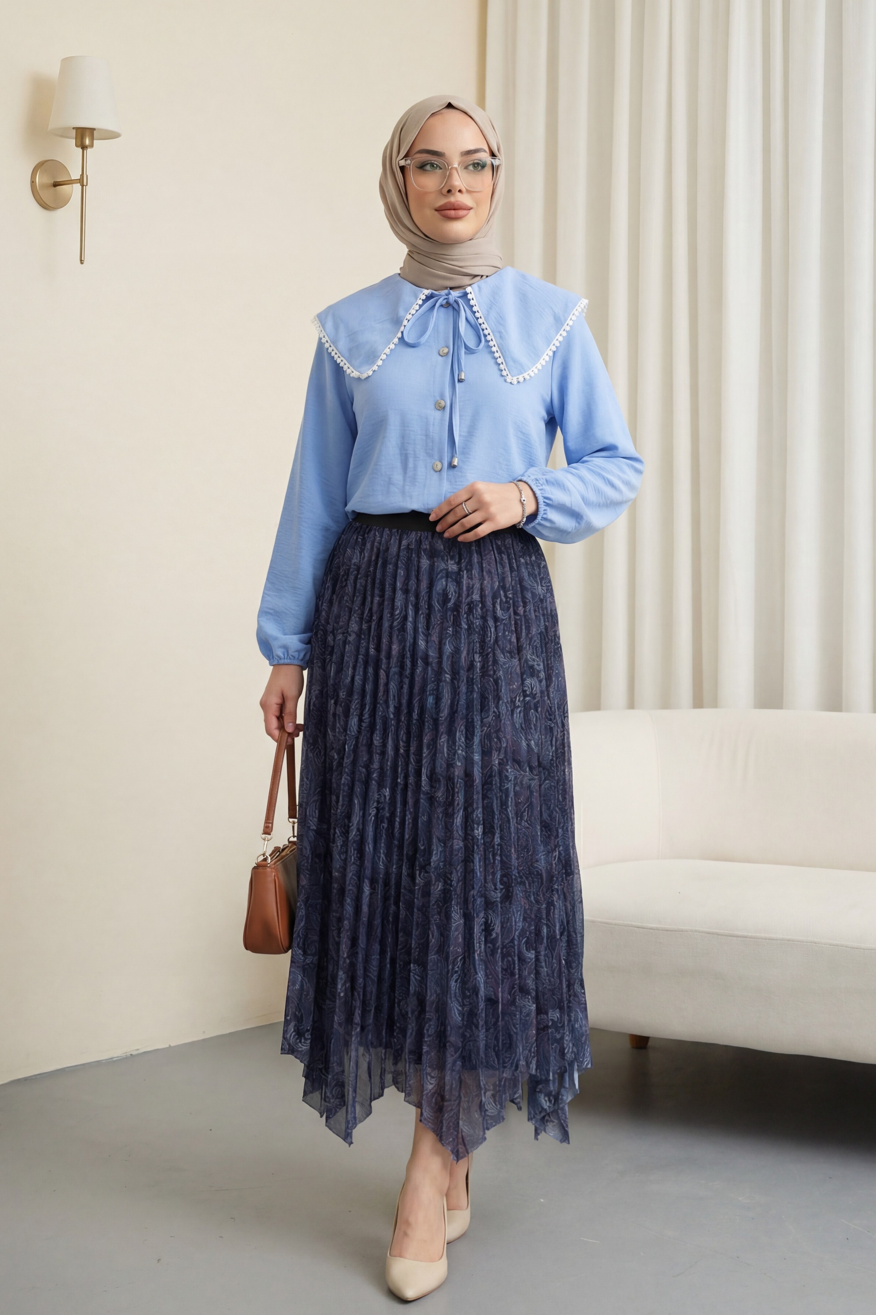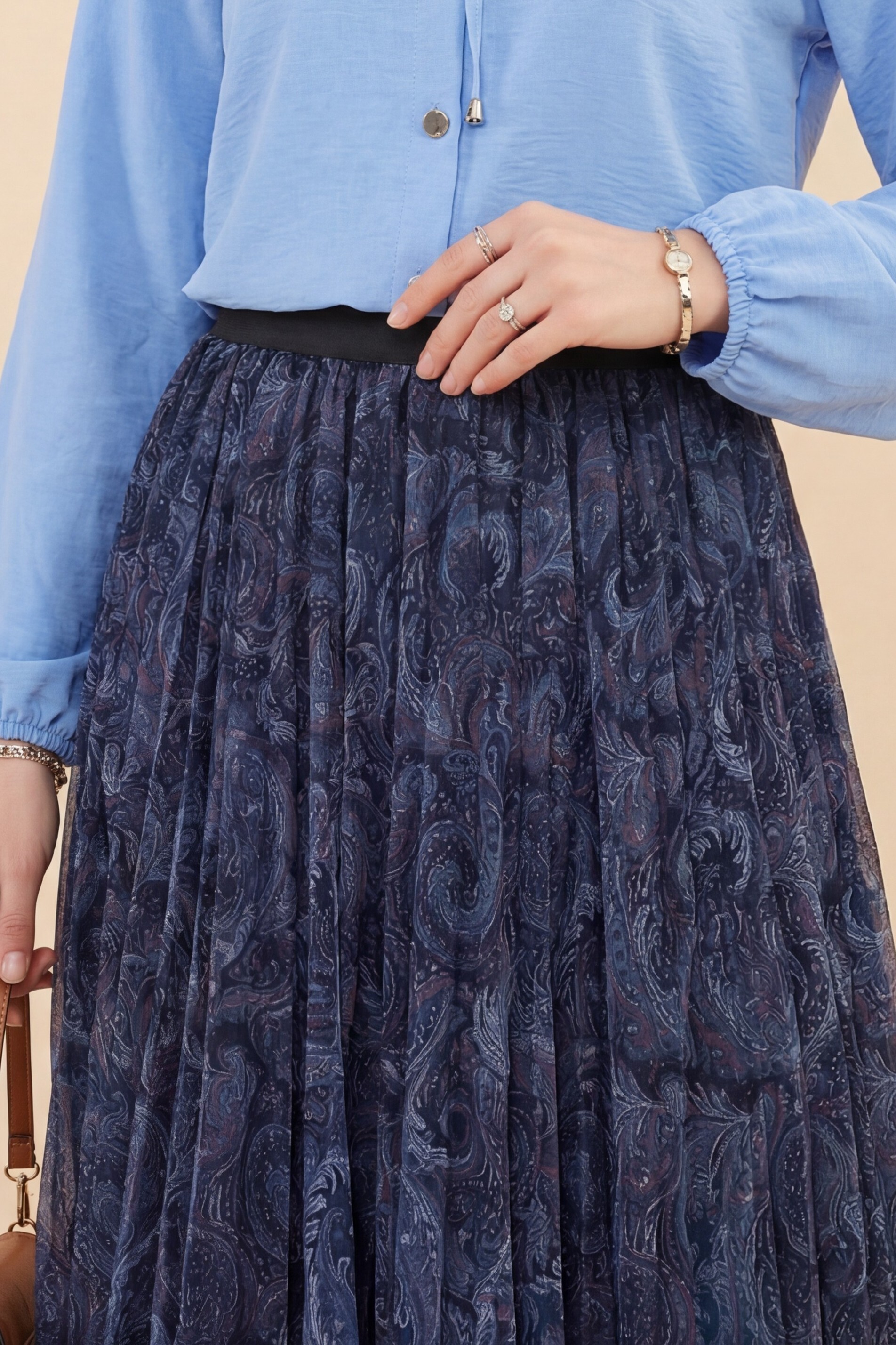 Karışık Desen Beli Lastikli Asimetrik Kesim Astarlı Tül Etek, hareketli ve modern bir stil sunar. Karışık desen tasarımı dikkat çekici bir görünüm sağlarken, asimetrik kesimi akışkan ve dinamik bir siluet oluşturur. Astarlı yapısı iç göstermeden konfor sunar. Beli lastikli formu gün boyu rahat kullanım sağlar.