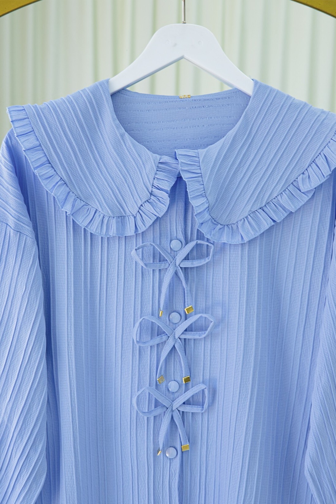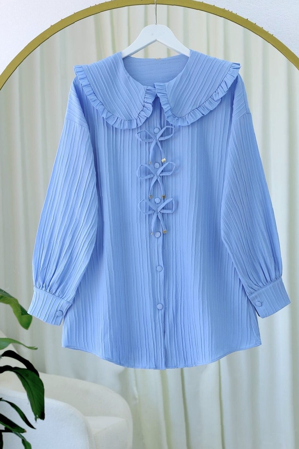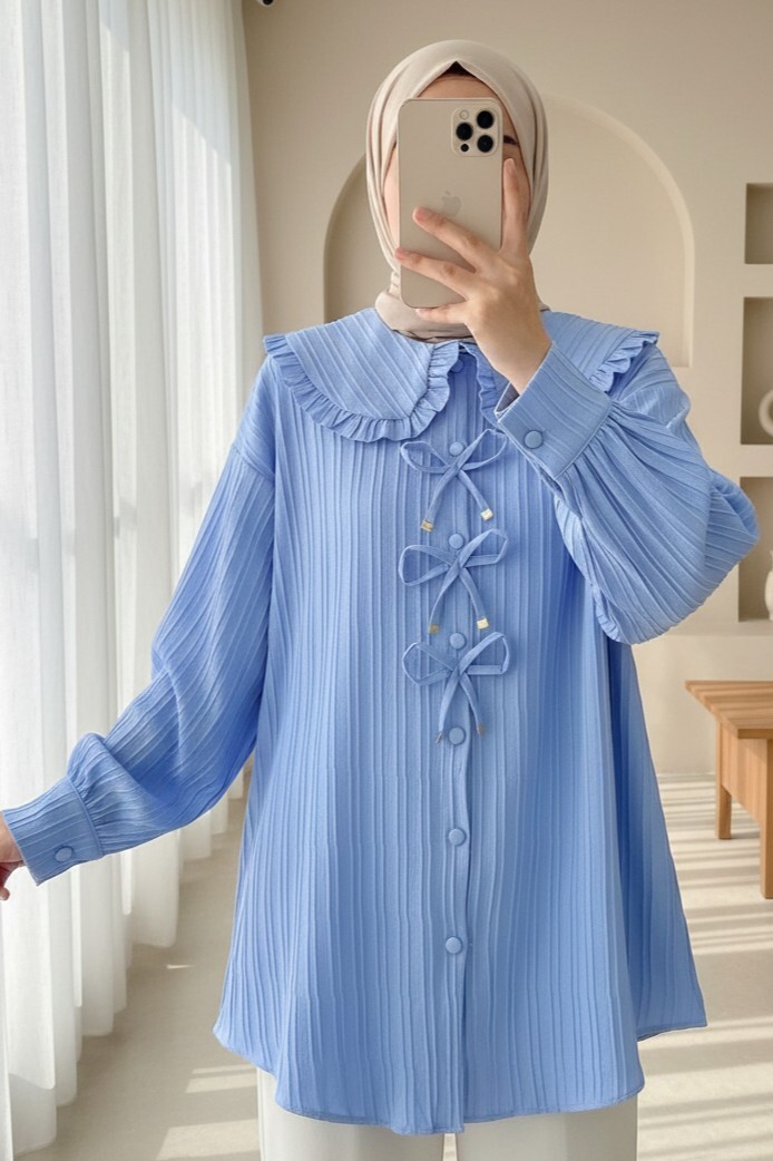 قميص بياقة مريلة وأزرار مع تفاصيل شريط على الجهة الأمامية -أزرق