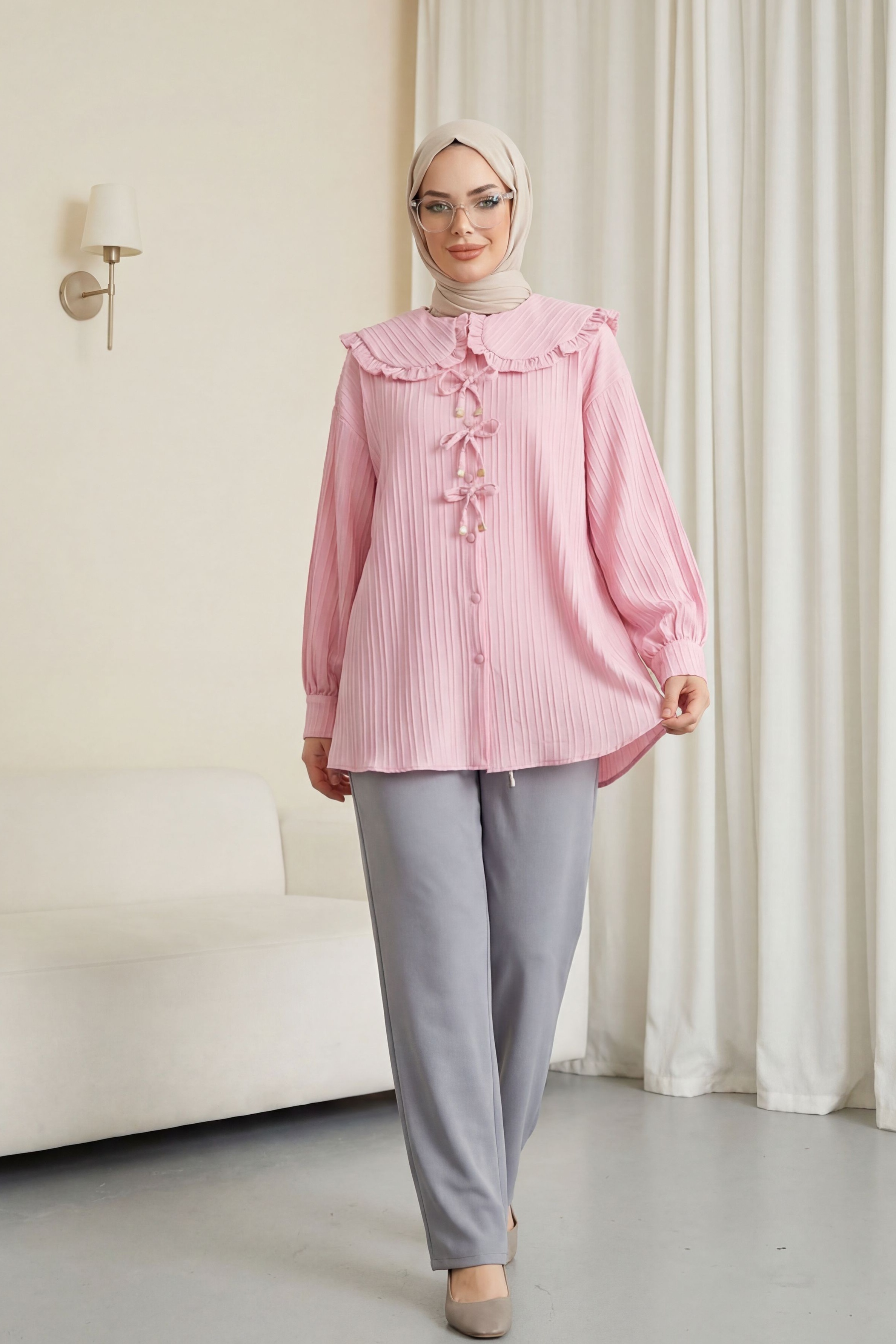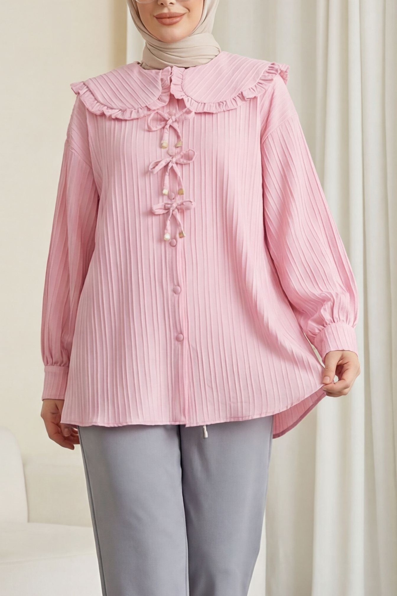 بلوزة ساندي بطيات نصف ياقة -فوشيا