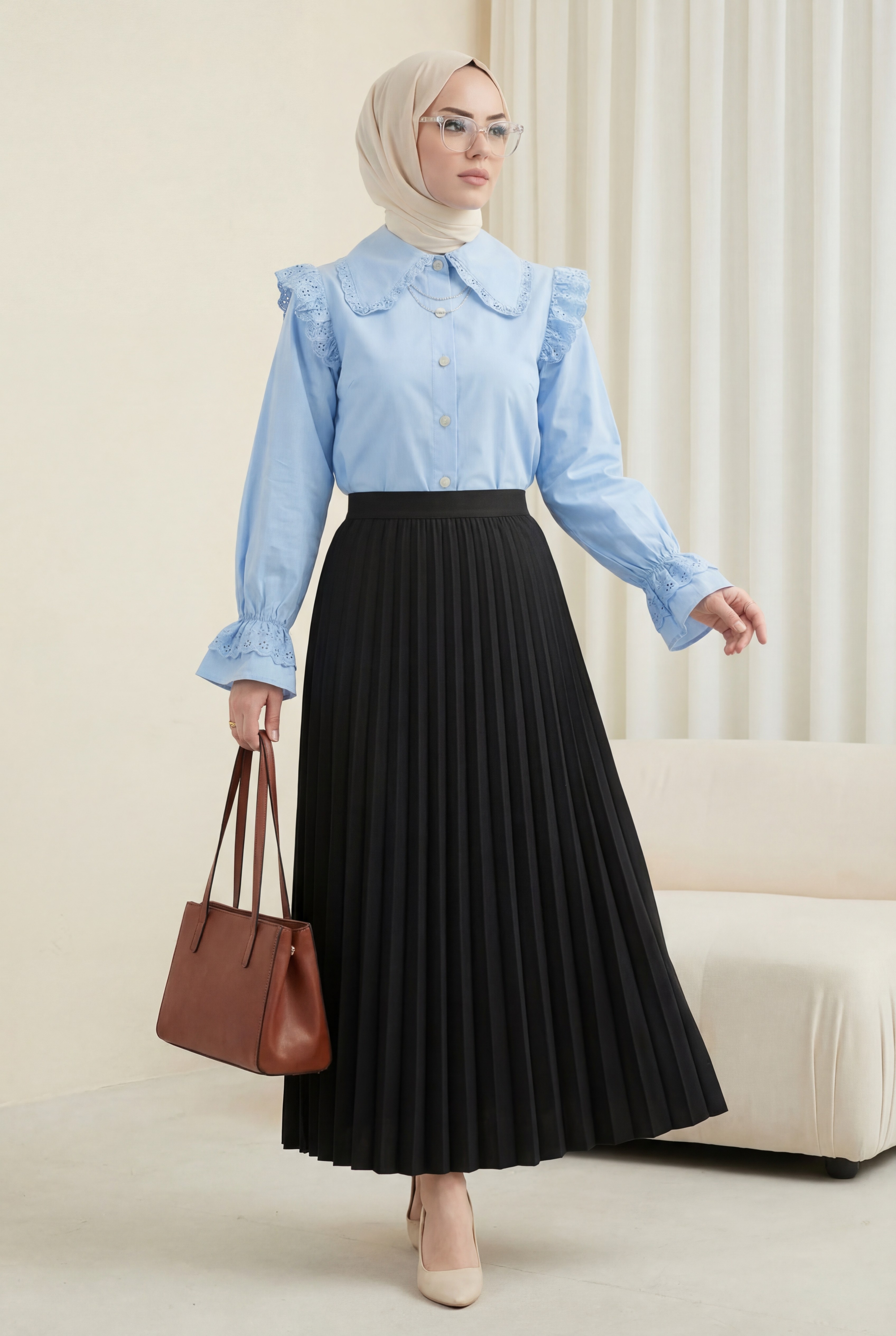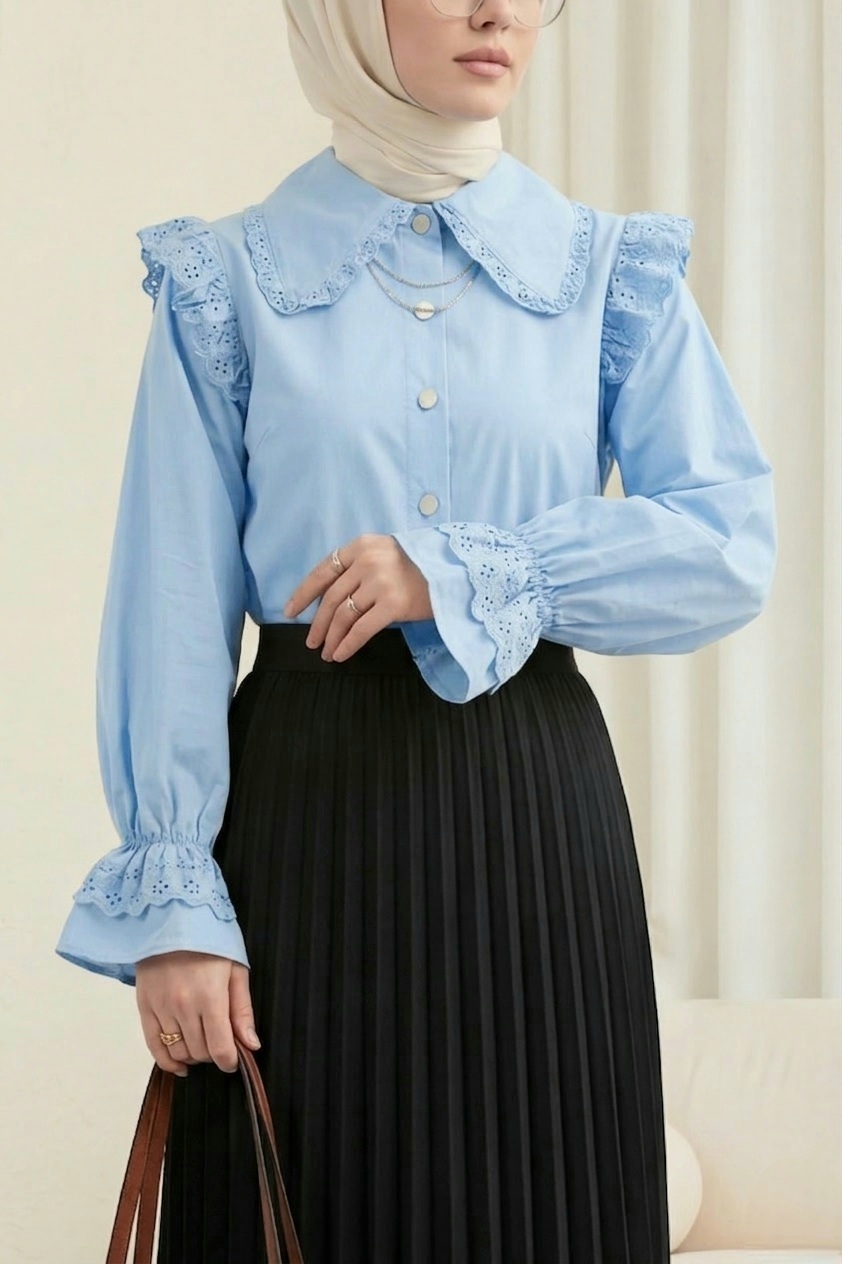 نموذج القميص الخاص بنا مع الزر الأمامي والكتف المكشكش والأصفاد المطاطية هو من بين أشهر الموديلات في الموسم الجديد.