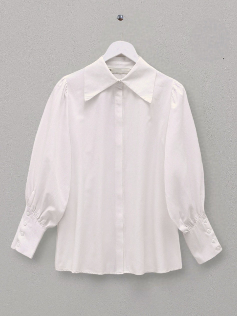 نموذج القميص الخاص بنا بأزرار مخفية في الأمام وأكمام منفوخة وأساور بأزرار من أشهر موديلات الموسم الجديد.