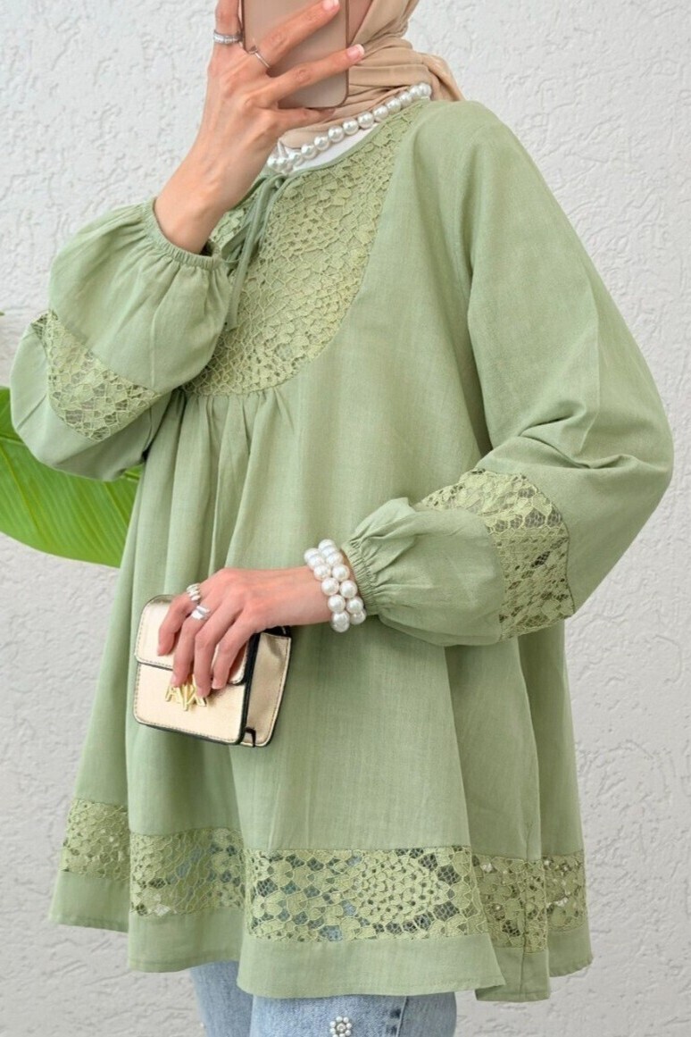 قميص بأكمام مرنة وياقة مربوطة وتفاصيل دانتيل -كاجلا جرين