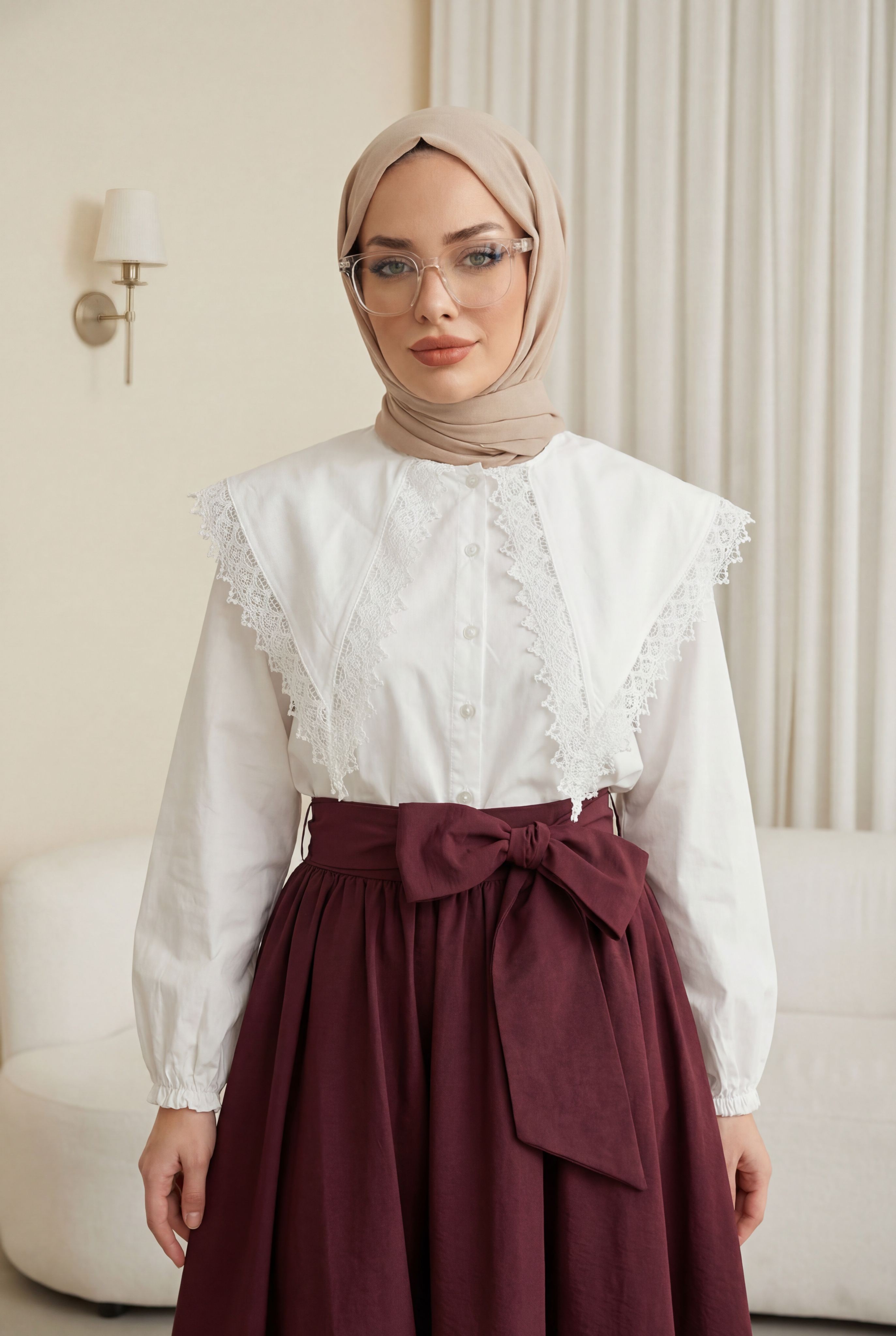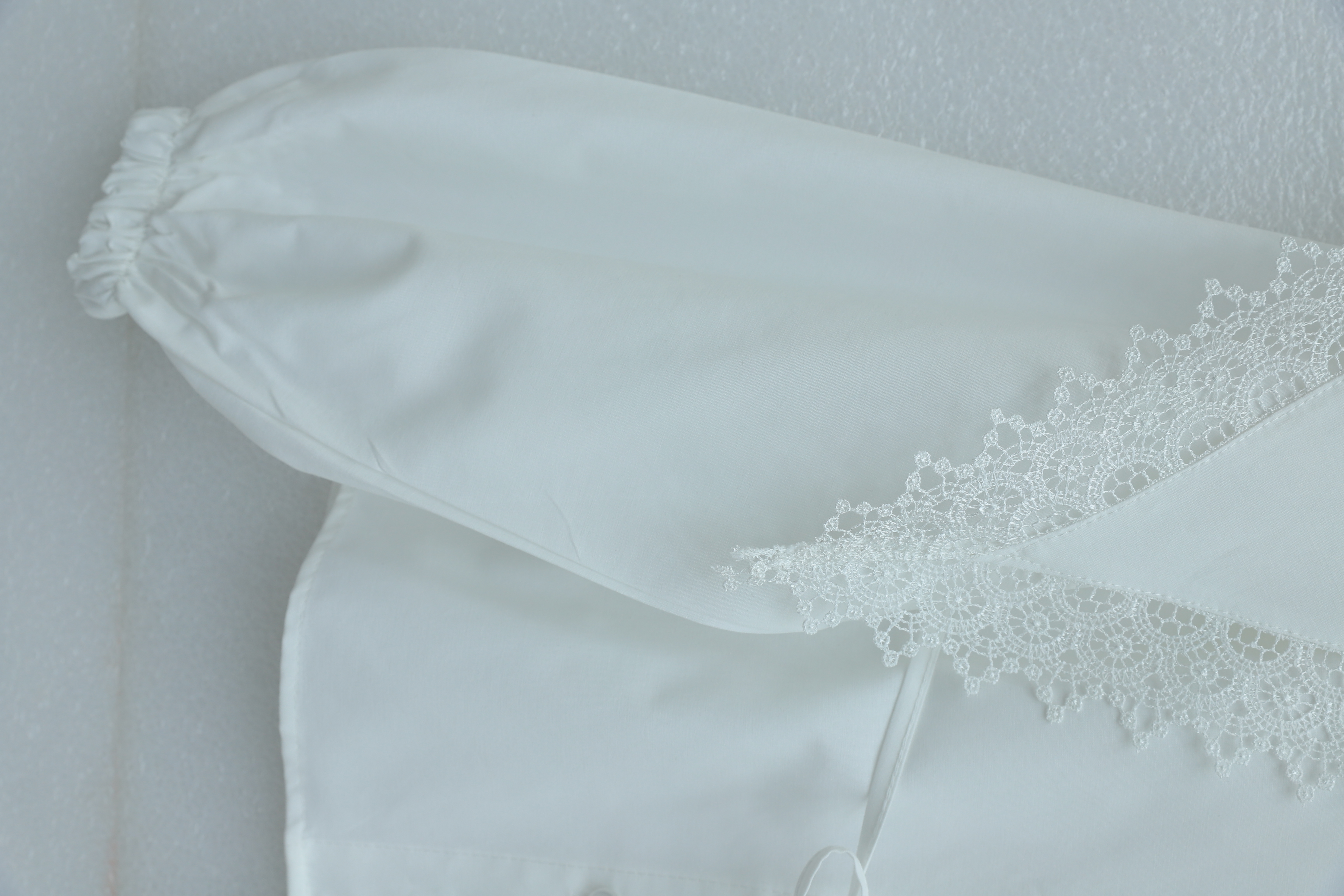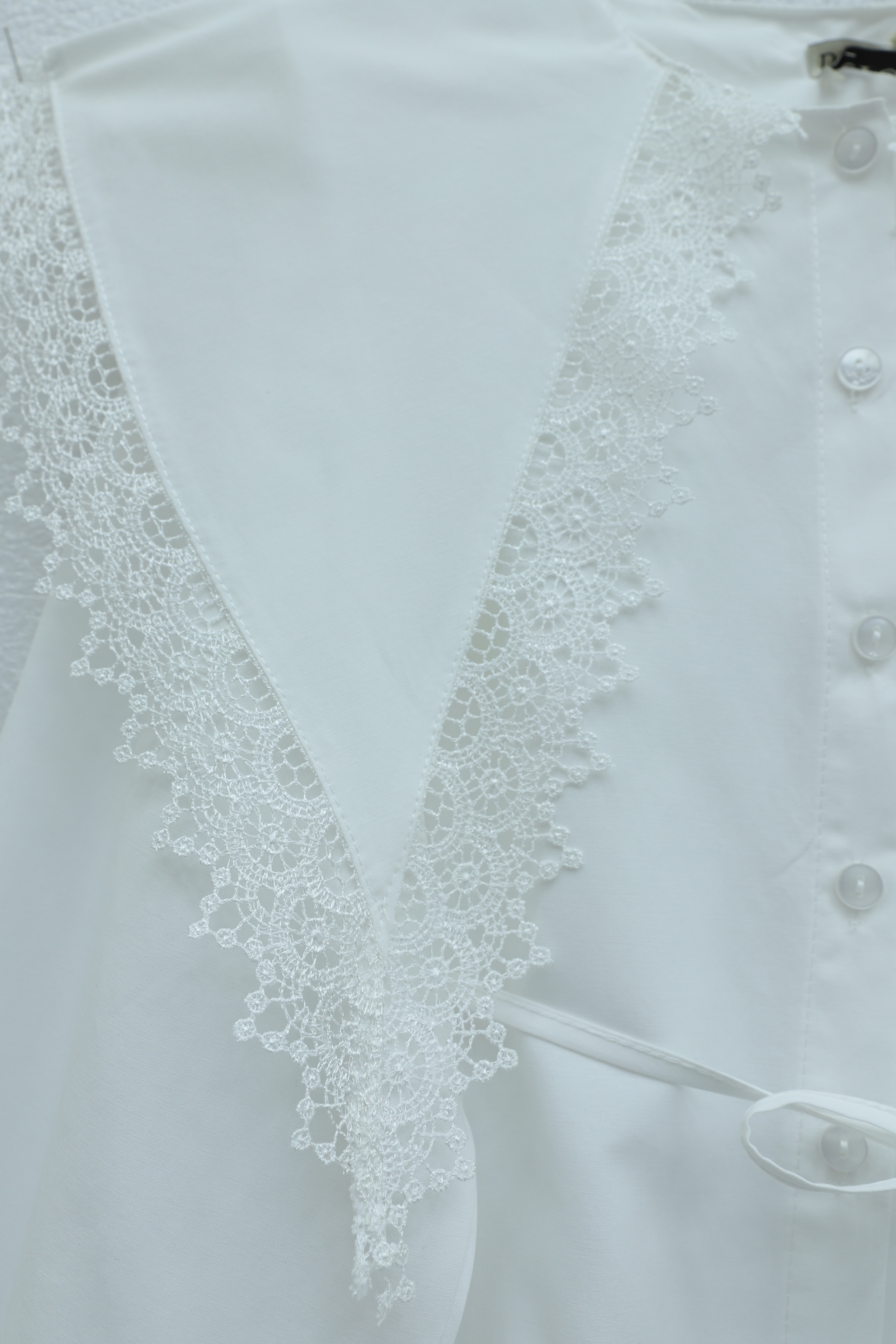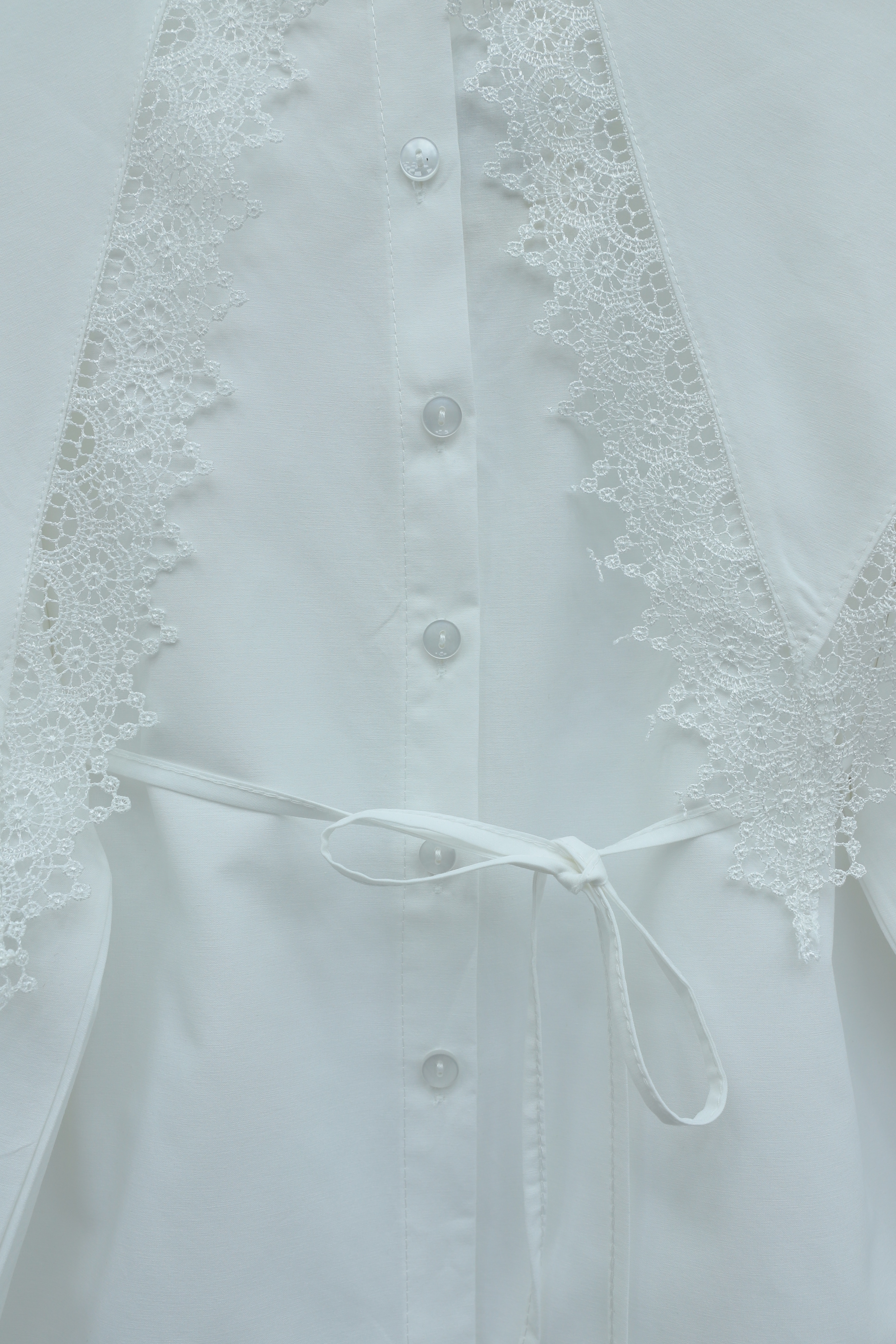 قميص بوبلين واسع الرقبة مزين بالدانتيل، مزود برباط وأساور مطاطية -أبيض