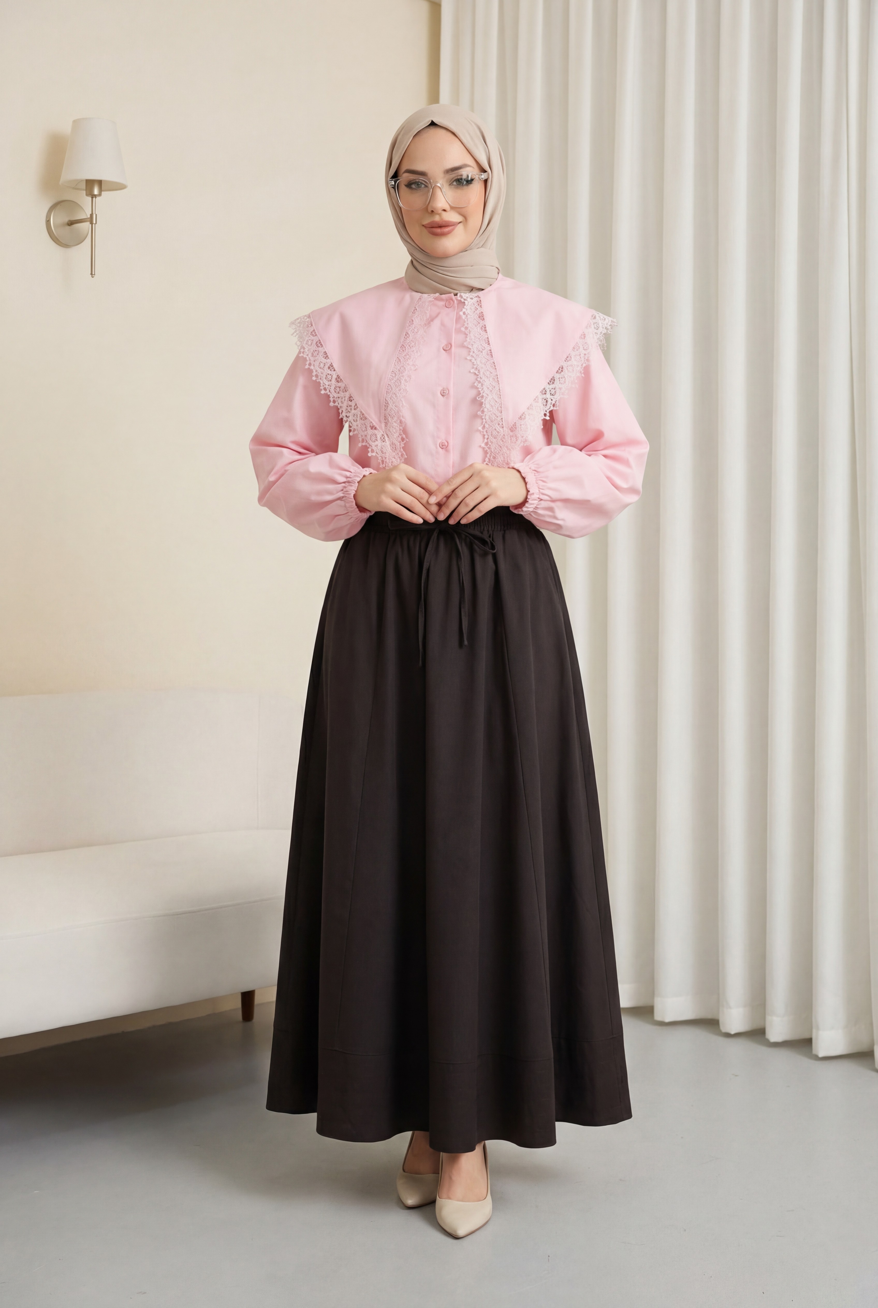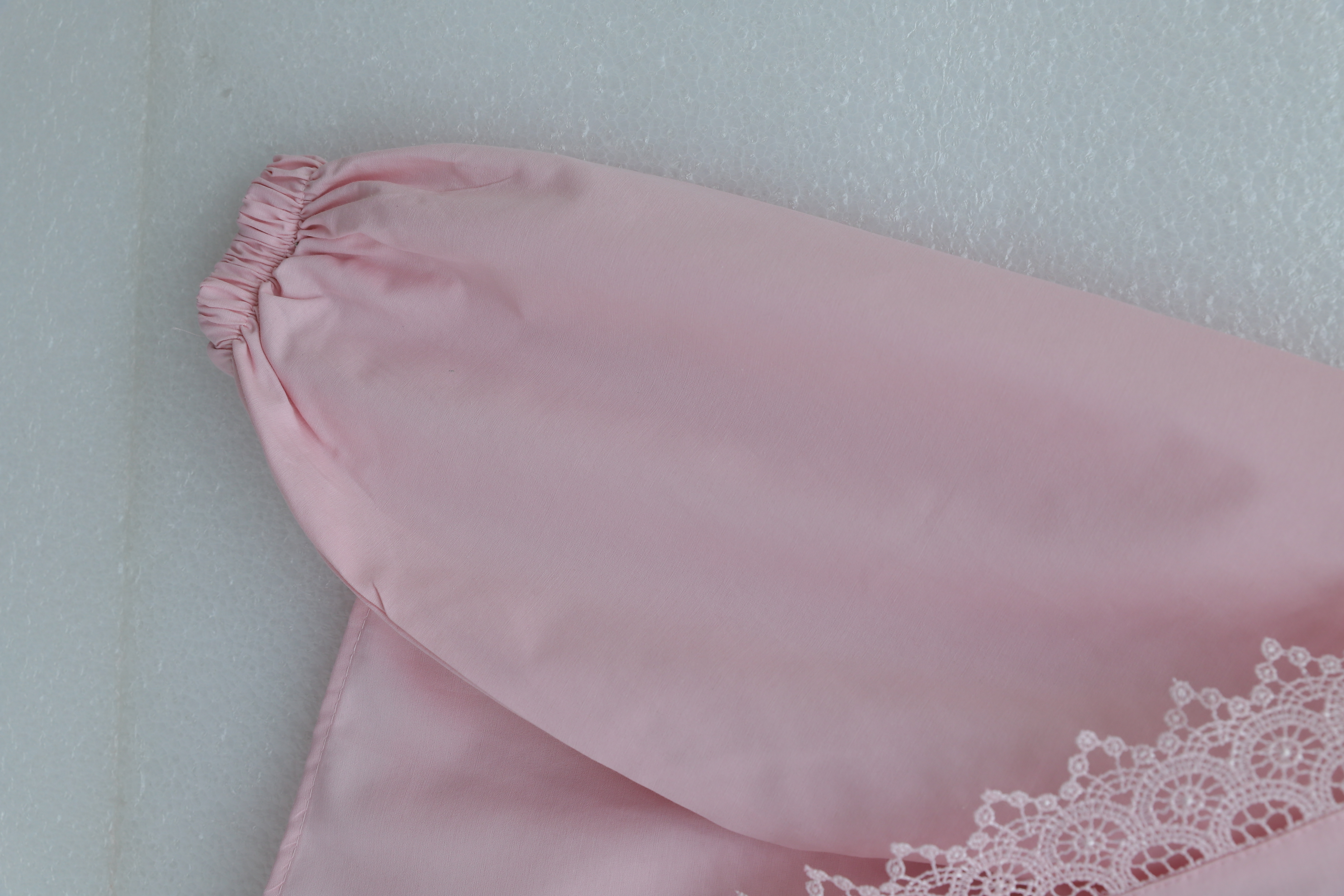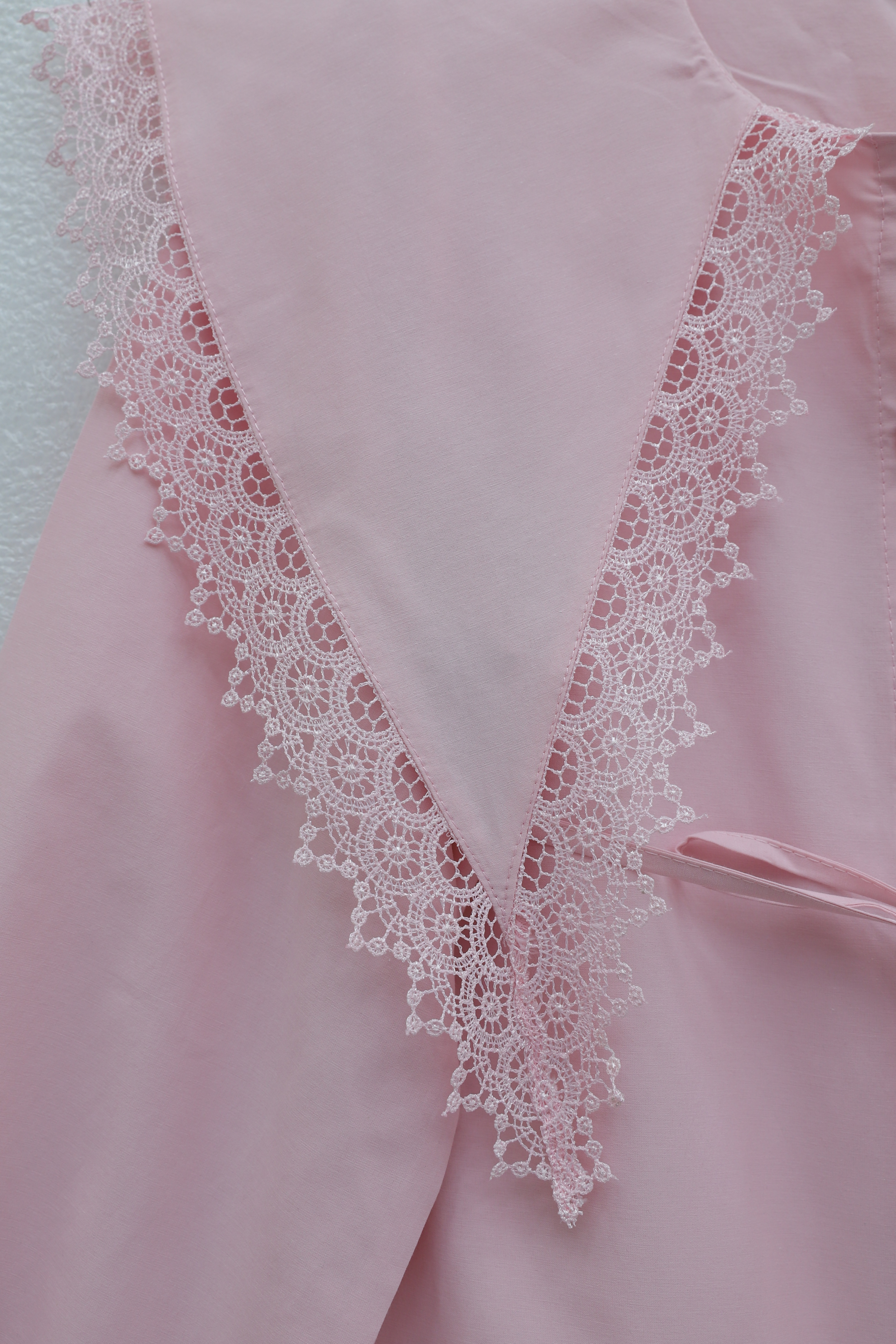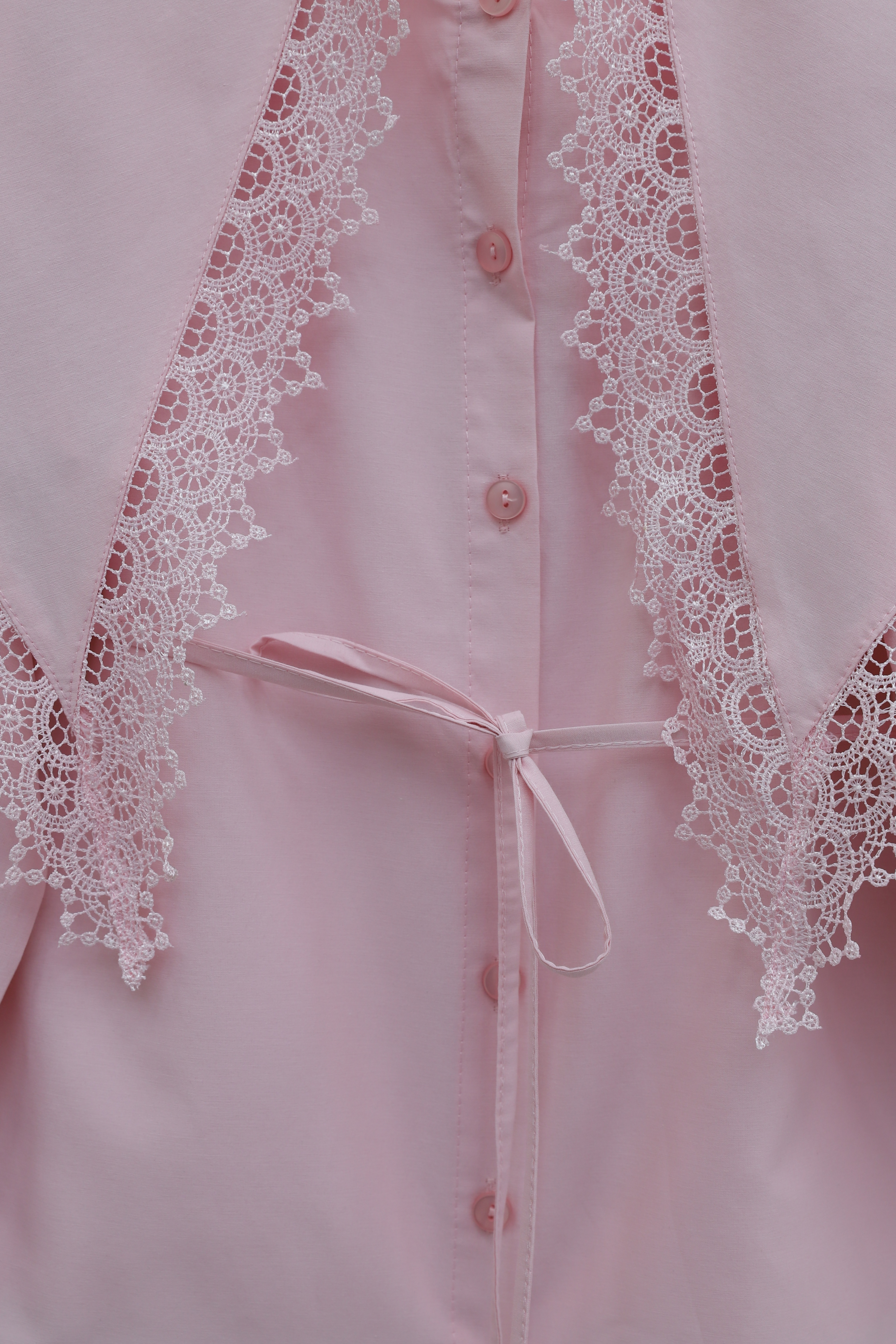 قميص بوبلين واسع الرقبة مزين بالدانتيل، مزود برباط وأساور مطاطية -وردي