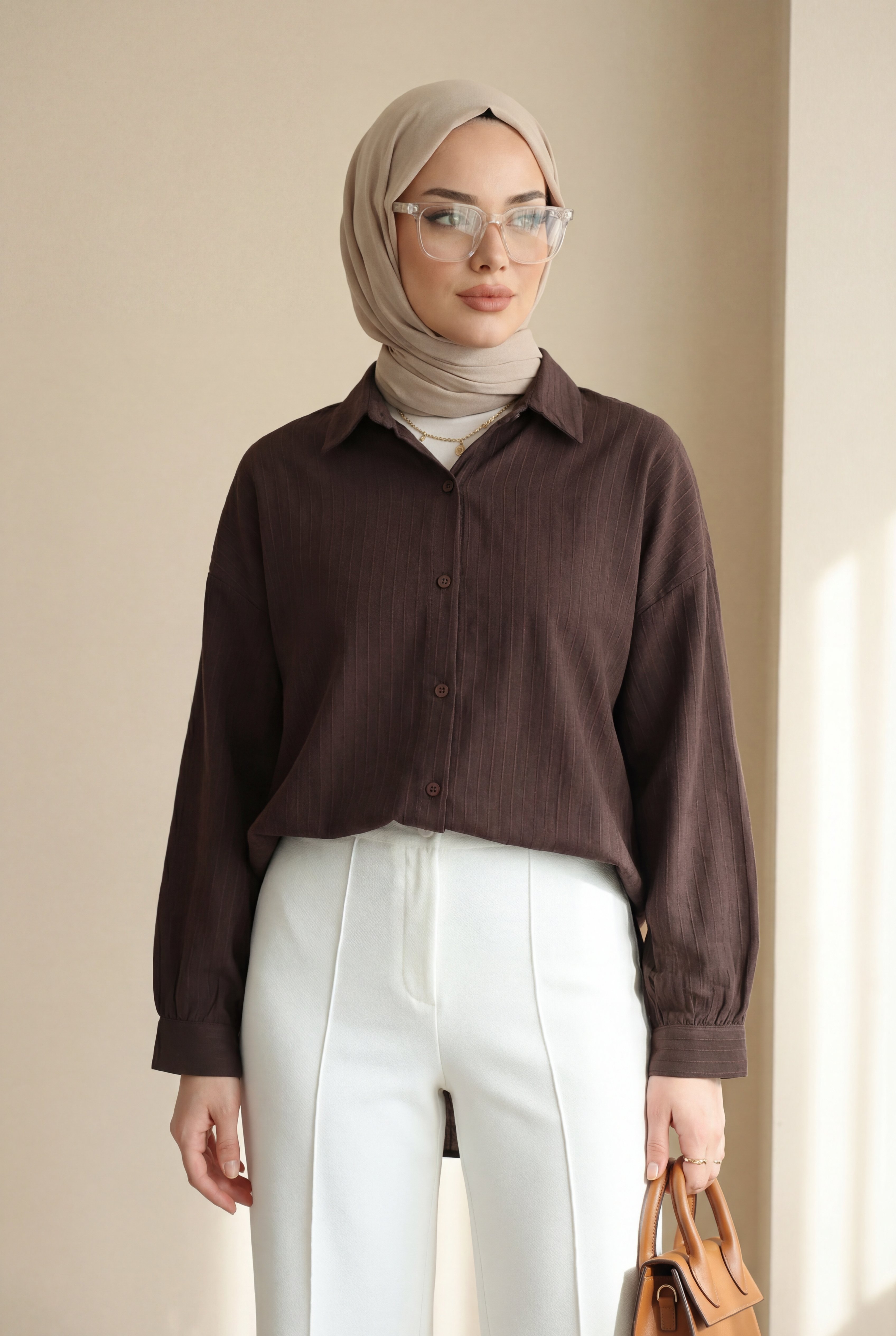 قميص فضفاض بنمط مخطط طويل وإغلاق بأزرار في الخلف. -بني محروق