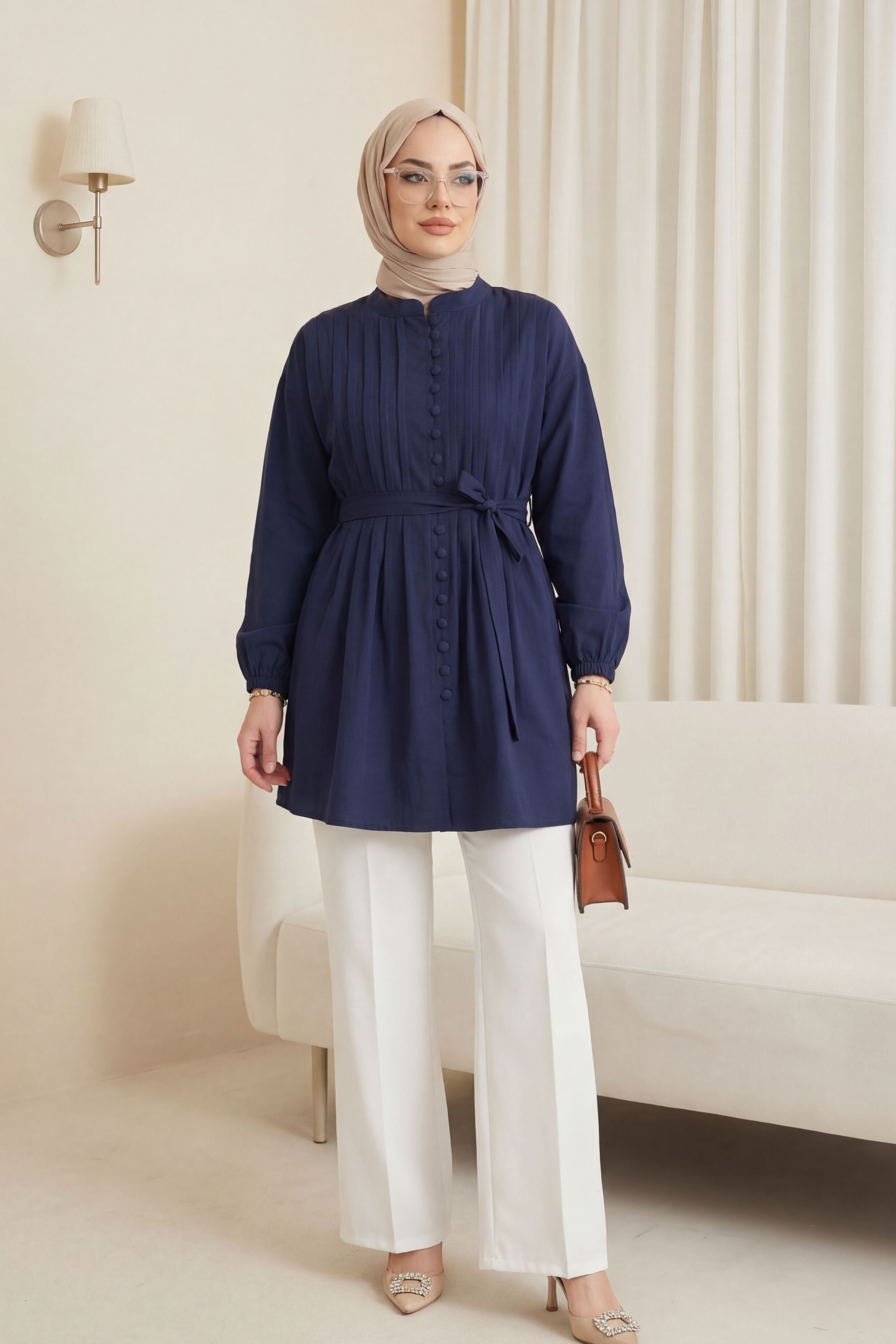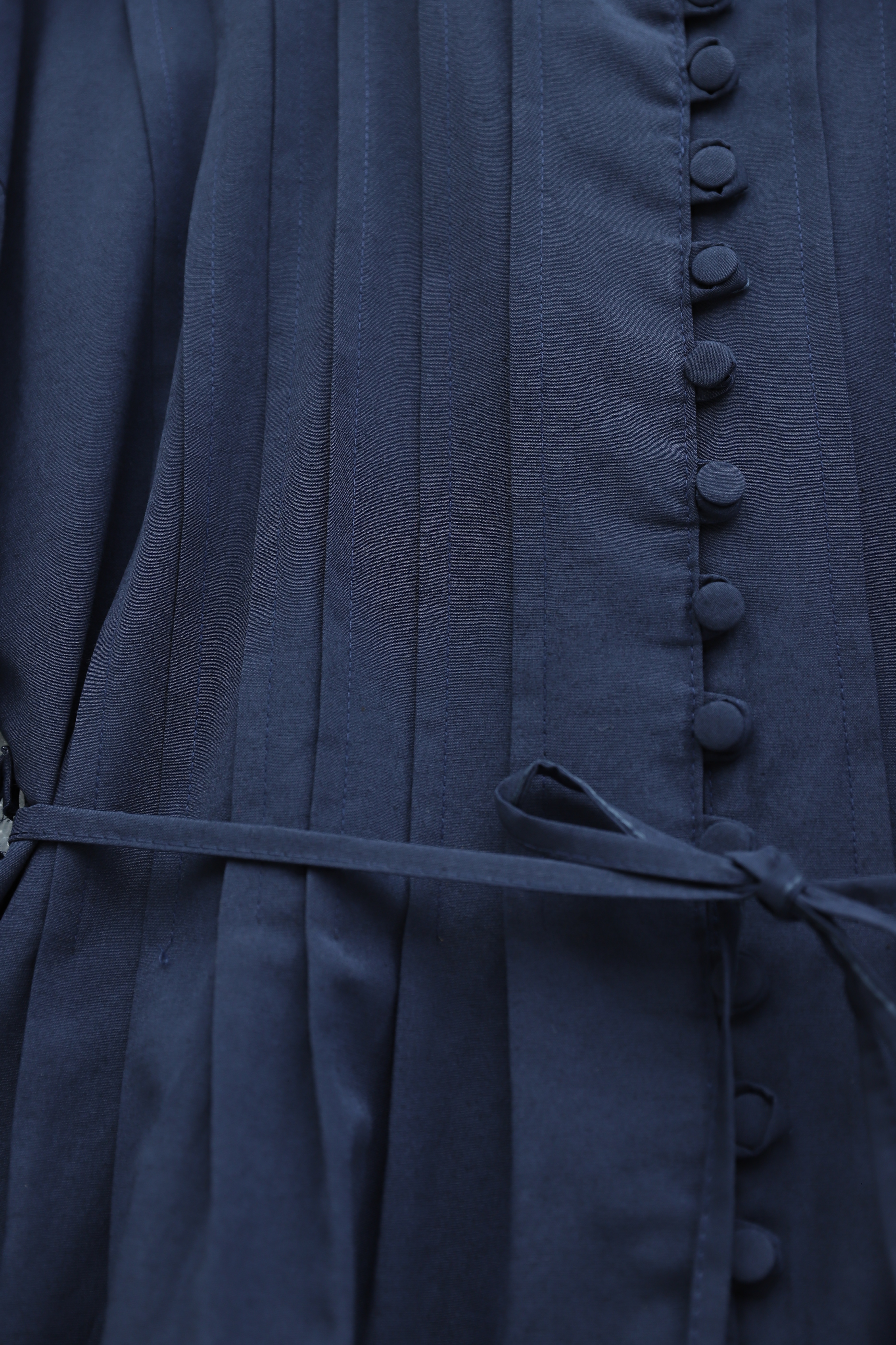 قميص من قماش البوبلين مزود بحزام وأساور مطاطية وأزرار أمامية وتفاصيل طي. -كحلي