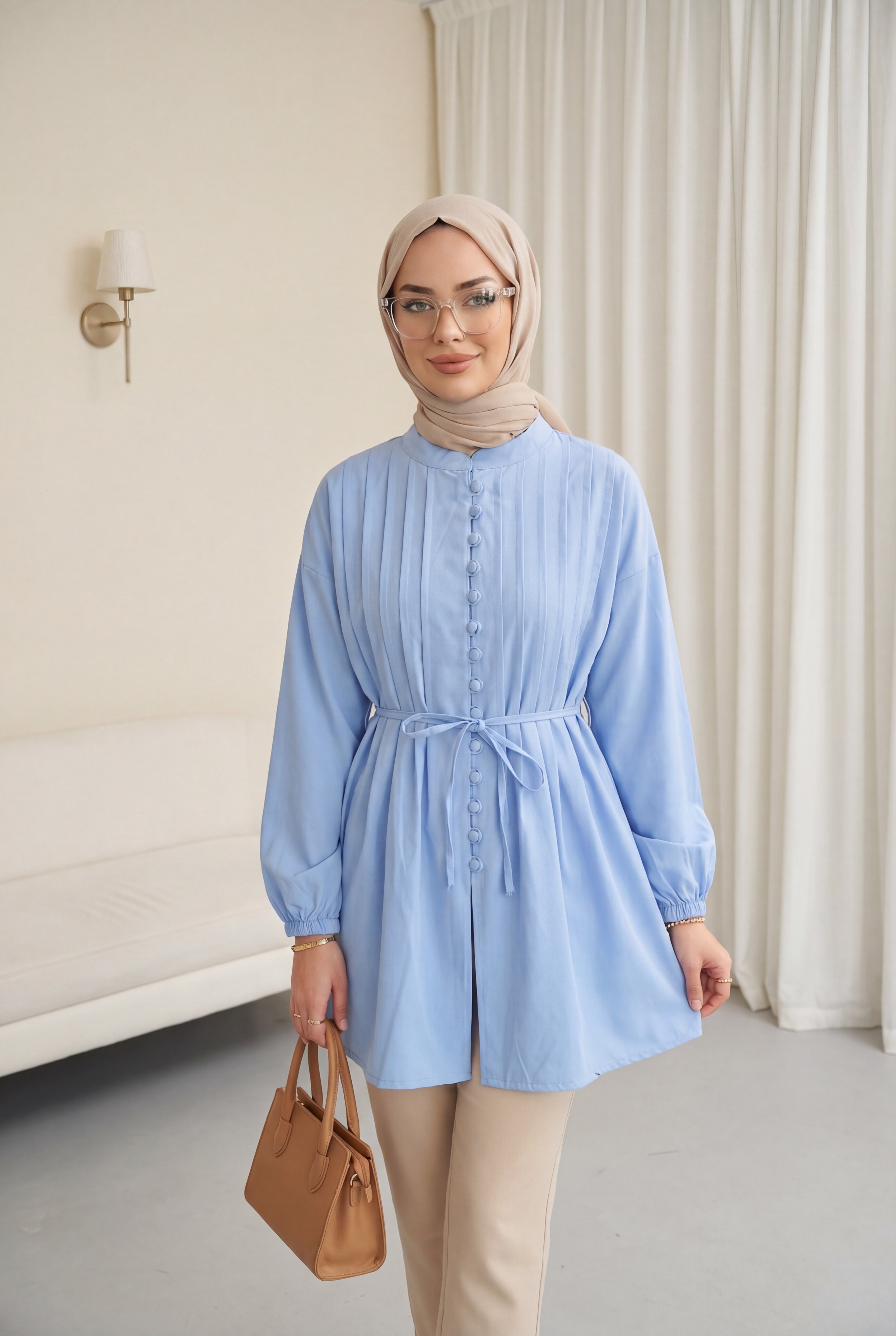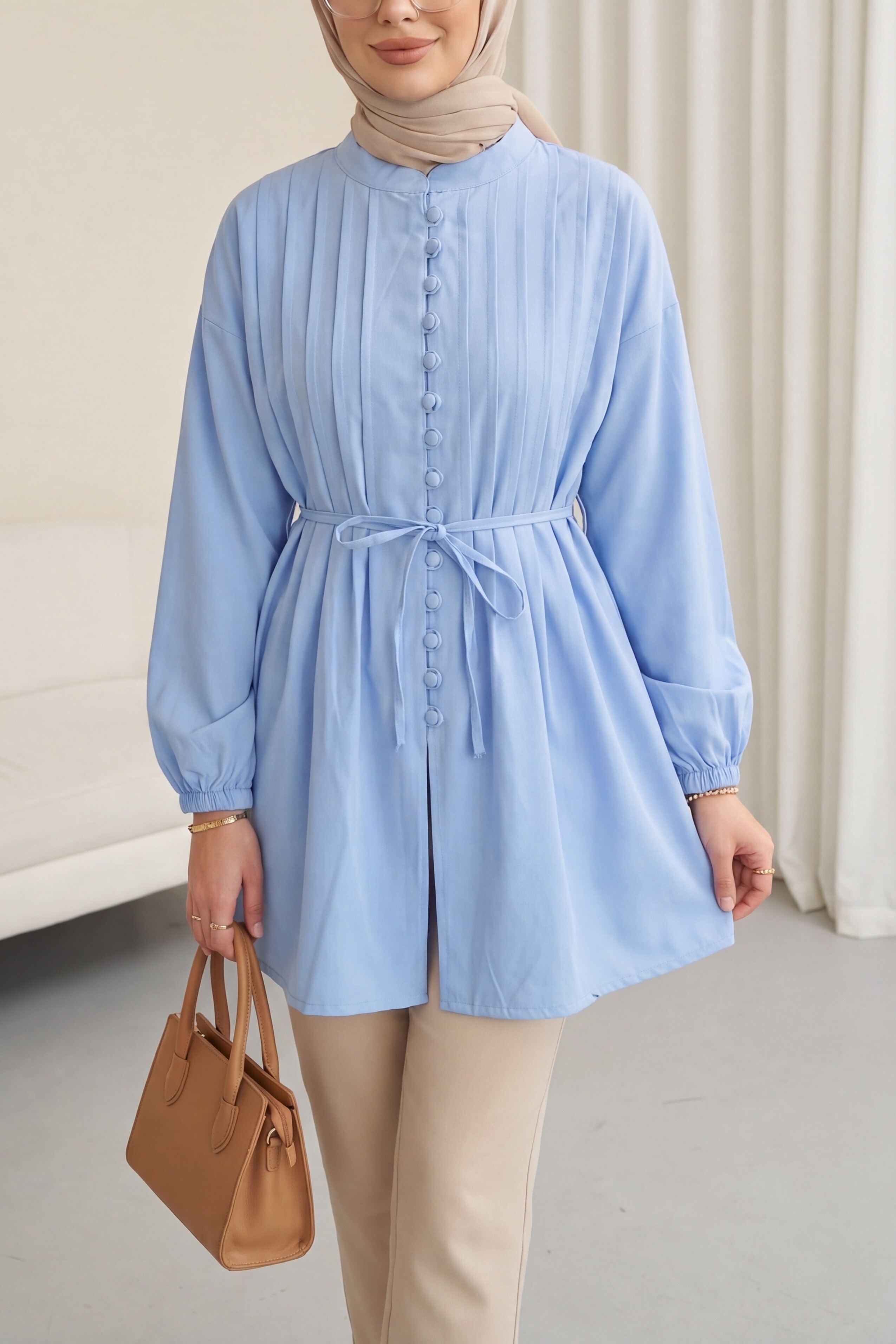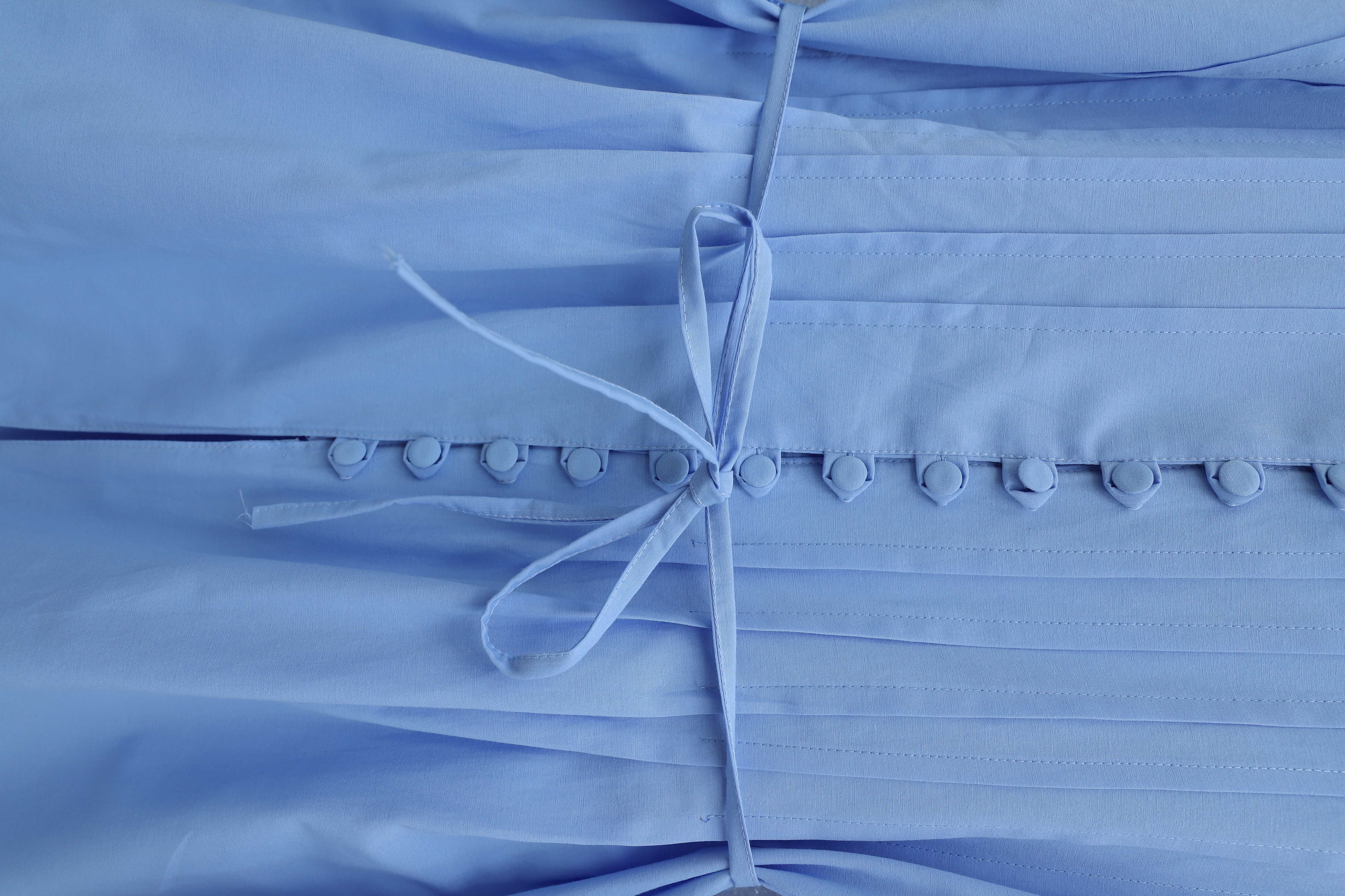 قميص من قماش البوبلين مزود بحزام وأساور مطاطية وأزرار أمامية وتفاصيل طي. -أزرق