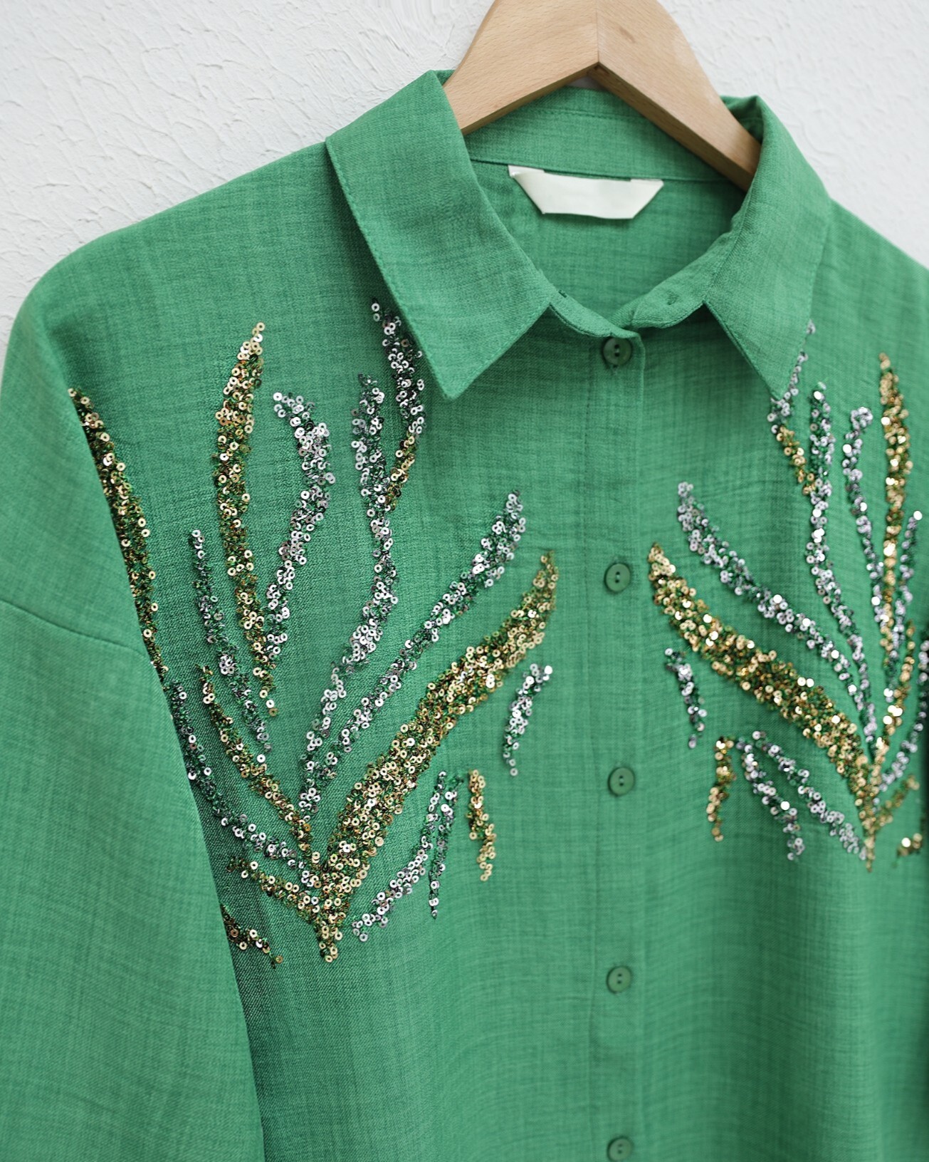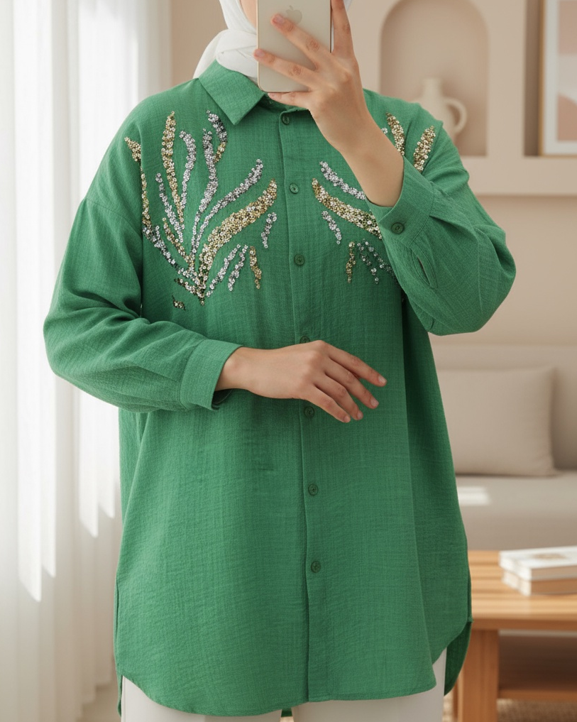يعد نموذج القميص الذي نوفره مع زر لأسفل مع تفاصيل الترتر في المقدمة من بين أشهر الموديلات في الموسم الجديد.