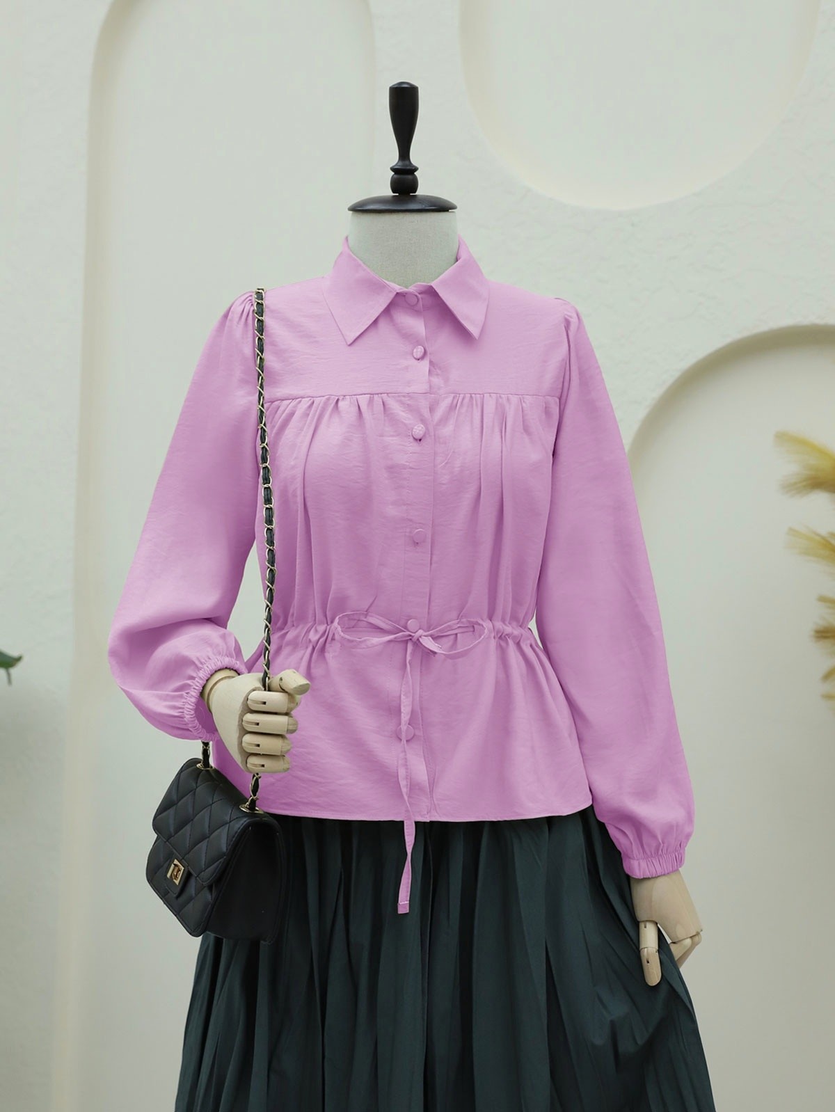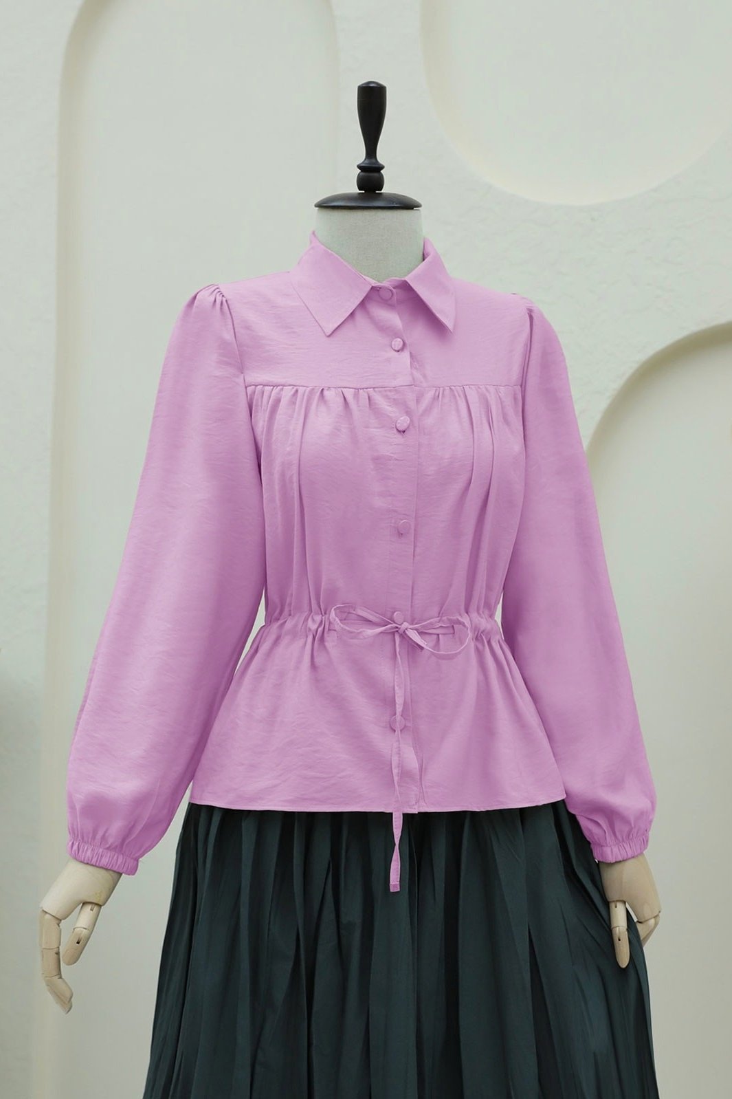 بلوزة قميص بأزرار مزينة بعقدة على شكل نفق -وردي