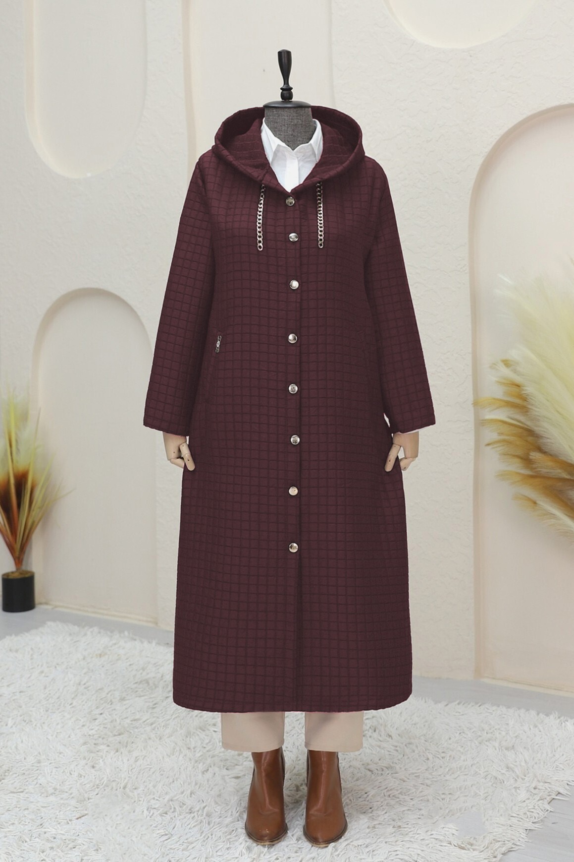 معطف طويل مزود بتفاصيل سلسلة على الياقة يقدم مزيجًا مثاليًا من الأناقة والرفاهية. تضيف تفاصيل السلسلة على الياقة لمسة عصرية ولافتة للنظر، بينما يوفر التصميم الطويل المبطن دفء وراحة إضافية في الطقس البارد. مثالي للاستخدام اليومي والمناسبات الخاصة، هذا المعطف هو الخيار المثالي لأولئك الذين يبحثون عن ملابس خارجية أنيقة وعملية في نفس الوقت.