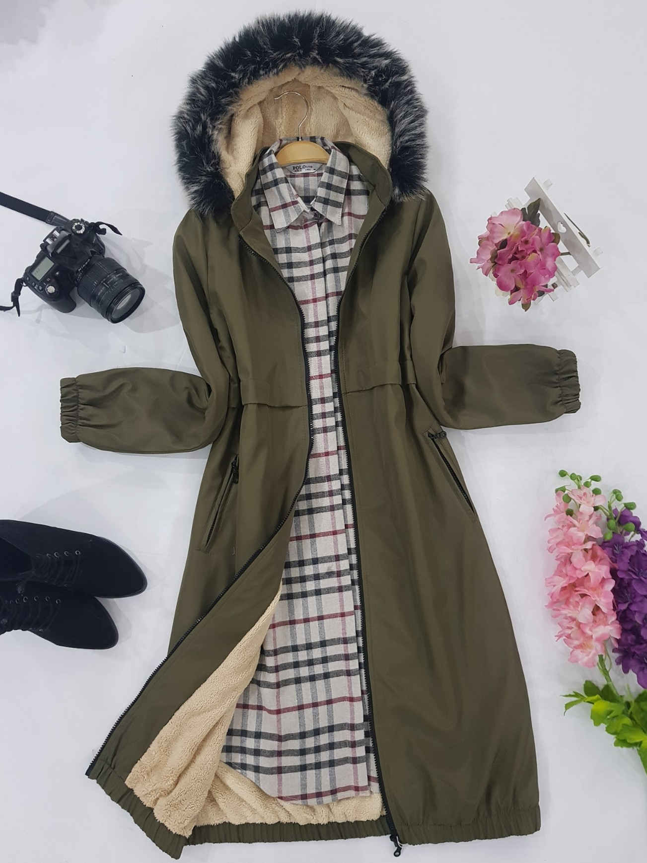 غطاء المحرك قابل للإزالة ، والأكمام والتنورة مرنان والصوف من الداخل.