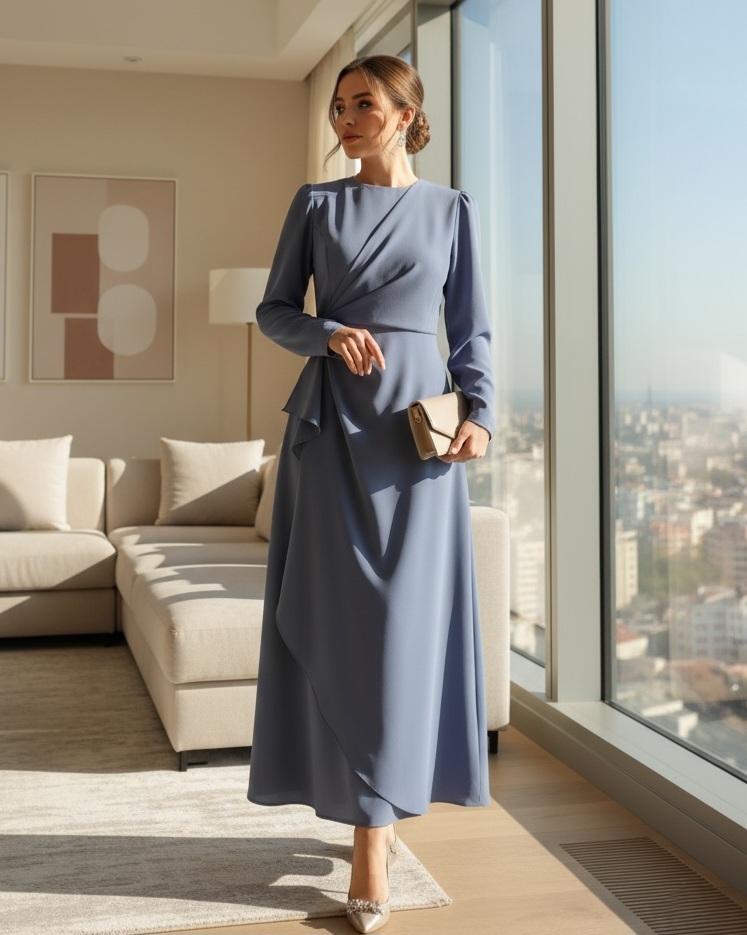 نموذج فستان السهرة لدينا مع ياقة دائرية ، وقصة غير متناسقة ، وغير مُبطن ، ونصف سحاب إلى الخلف ، هو أحد أكثر القطع رواجًا في الموسم الجديد.