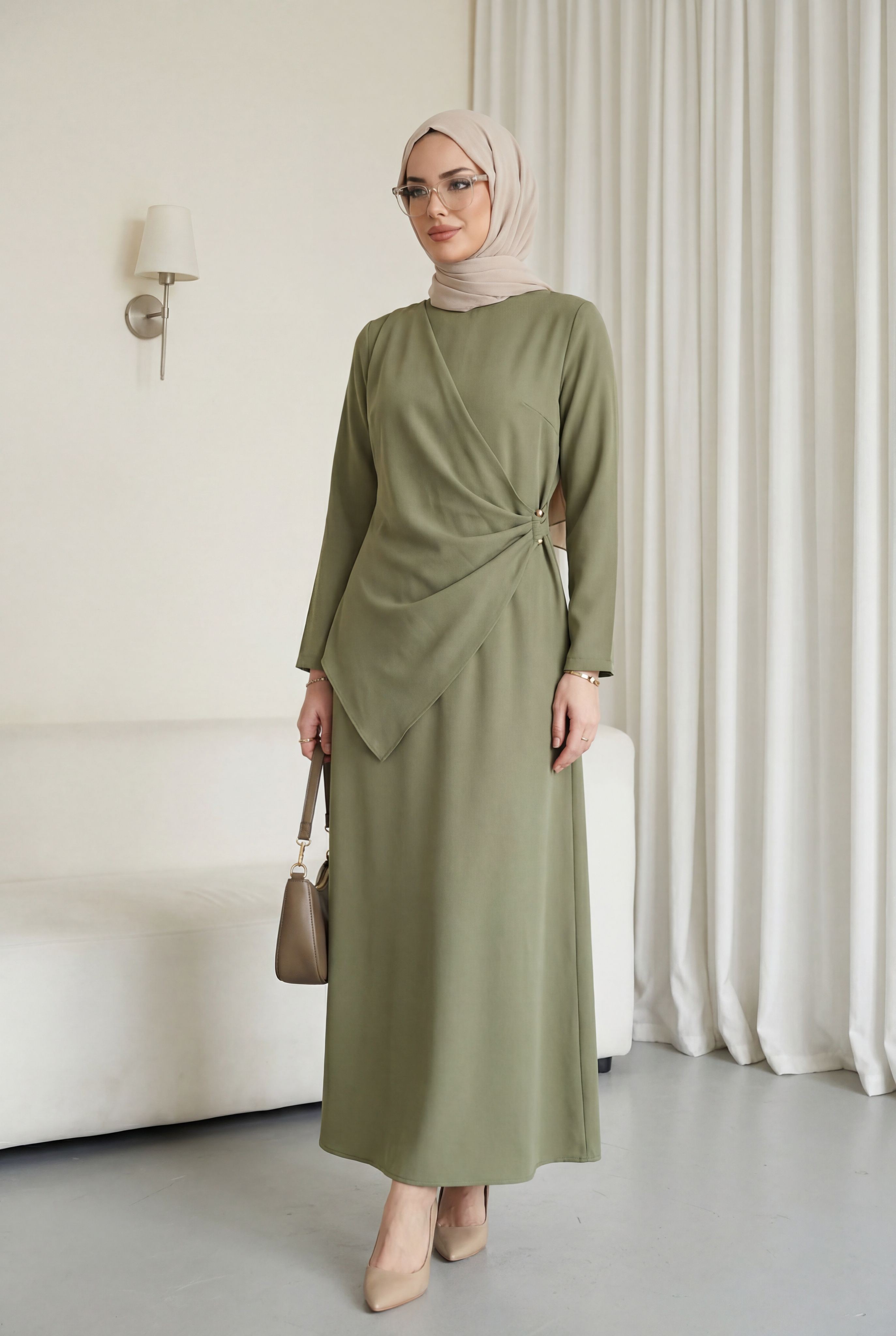 فستان كريب مستورد بياقة دائرية وإبزيم متقاطع -كاجلا جرين