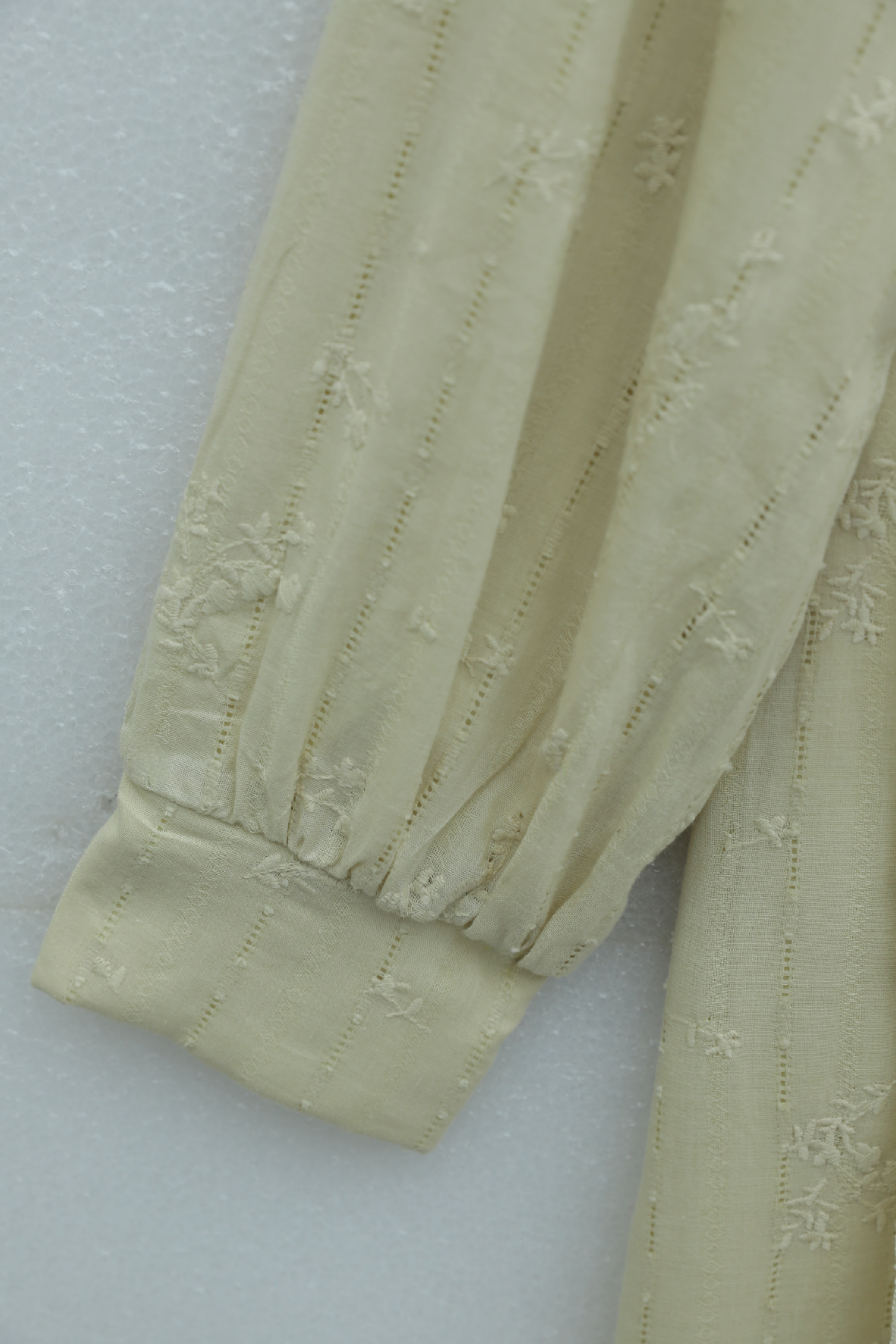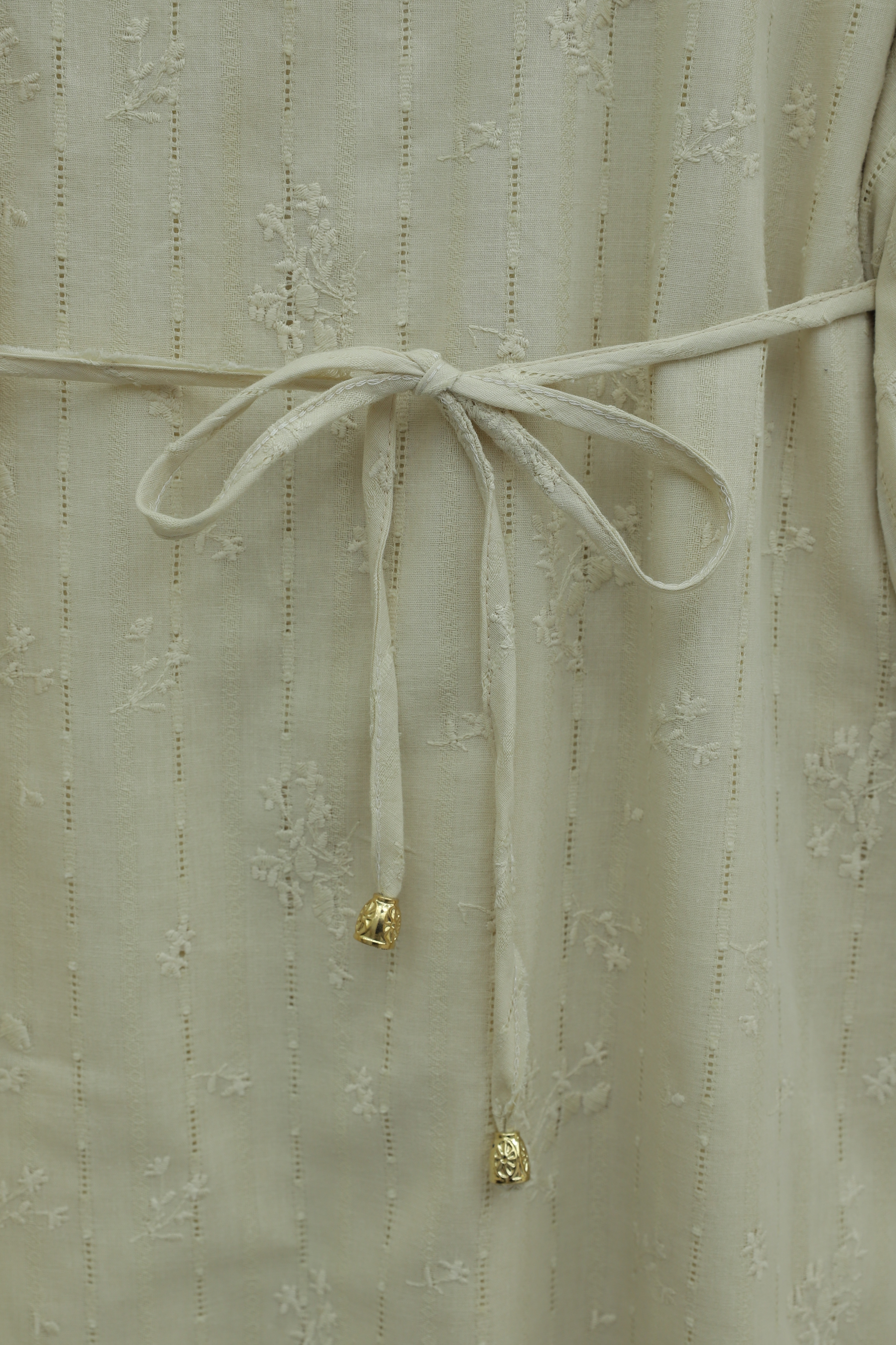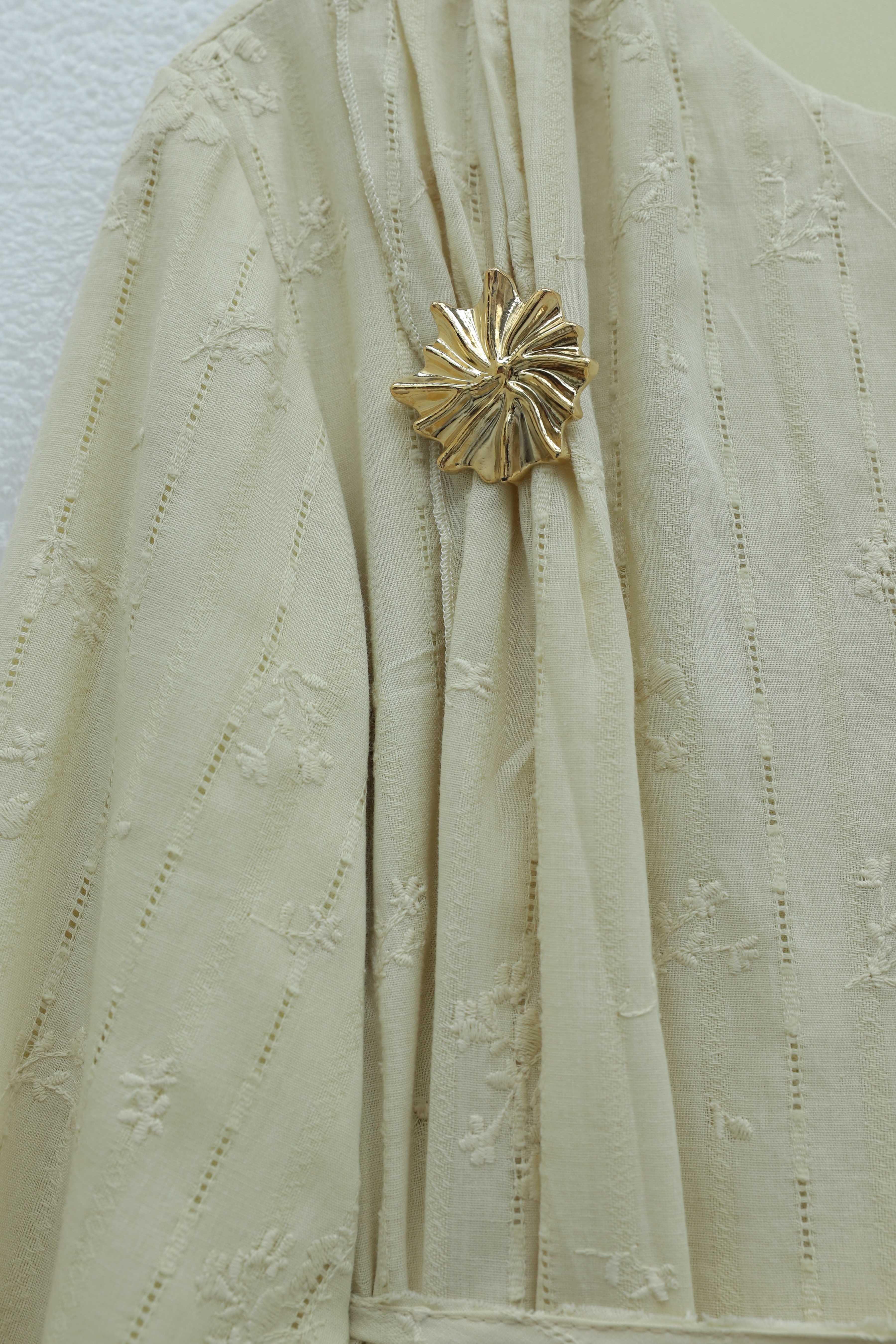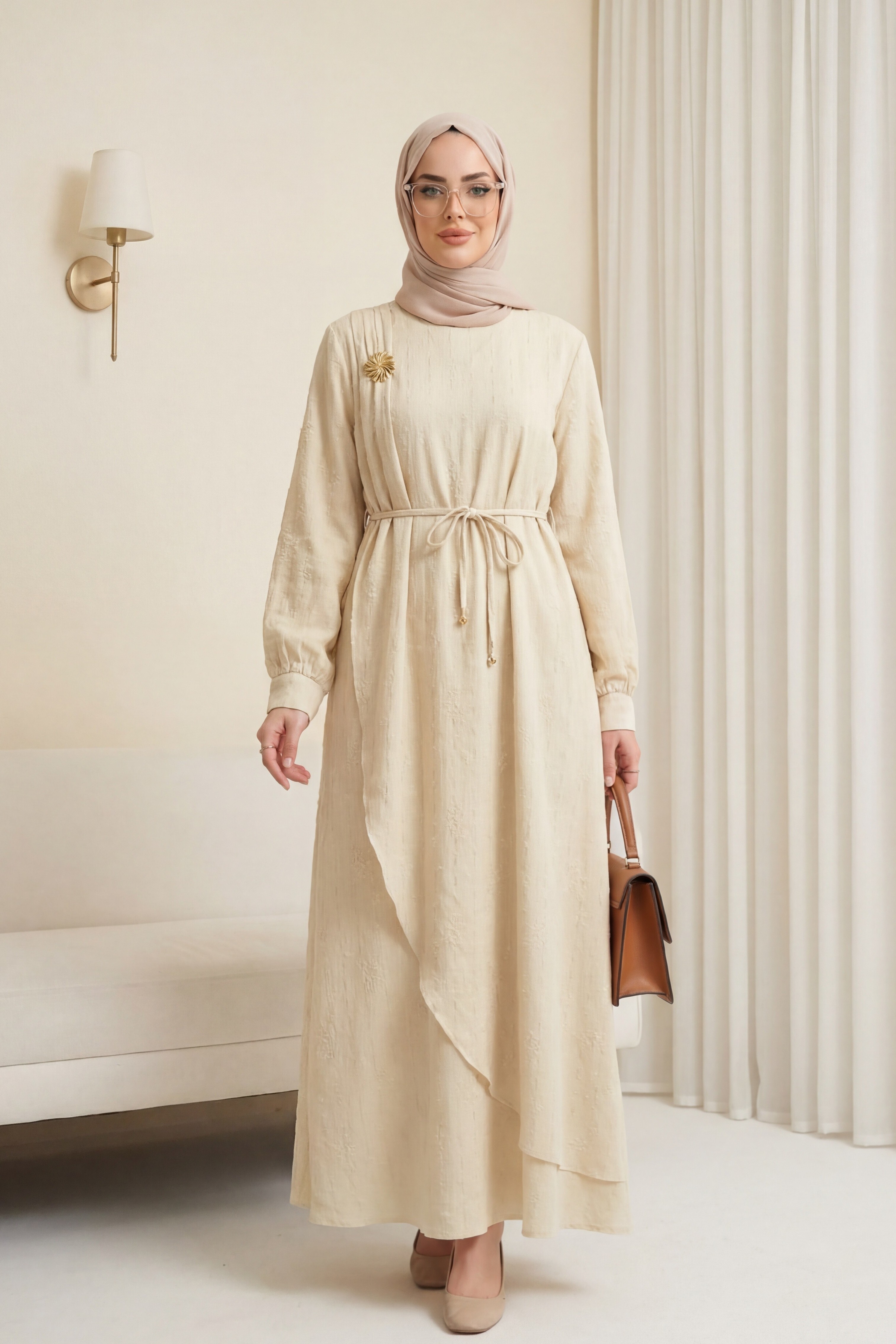 فستان من الكتان مبطن، ذو طبقتين أماميتين، مزين ببروش وحزام. -اللون البيج