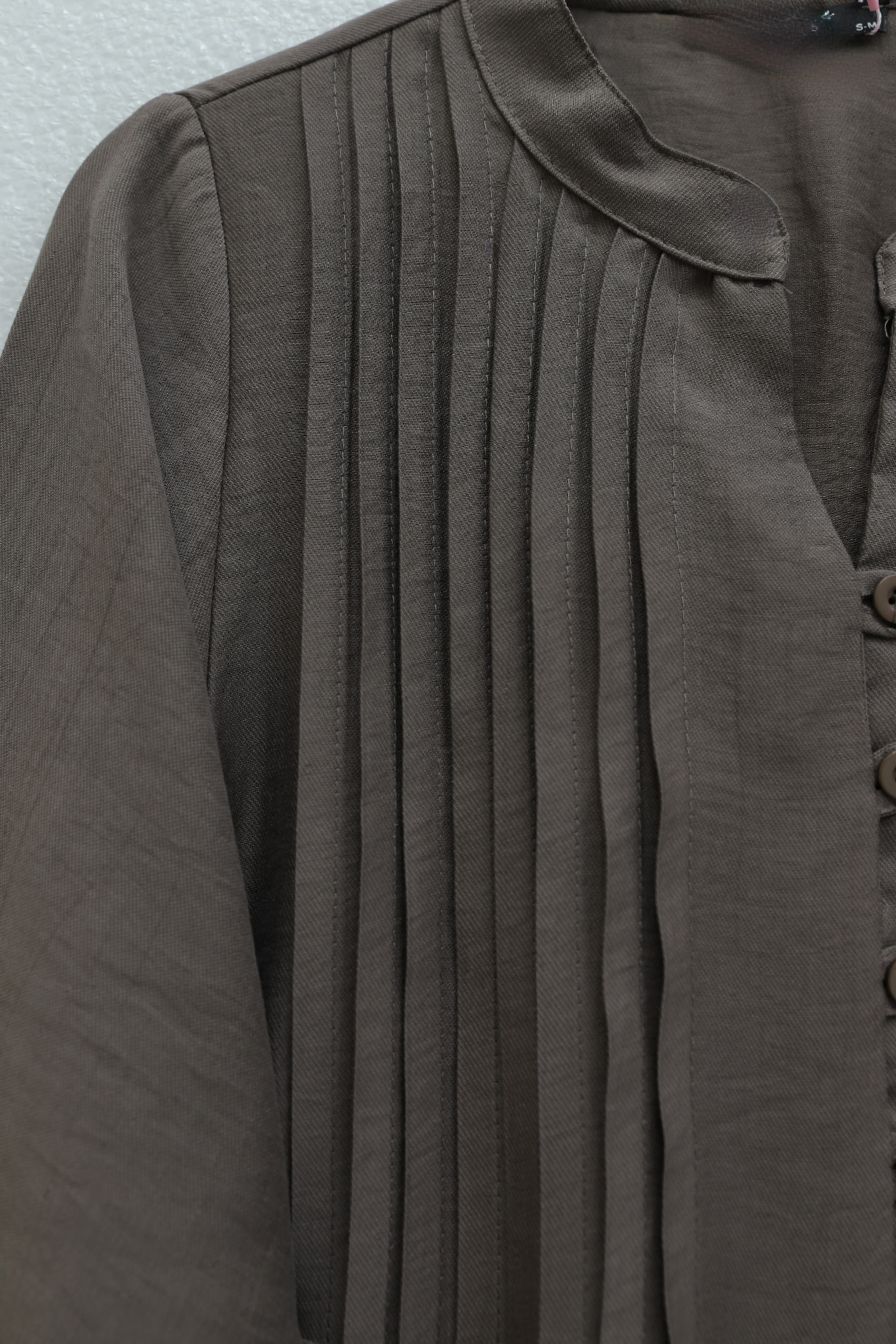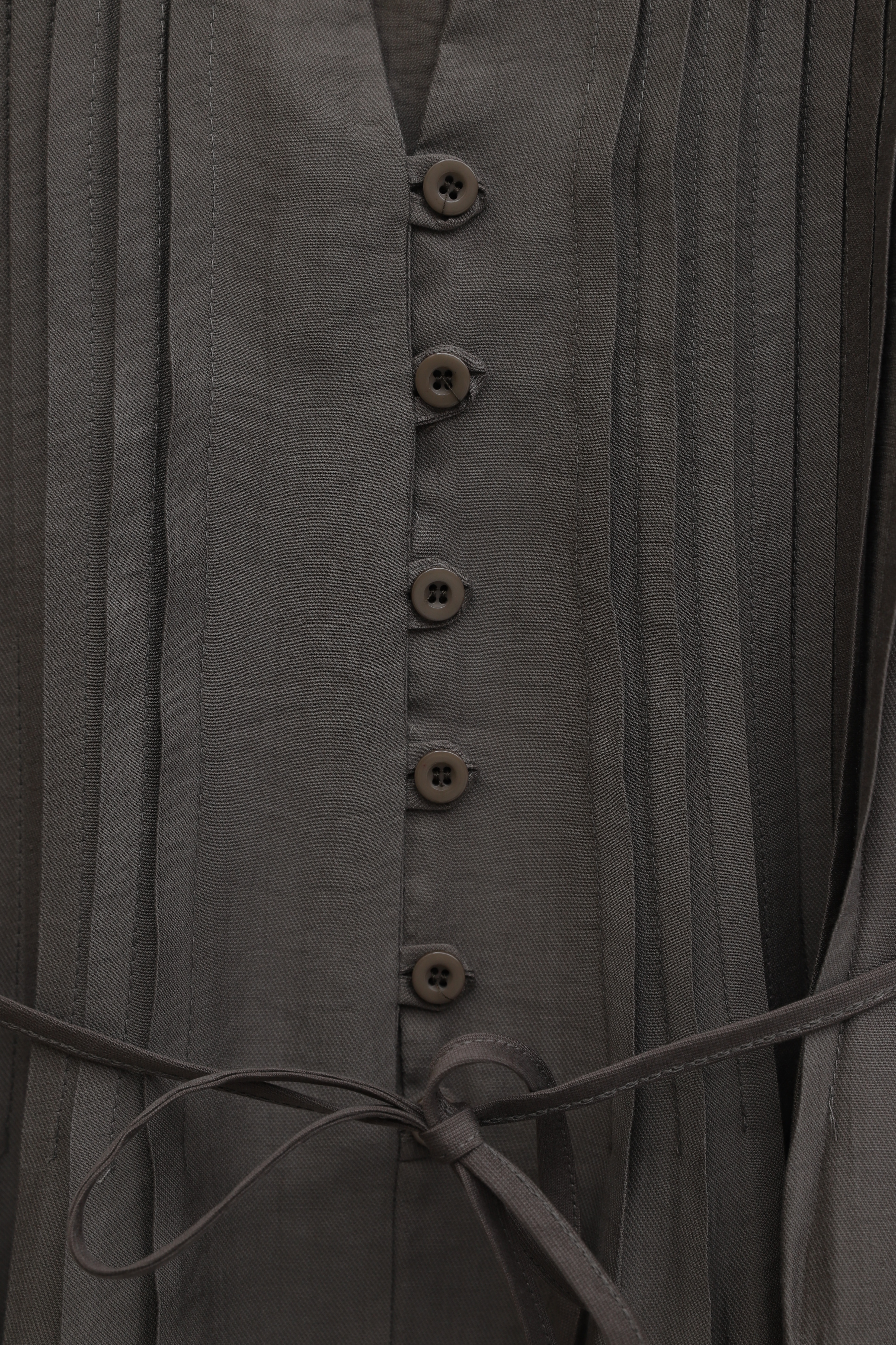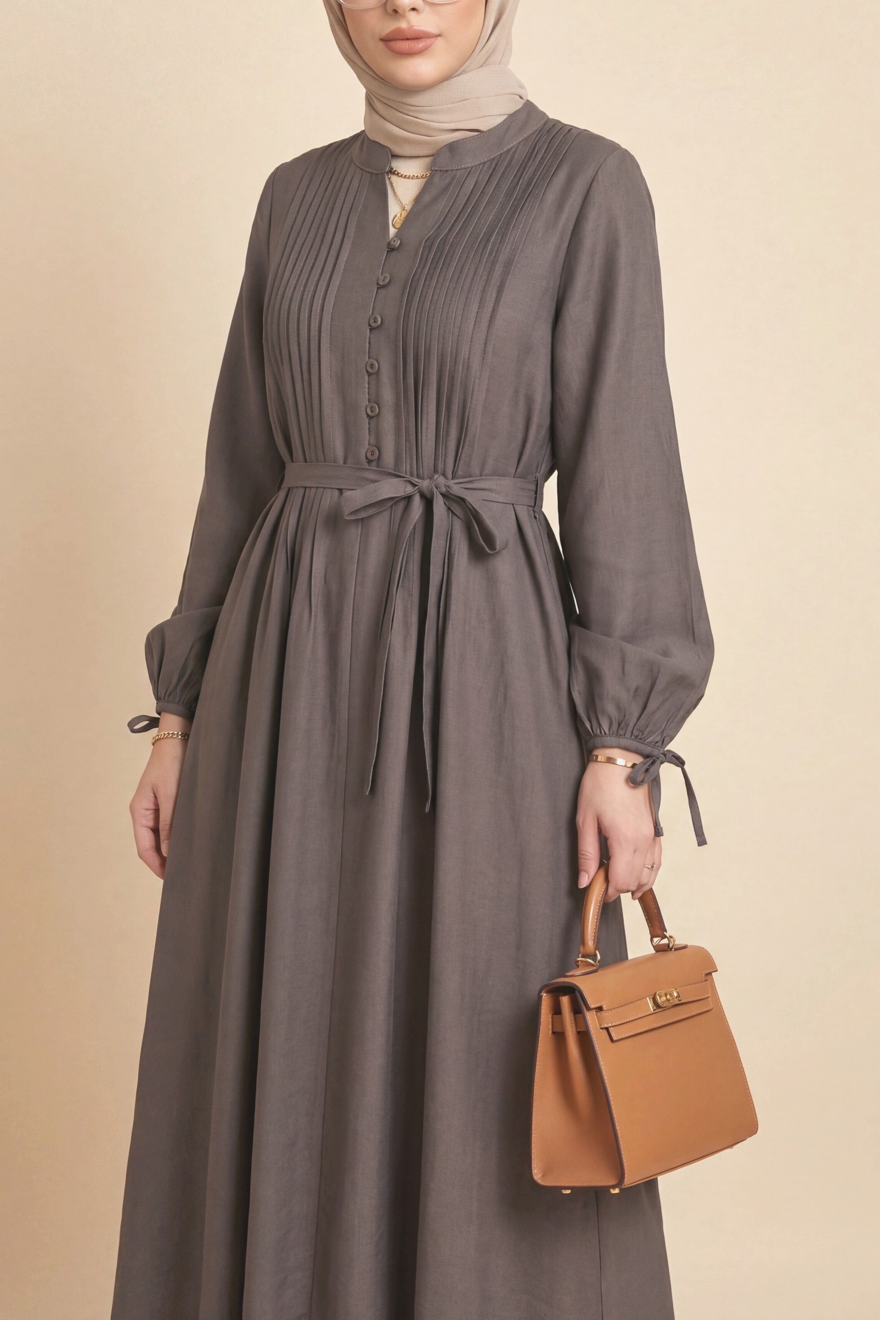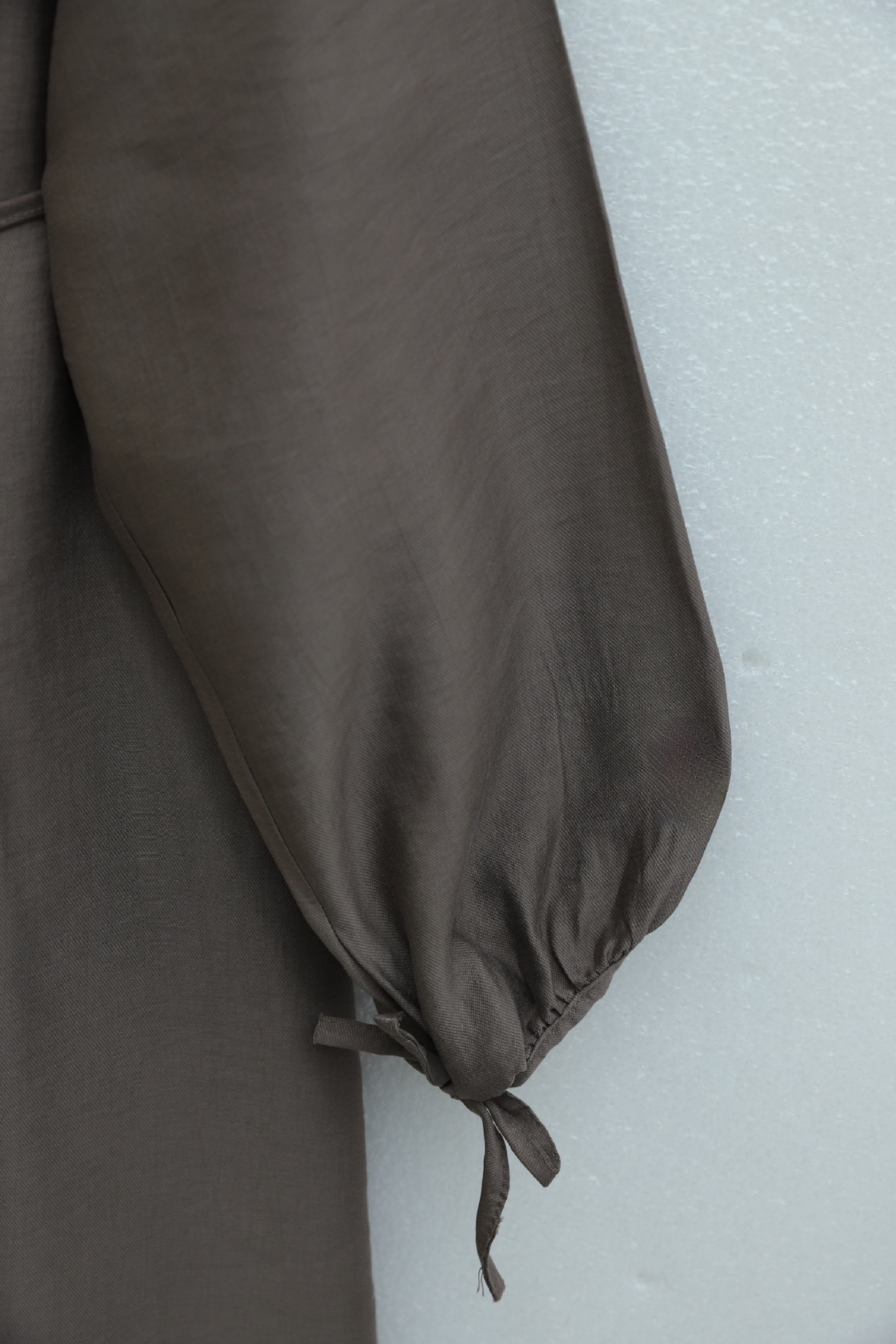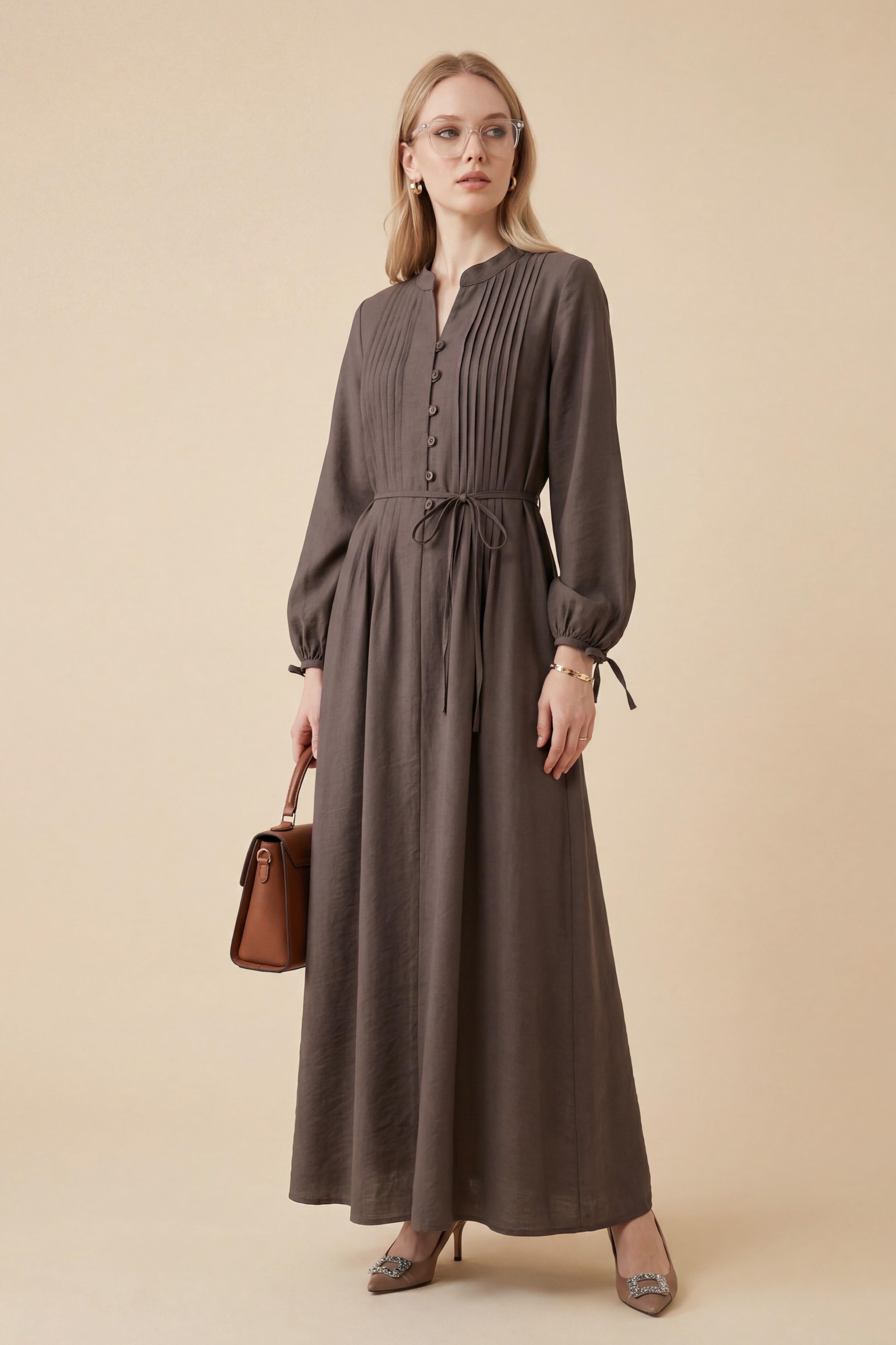 فستان تينسل مضلع بأزرار نصفية ورباط أمامي -قهوة مفتوحة