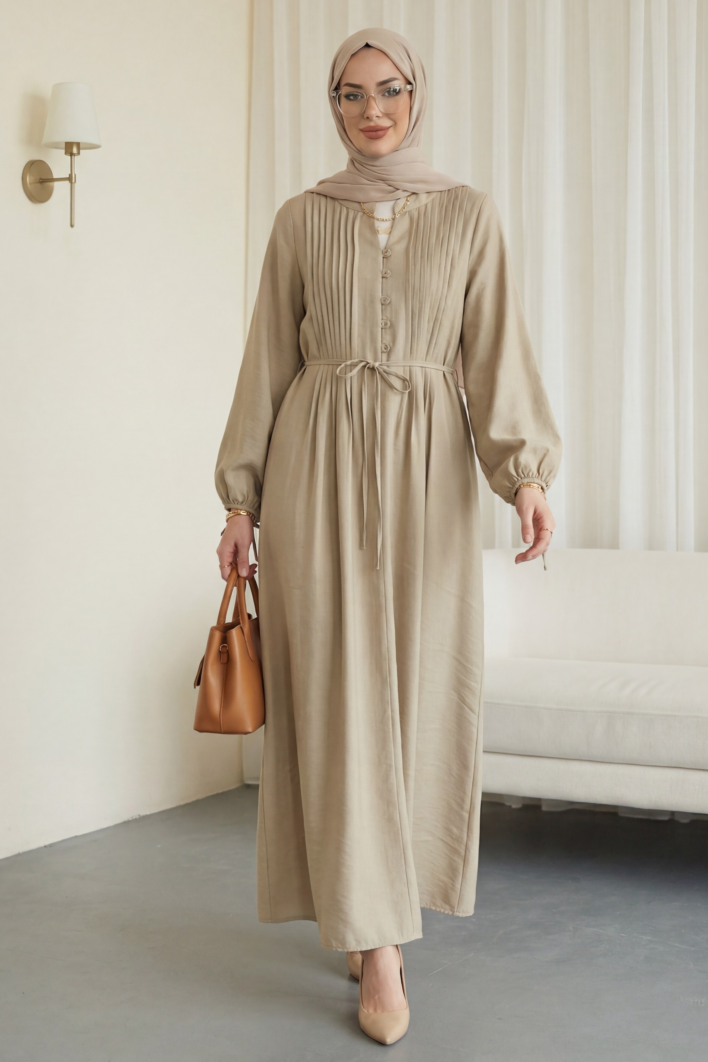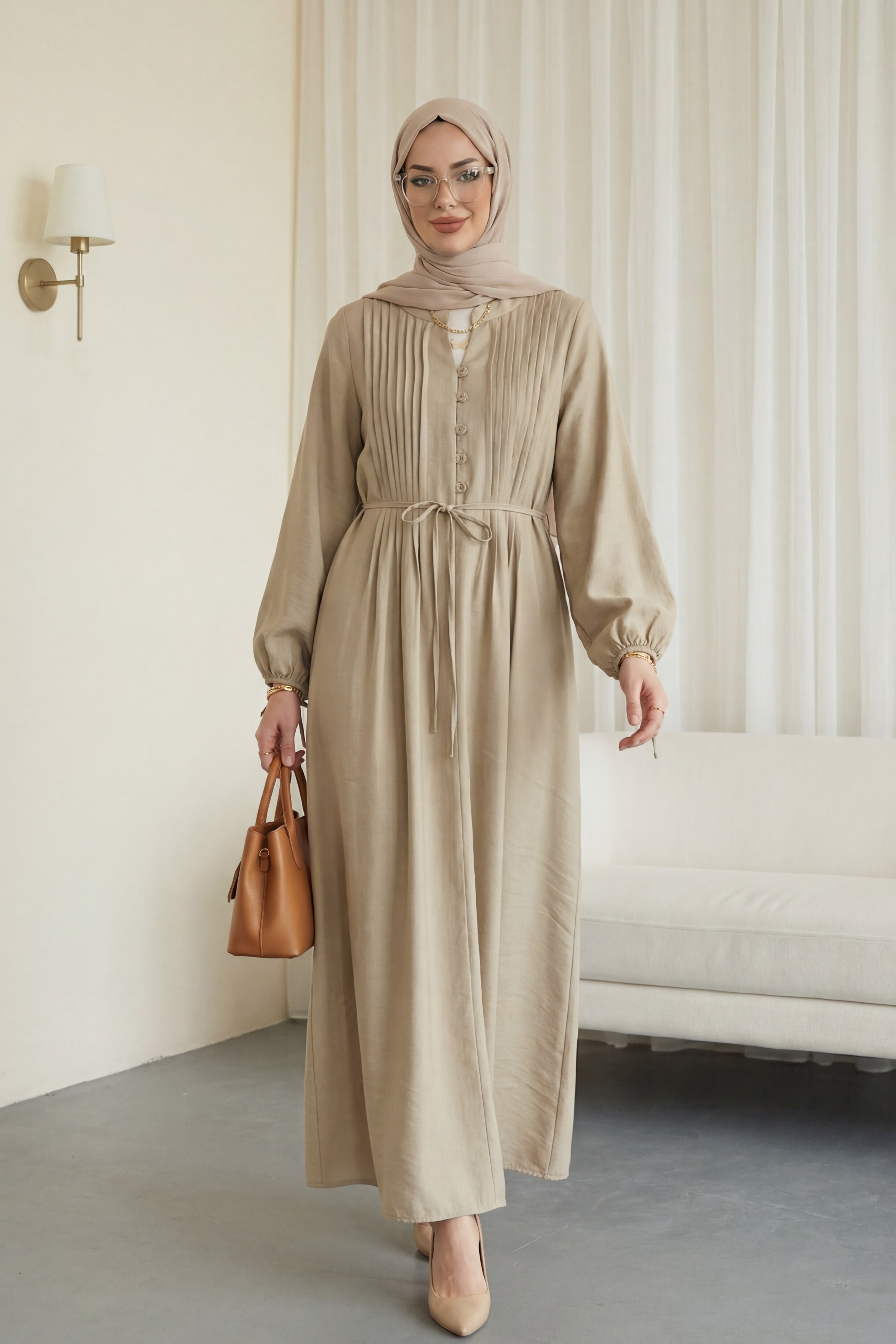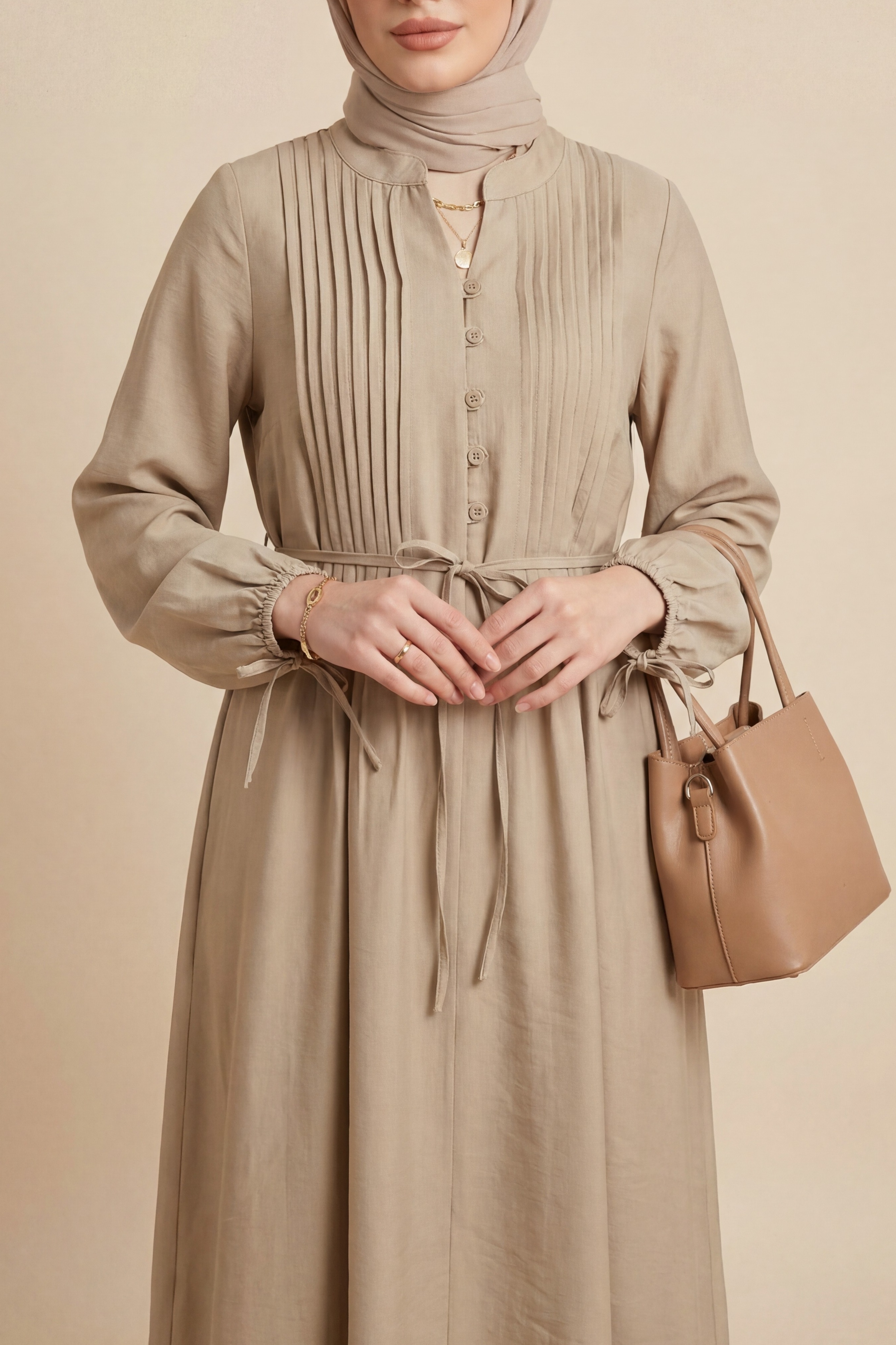 فستان تينسل مضلع بأزرار نصفية ورباط أمامي -اللون البيج