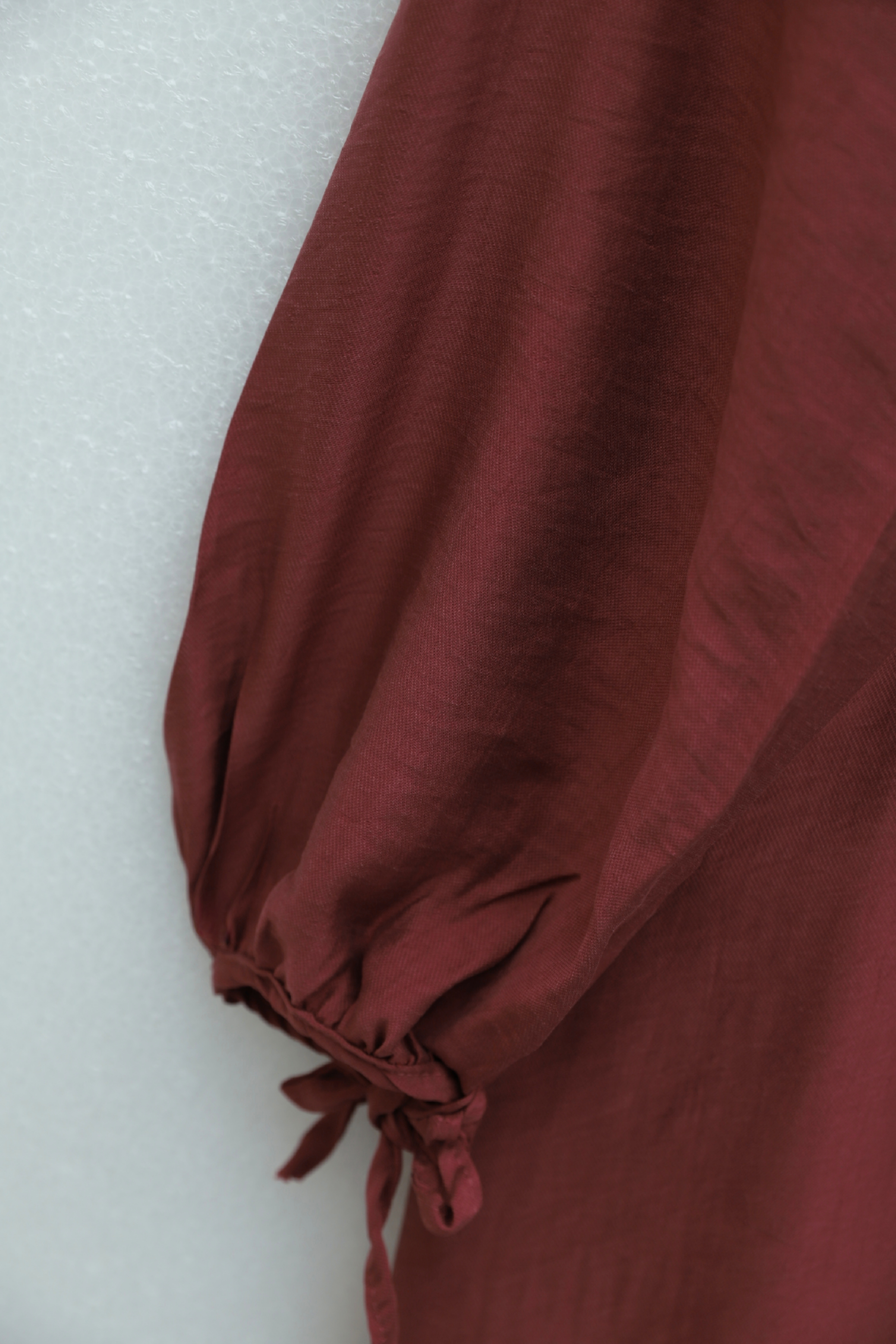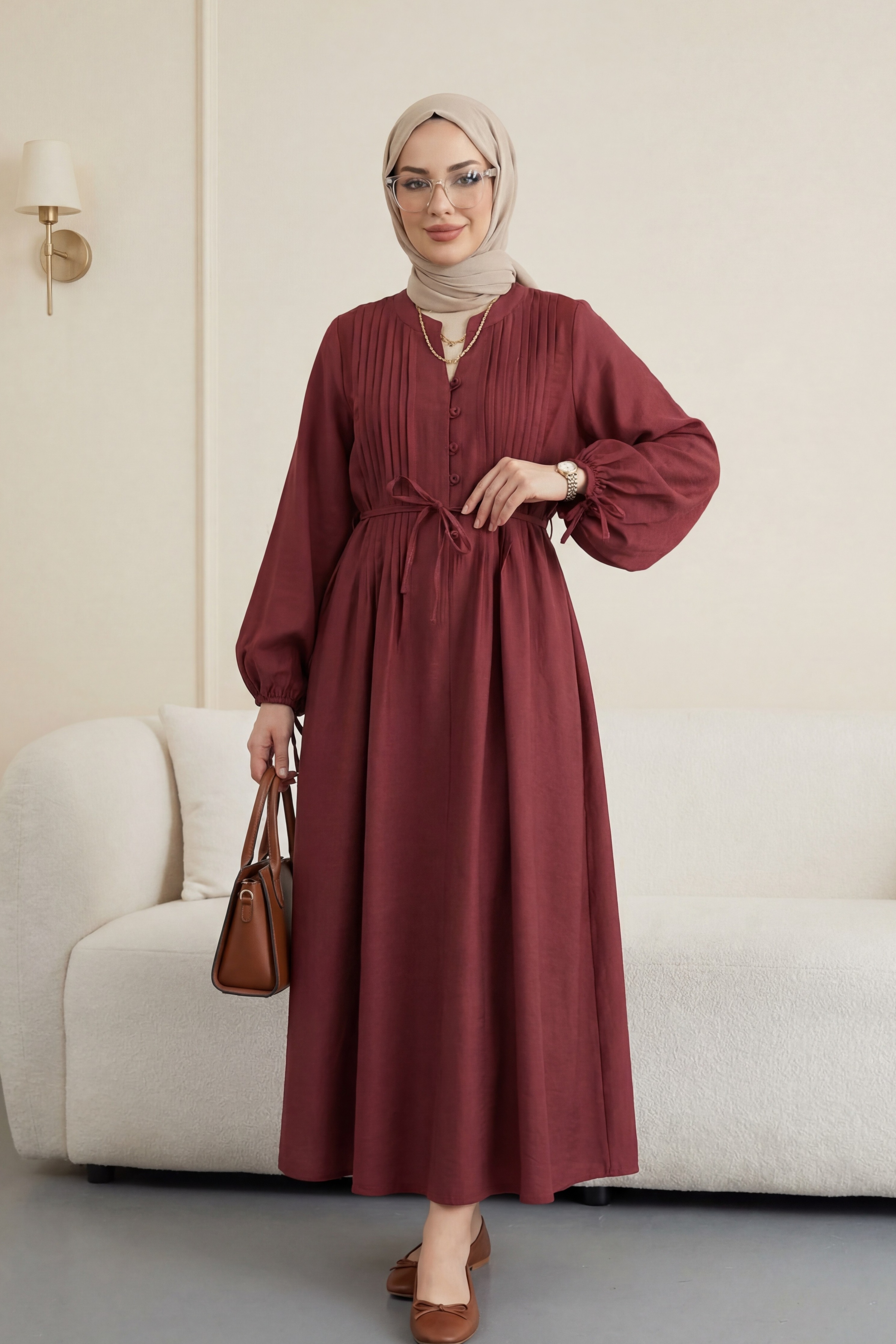 فستان تينسل مضلع بأزرار نصفية ورباط أمامي -بوردو