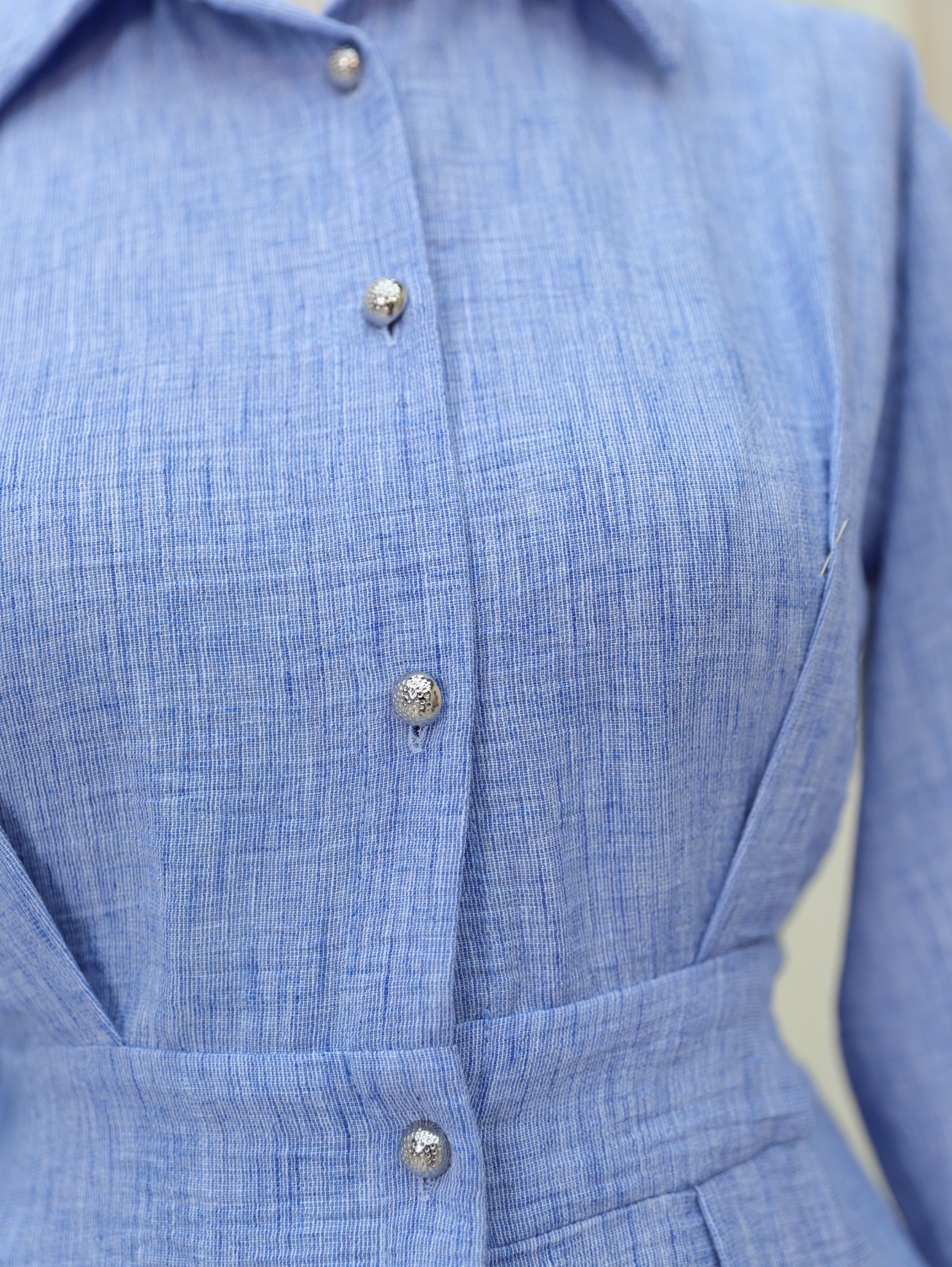 فستان من الكتان بنصف أزرار وخصر مطاطي -أزرق