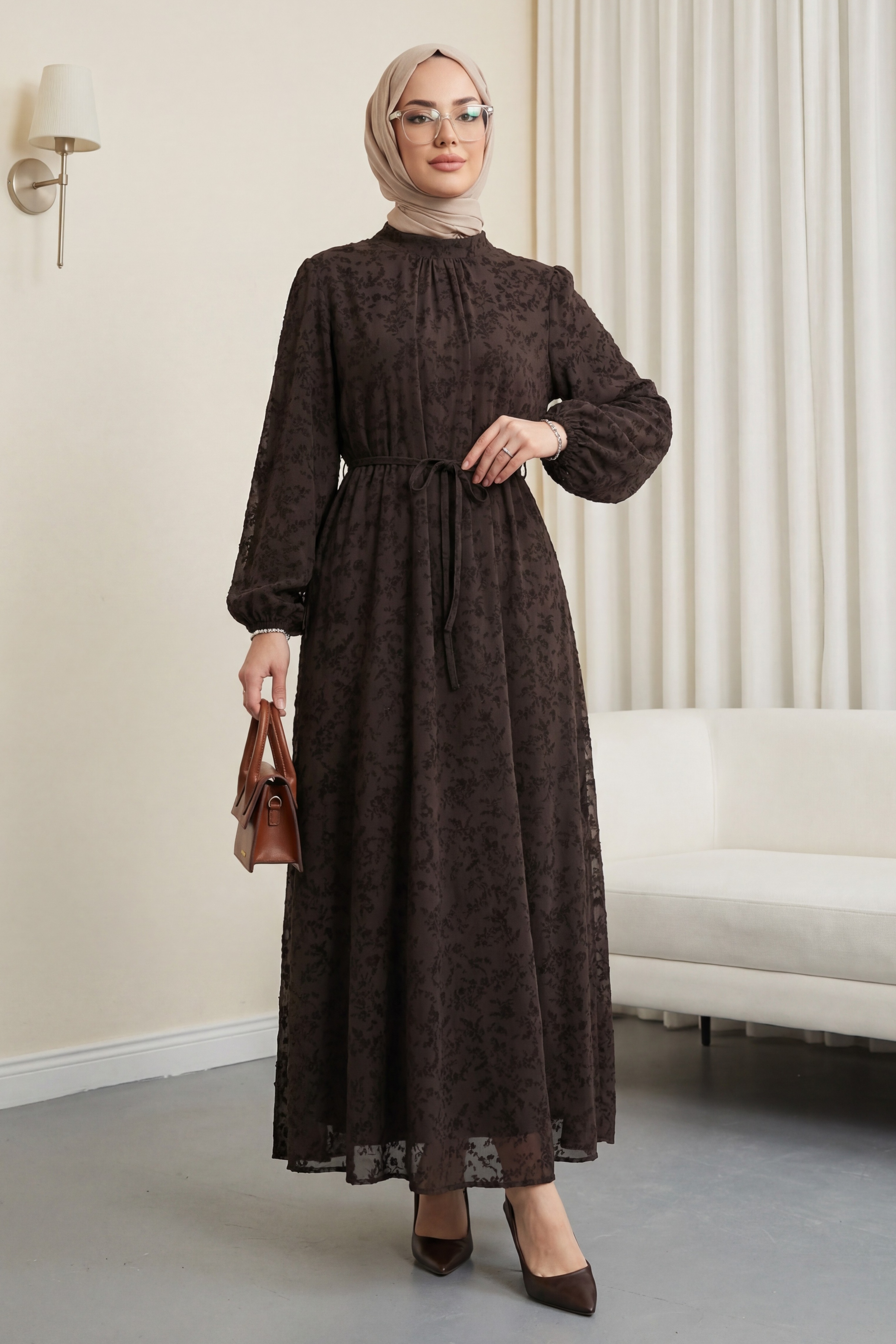 بنطلون بخصر مرتفع مع تفاصيل جيوب -بني محروق