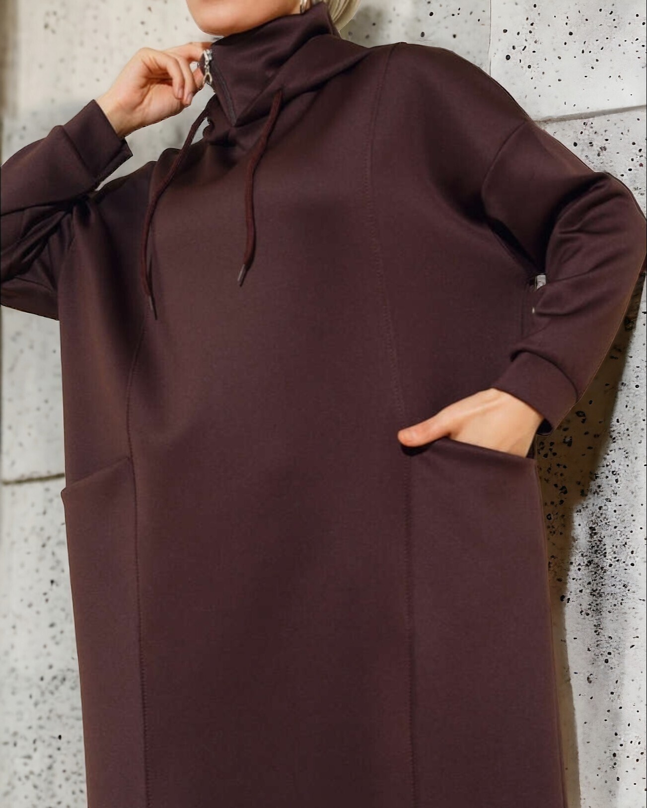 فستان سكوبا بياقة نصف عالية مع قبعة وجيوب كبيرة هو فستان عصري يجمع بين الراحة والأناقة. يوفر التصميم بقبعة حماية إضافية، بينما تقدم الياقة نصف العالية دفئًا في الأيام الباردة. تضيف الجيوب الكبيرة لمسة عملية، بينما يوفر قماش السكوبا مظهرًا مناسبًا للجسم ومرونة. مثالي للاستخدام اليومي والإطلالات الأنيقة المريحة، هذا الفستان هو الخيار المثالي.