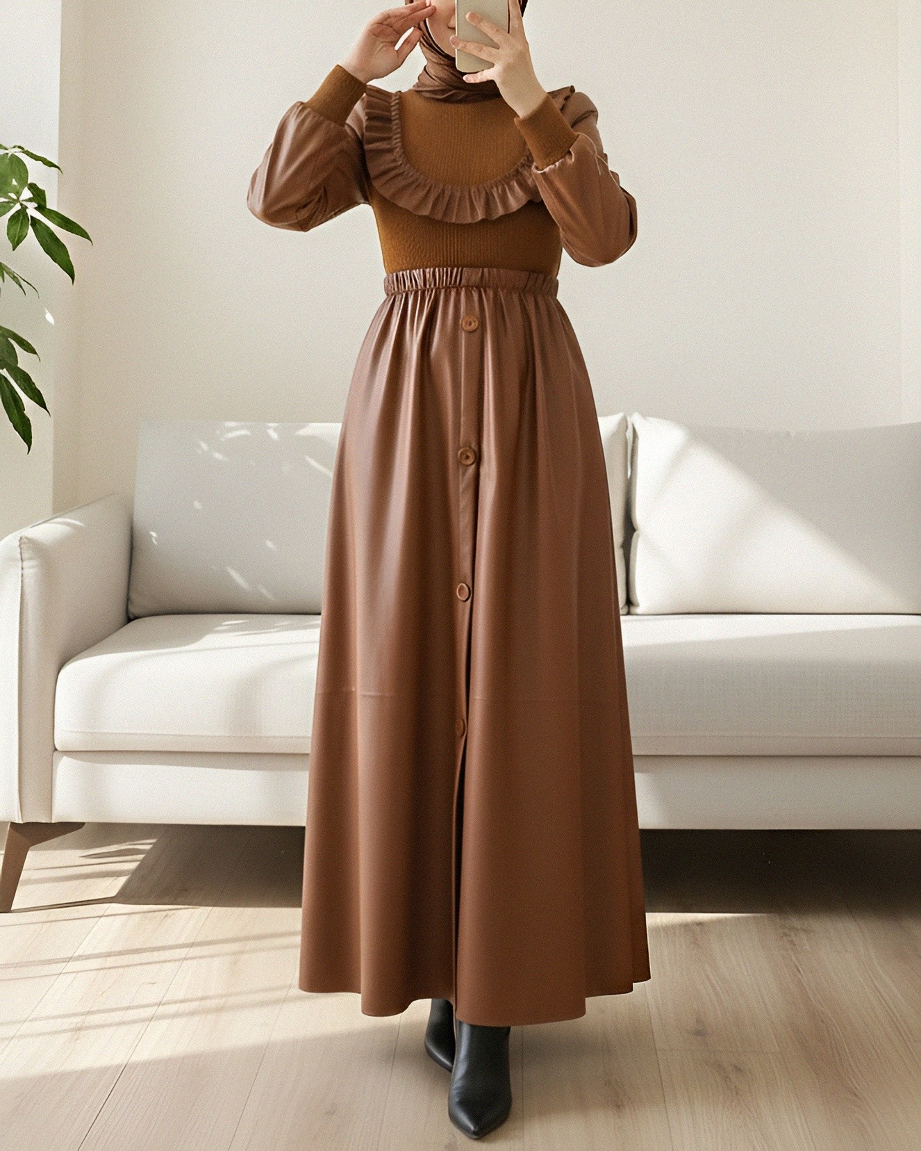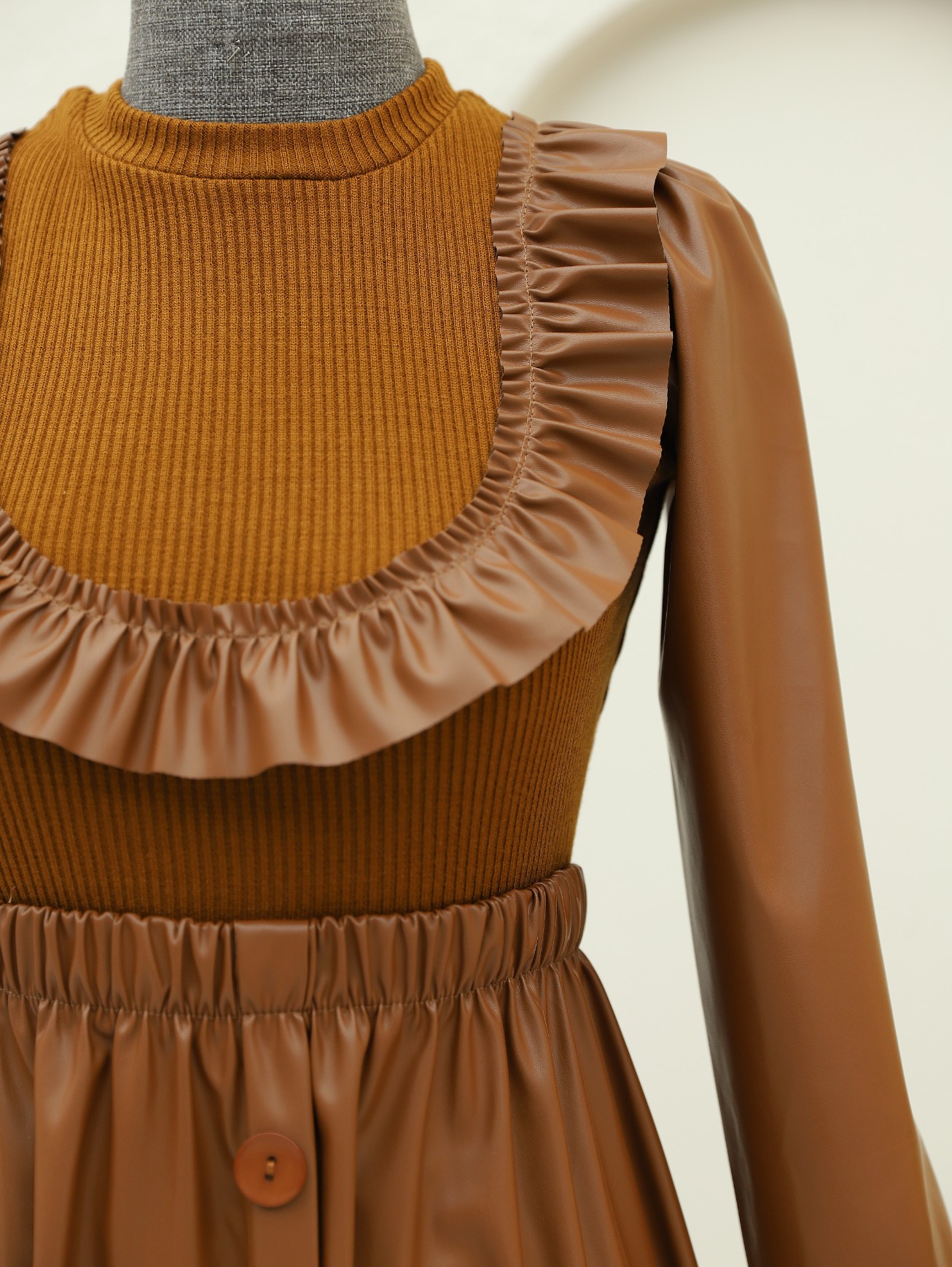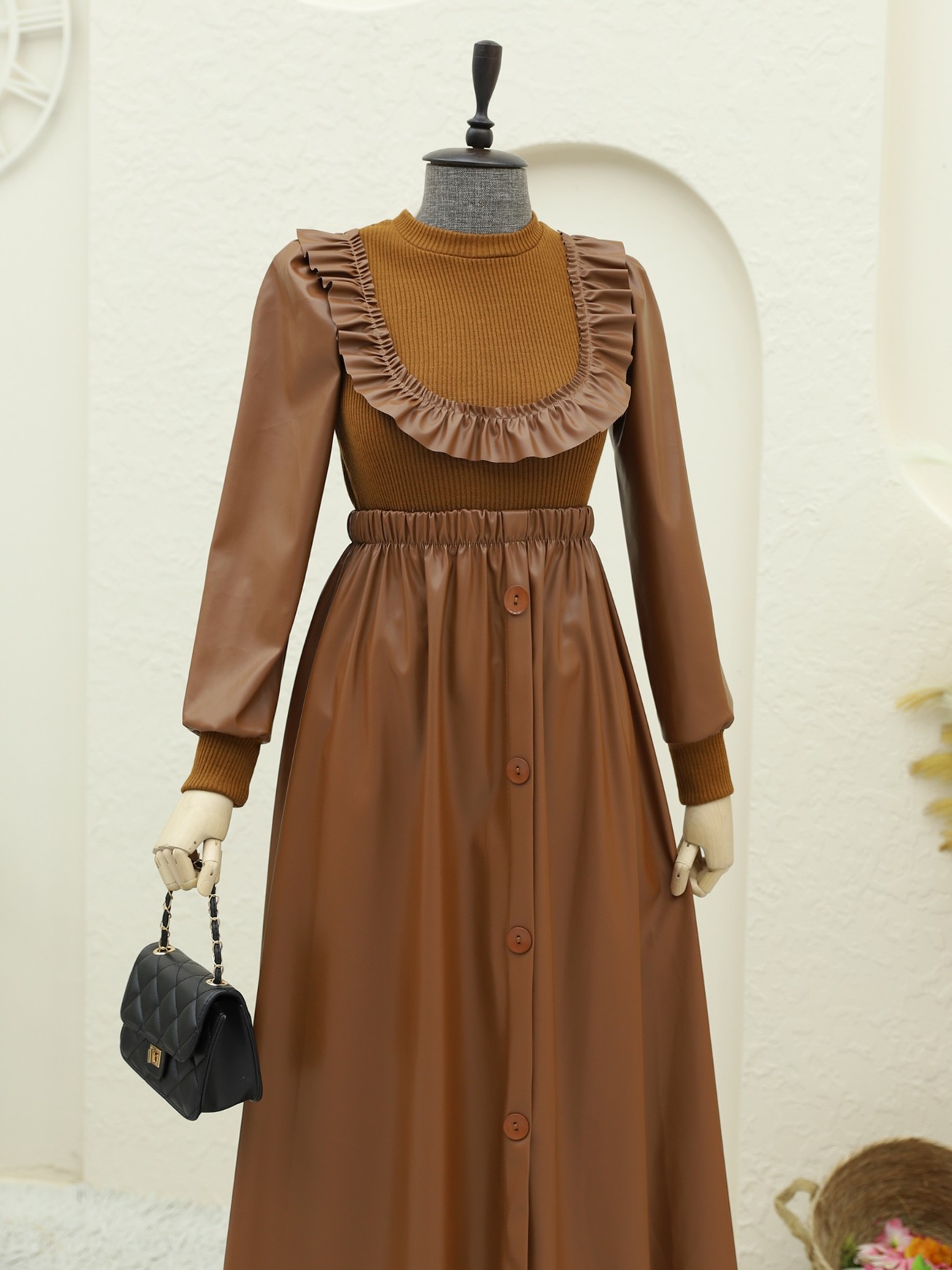 فستان الجلد بتفاصيل ترايكو وأمامه فُرَف يقدم إطلالة أنيقة وجذابة. تضيف تفاصيل الفُرَف والجزء العلوي من الترايكو لمسة أنثوية، بينما يوفر الجزء السفلي من الجلد مظهرًا راقيًا. مثالي للمناسبات الخاصة أو لإطلالة يومية أنيقة، هذا الفستان يجمع بين الأناقة والراحة بسلاسة. خيار مثالي لمن يبحثون عن مظهر عصري وأنيق!
