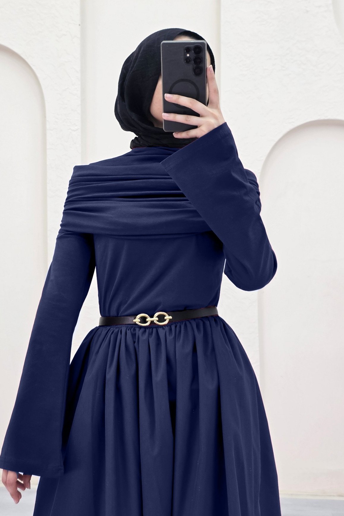 تنورة بوبلين وفستان سيندي المطوي المكون من قطعتين -كحلي