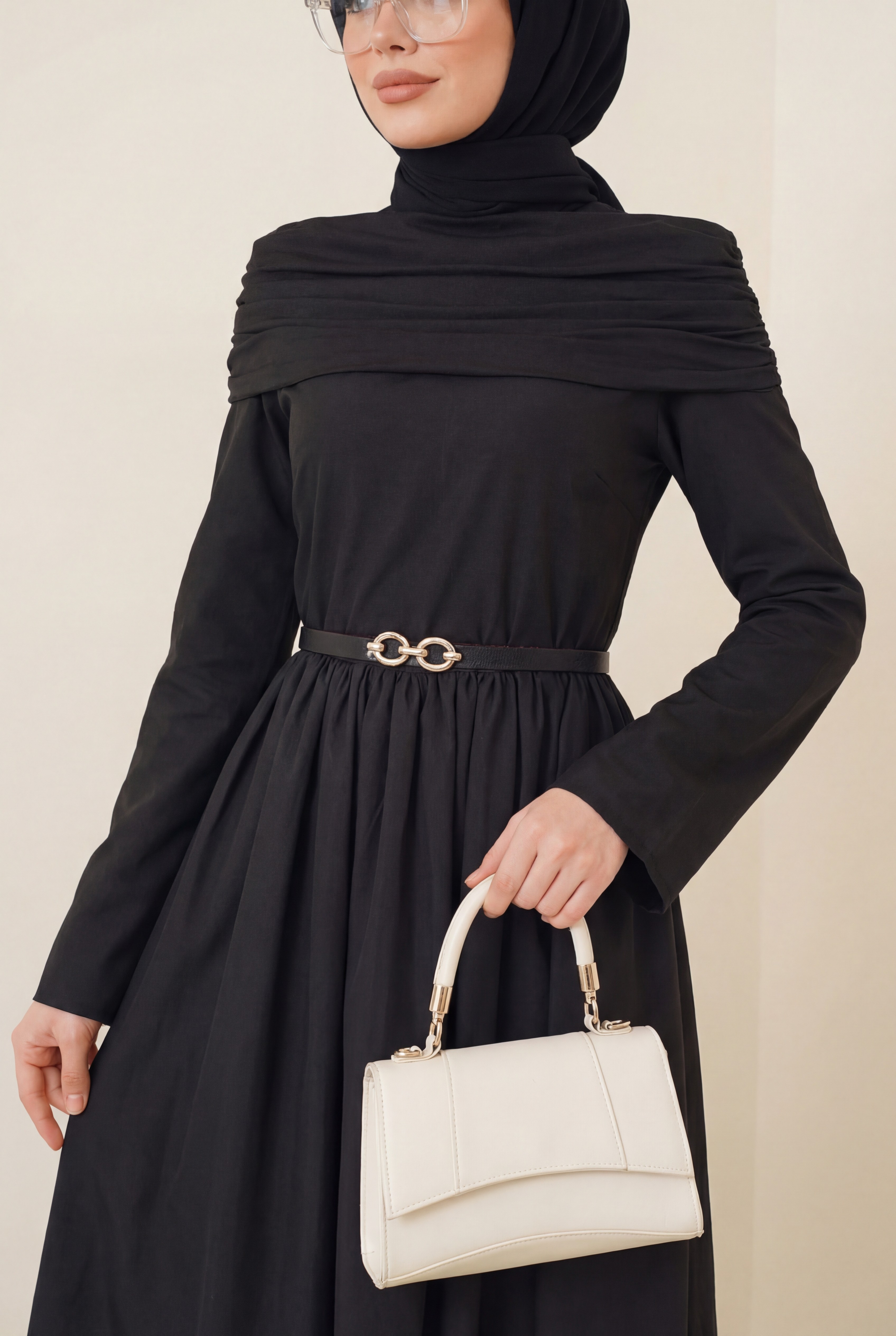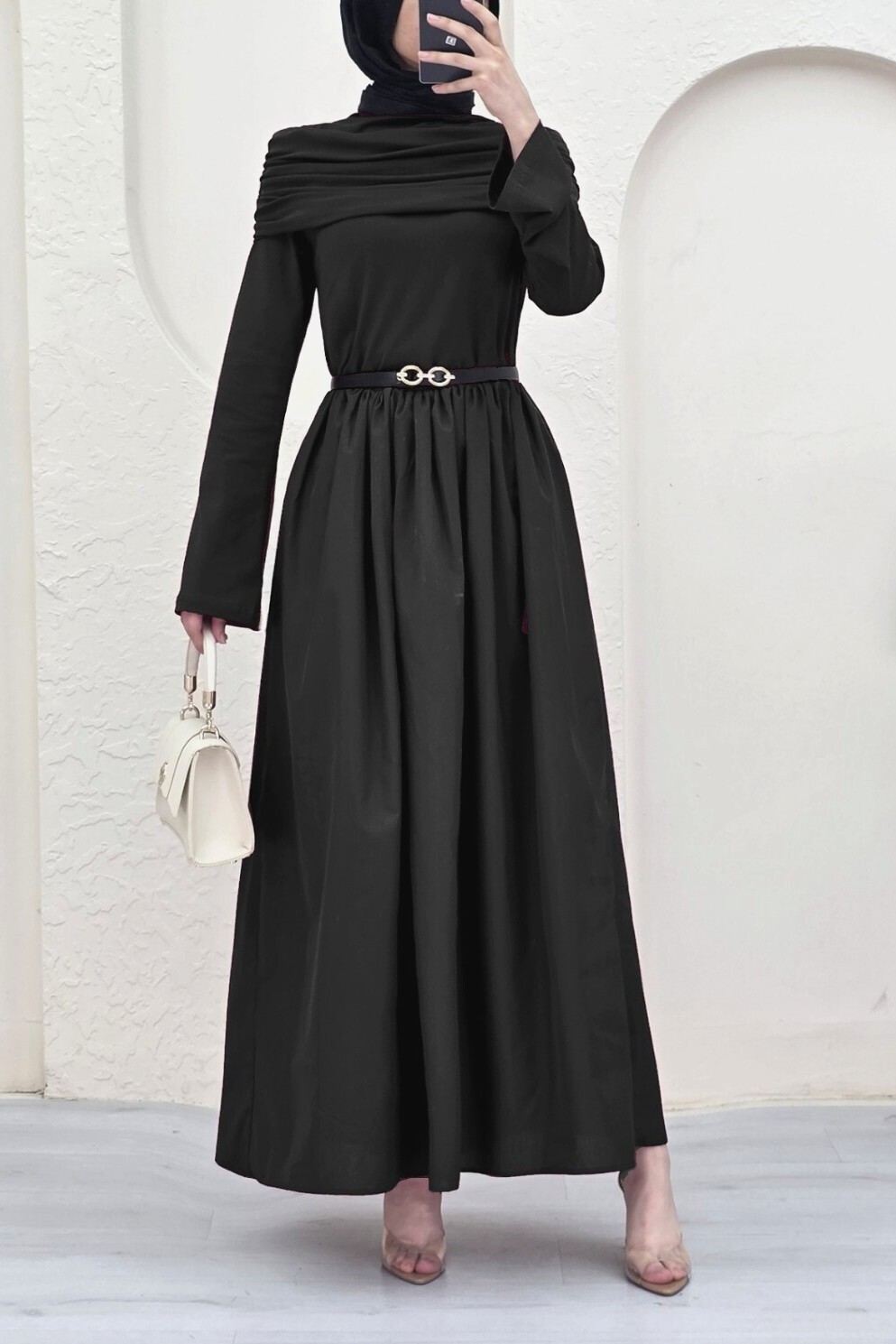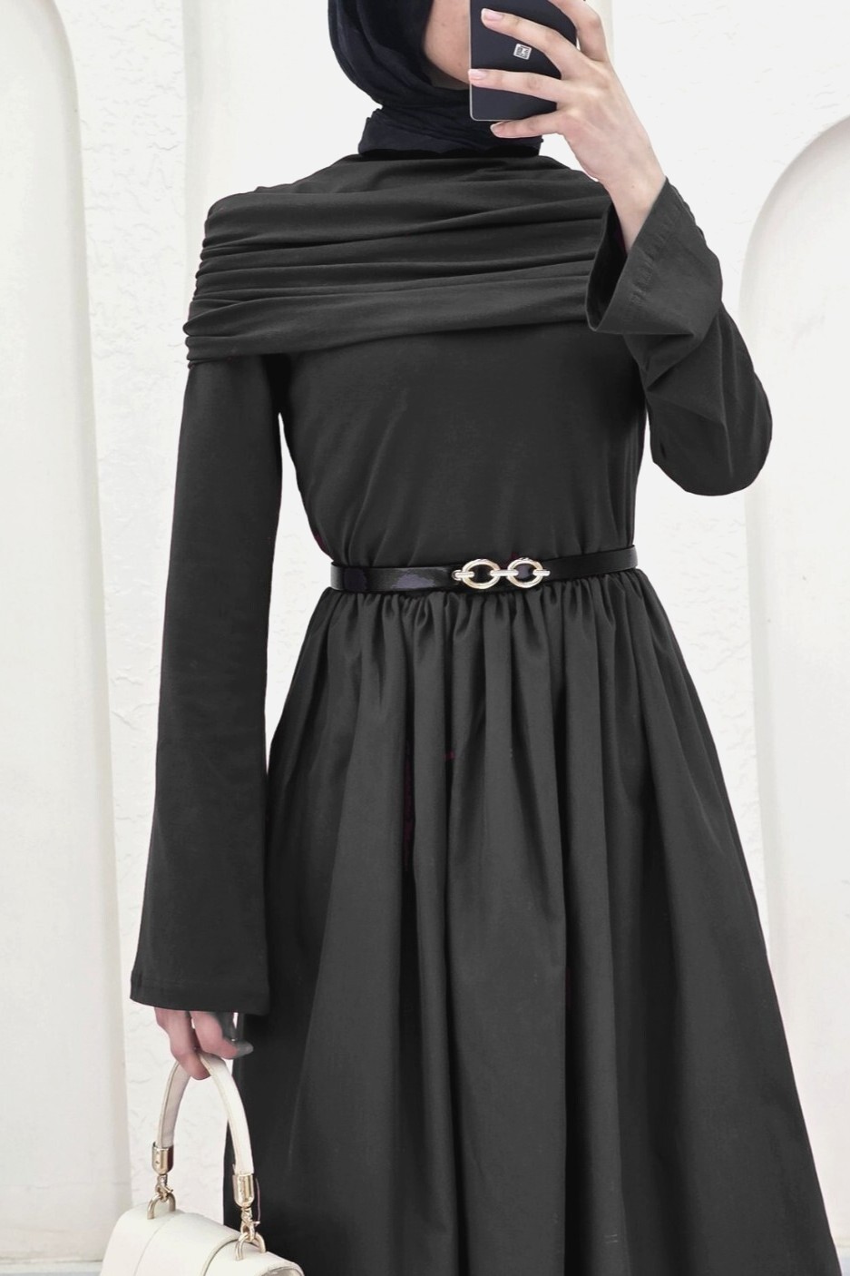 تنورة بوبلين وفستان سيندي المطوي المكون من قطعتين -أسود