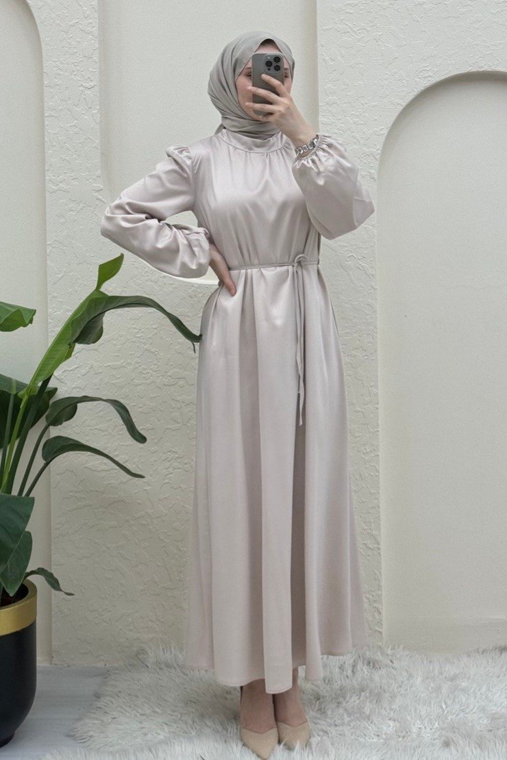 فستان سهرة من الساتان مع خصر دانتيل وأكمام مطاطية -اللون البيج