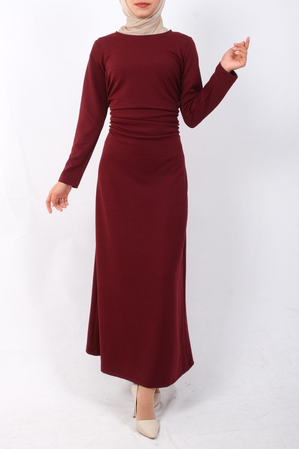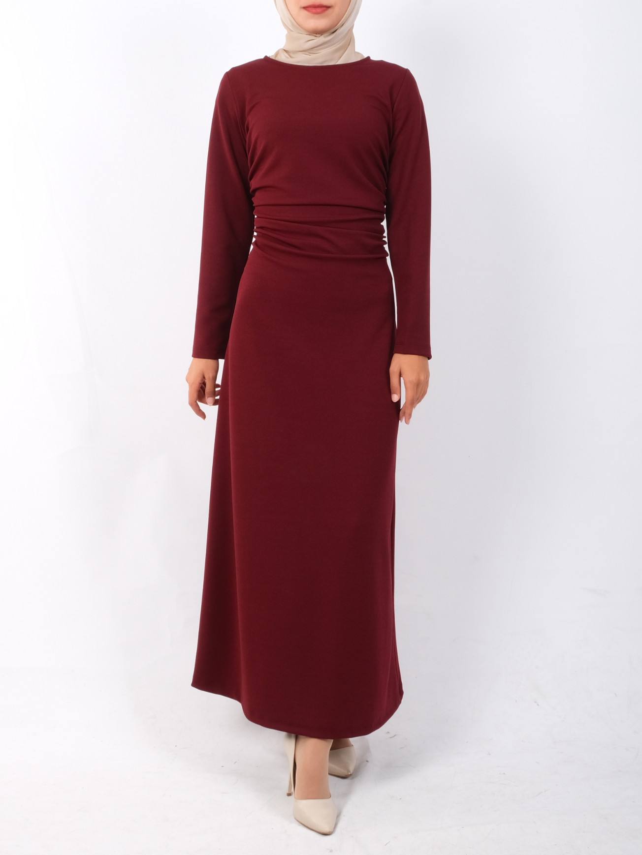 فستان محبوك من الكريب ليكرا، مجمع عند الخصر -بوردو