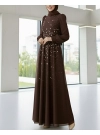 Omuzu Taşlı Yırtmaçlı Elbise -بني كاشف