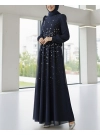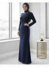 فستان سهرة من التول مع تفاصيل حجرية على الجهة الأمامية والبطانة -كحلي