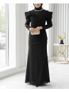 Broşlu Düşük Omuz Uzun Elbise -أسود