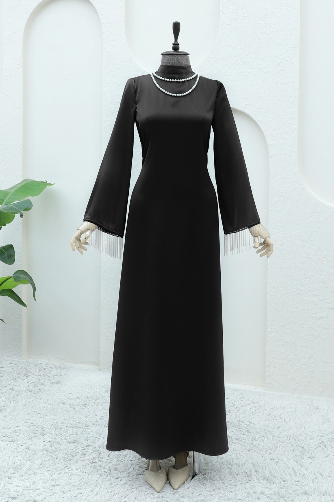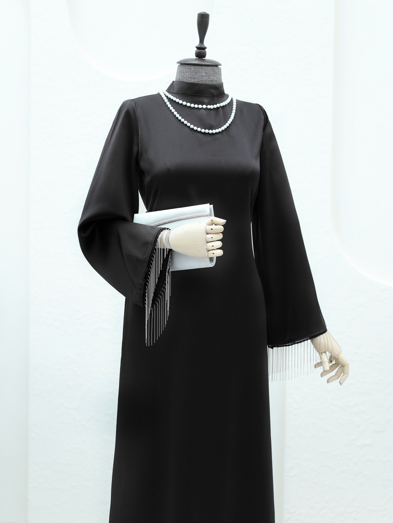 فستان بتفاصيل سلسلة وأكمام من الدانتيل في الخلف -أسود
