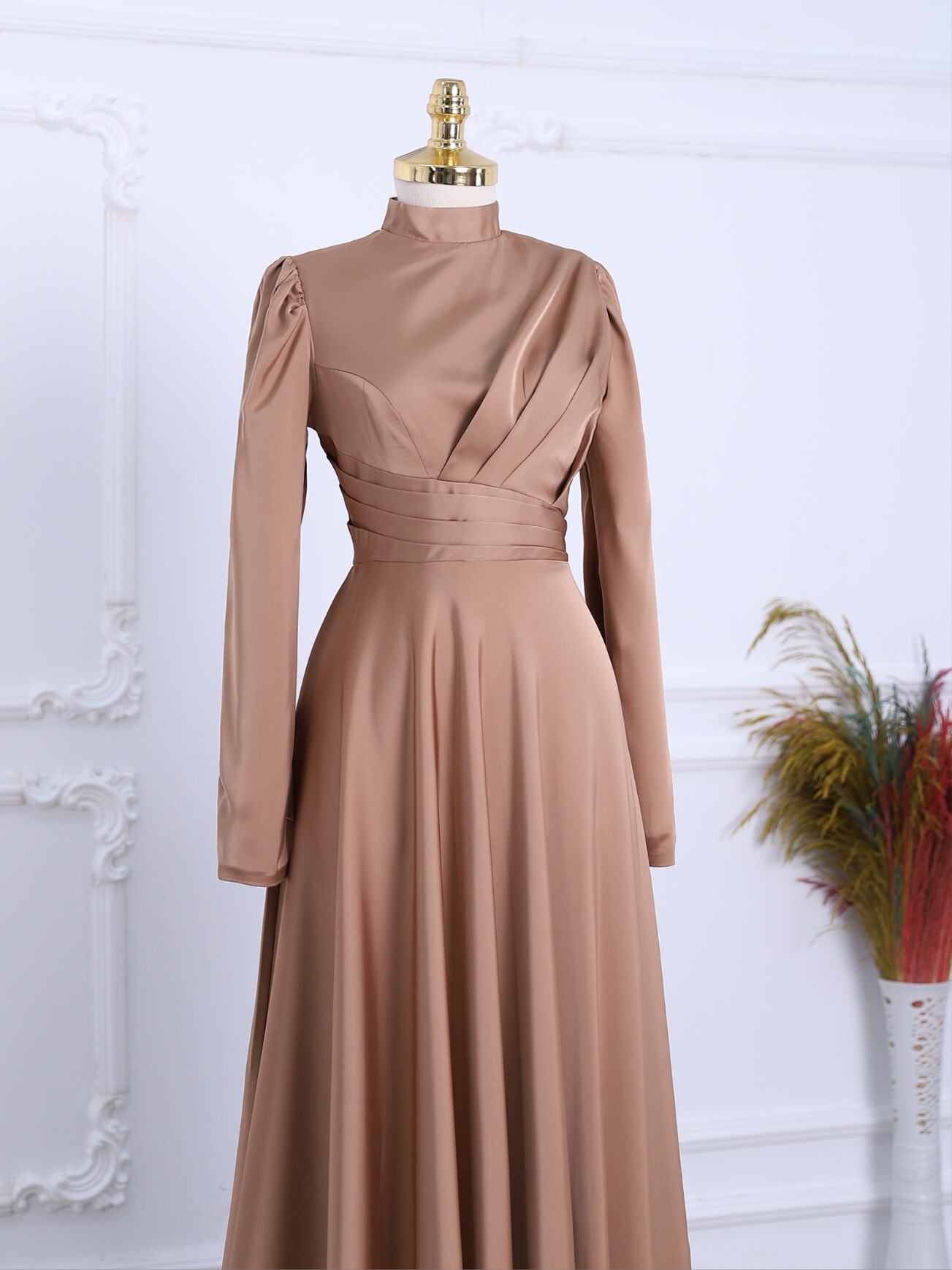 نموذجنا من الساتان للسهرات مع خط رقبة مهيمن وسحاب أمامي وخلفي مطوي هو أحد أكثر القطع المرغوبة في الموسم الجديد.