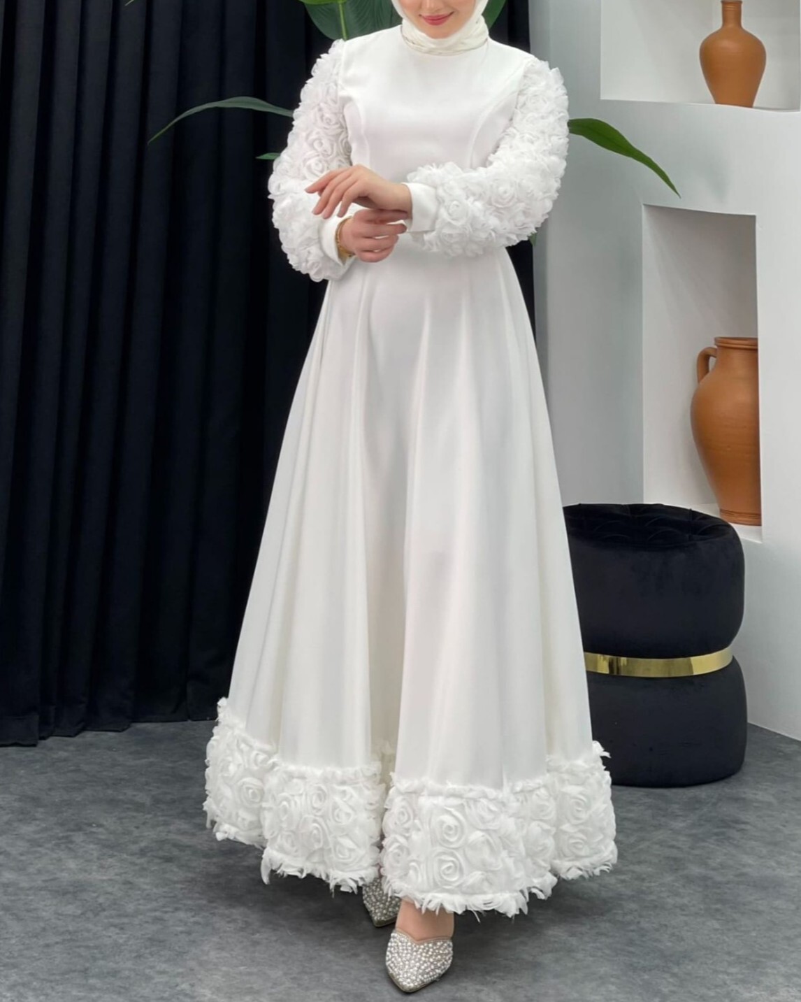 فستان الساتان المسائي بتفاصيل الورد على التنورة والأكمام يجمع بين الأناقة والرقي. تضيف الزخارف الوردية لمسة دقيقة وراقية، بينما يعزز لمعان قماش الساتان إطلالتك المسائية. هذا الفستان هو خيار مثالي للمناسبات الخاصة، وحفلات الزفاف، والفعاليات المسائية. مثالي لأولئك الذين يبحثون عن أسلوب رومانسي وأنيق.