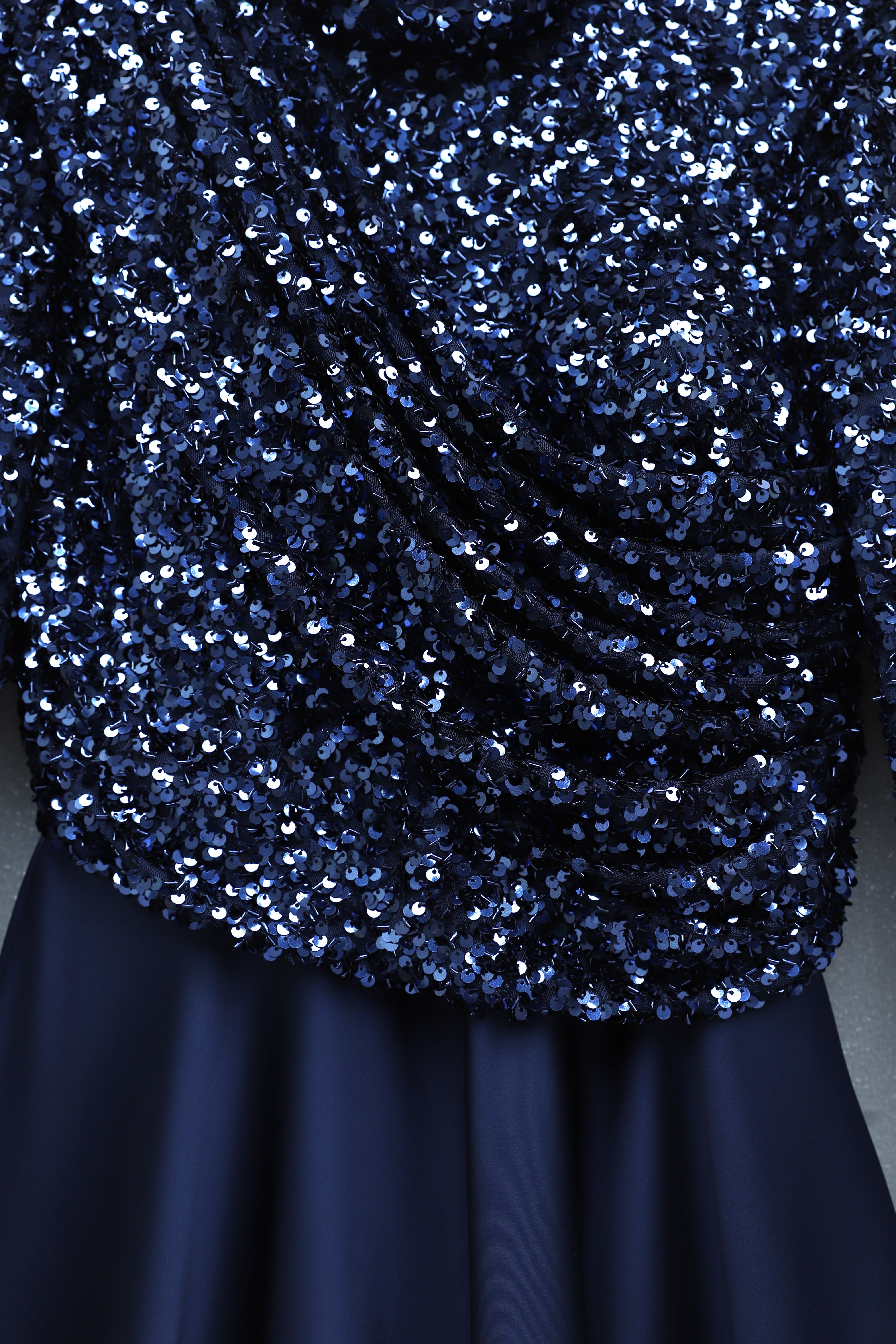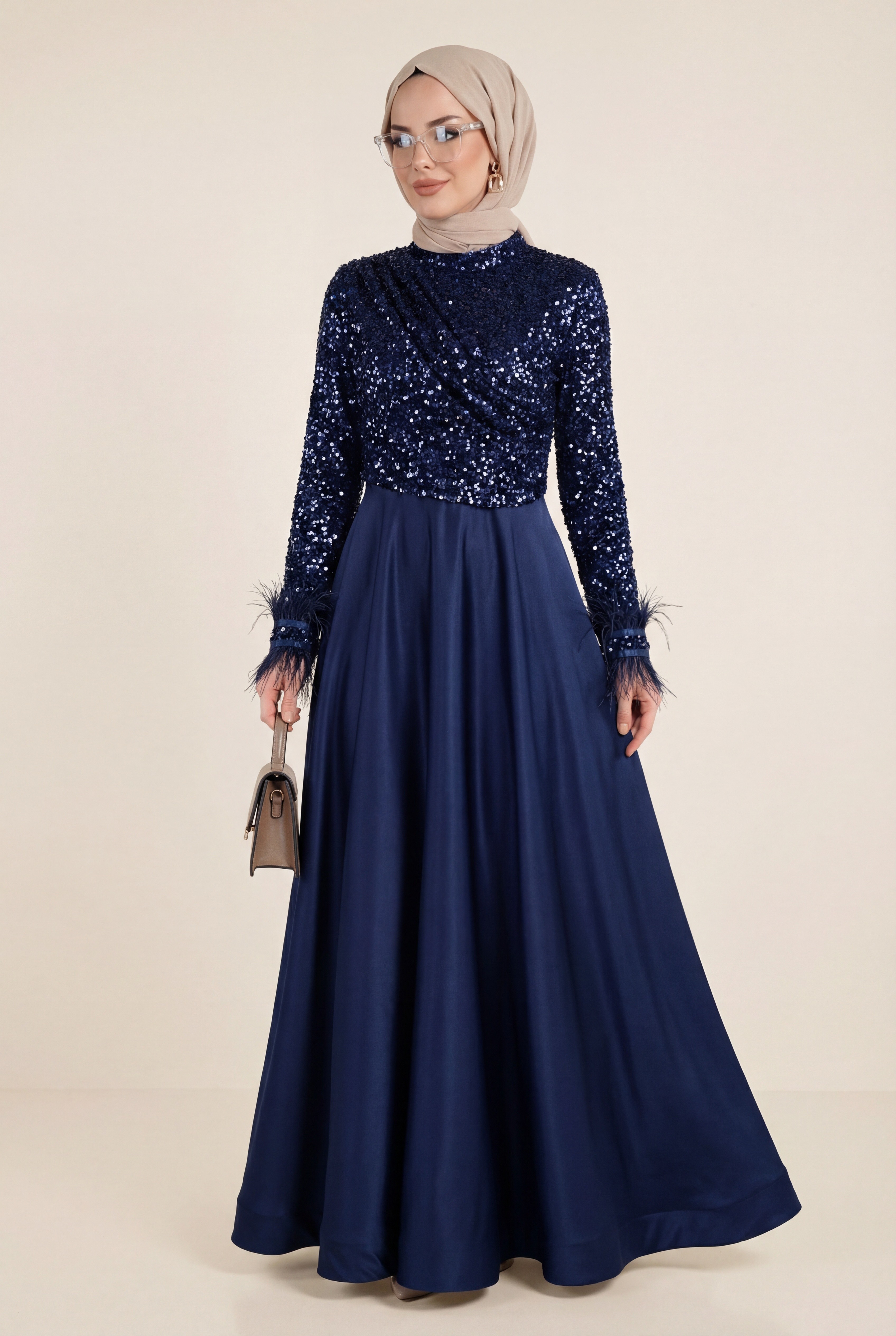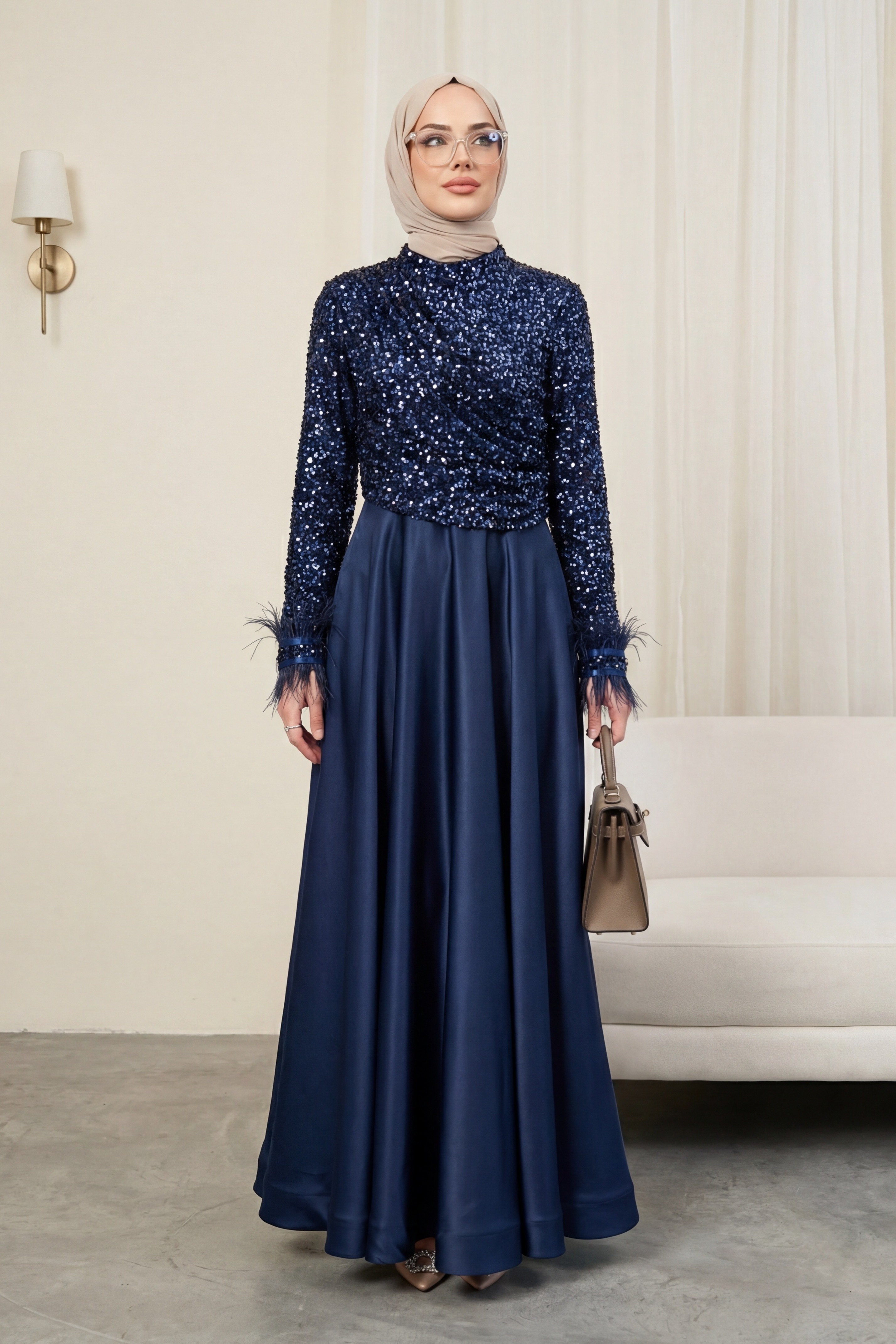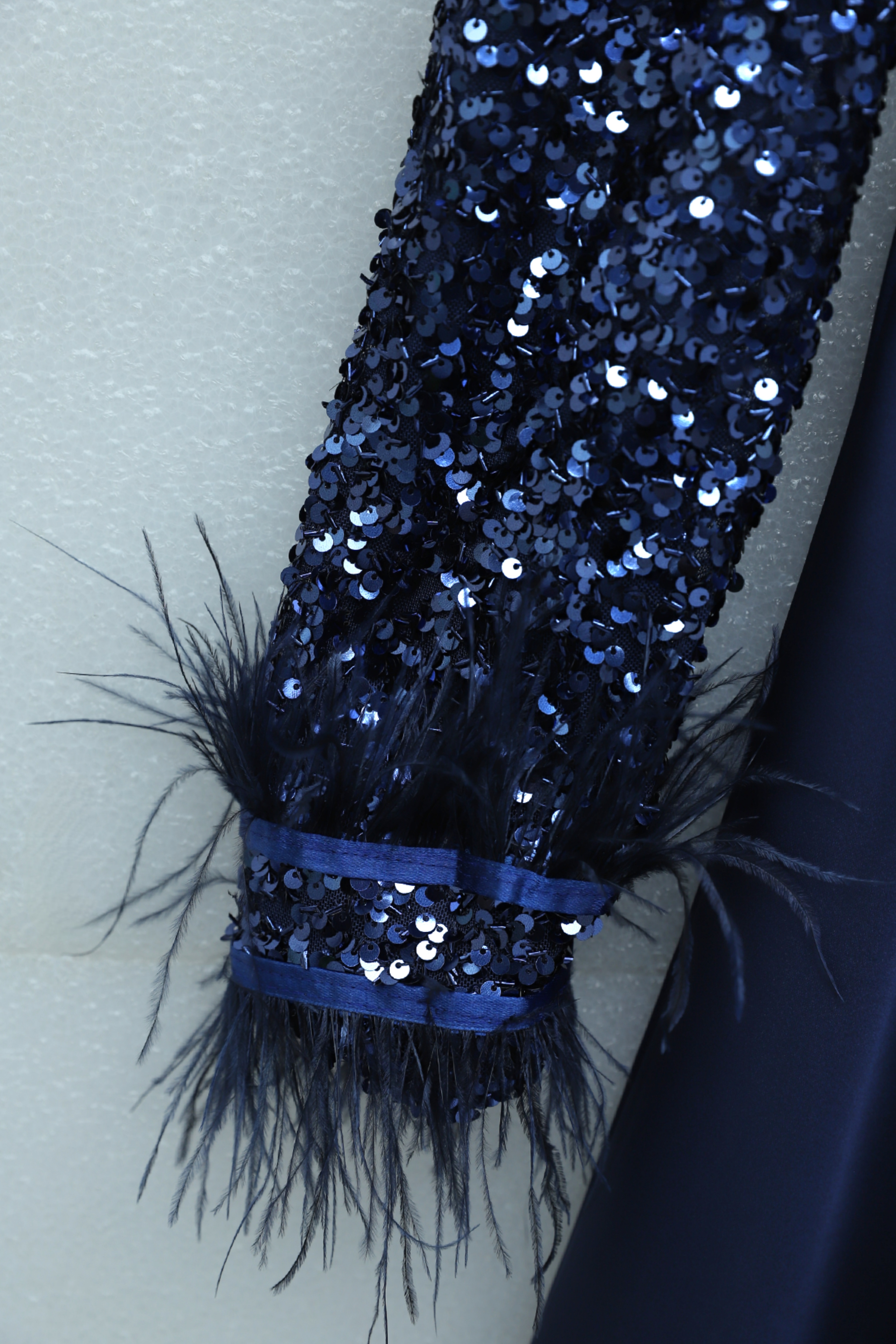 بلوزة مزينة بالترتر، وأكمام مزينة بالريش، وتنورة من الساتان، فستان سهرة -كحلي