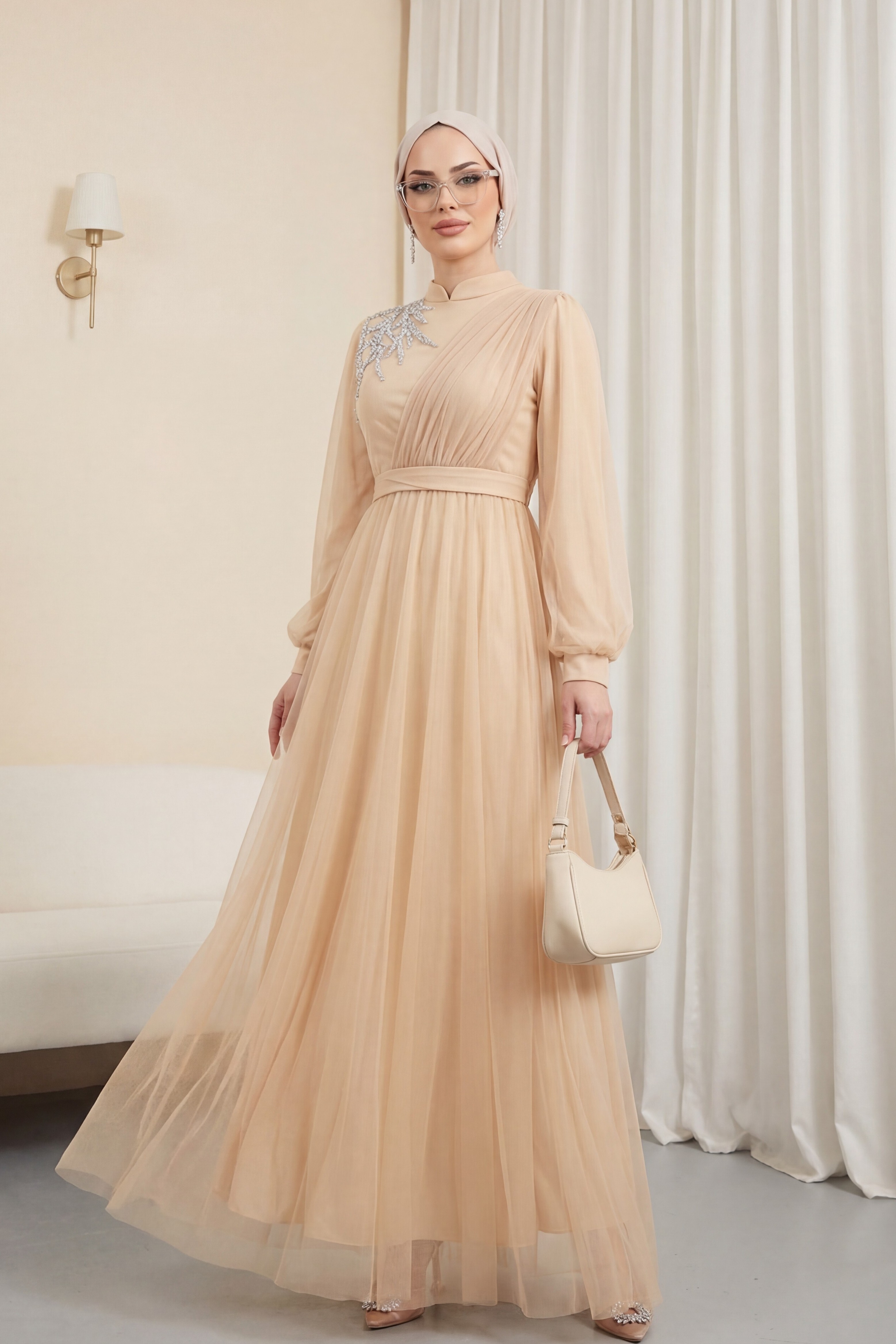 فستان سهرة من التول المُبطن بتفاصيل من الحجر من الأمام ، ومكسو بالرباط ، وياقة ، وحزام ، وسحاب على الظهر ، هو أحد أكثر القطع رواجًا في الموسم الجديد.