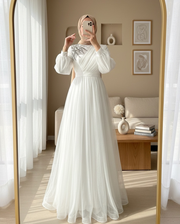 فستان سهرة من التول المُبطن بتفاصيل من الحجر من الأمام ، ومكسو بالرباط ، وياقة ، وحزام ، وسحاب على الظهر ، هو أحد أكثر القطع رواجًا في الموسم الجديد.
